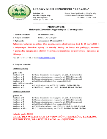 LUDOWY KLUB JEŹDZIECKI "ZABAJKA" Zabajka 358 36 - 060 Głogów Młp. woj. podkarpackie tel./fax (0-17) 851-77-11 Konto: Bank Spółdzielczy Głogów Młp. 85 9159 0000 2001 0009 9583 0001 NIP 813 - 11 - 00 - 203 PROPOZYCJE Halowych Zawodów Regionalnych i Towarzyskich 1. Termin zawodów: 19-20 marca 2016 r. 2. Miejsce zawodów: HALA LKJ "Zabajka" 3. Zgłoszenia: ostateczne do 17 marca 2016 r. Zgłoszenia wyłącznie na piśmie (fax, poczta, poczta elektroniczna, itp.) do 17 marca2016 r. z dołączonym dowodem wpłaty za zawody. Opłaty za boksy nie podlegają zwrotowi w przypadku rezygnacji ze startów w zawodach (niezależnie od przyczyny), zgłoszonej po 18 lutego . Fax: (0-17) 851-77-11, e-mail: [email protected] 4. Program zawodów: 19 marca (sobota) godz. 11.00 Konkurs nr 0 do 40cm dokładności bez rozgrywki art. 238.1.1 (towarzyski) Konkurs nr 1 do 60cm z natychmiastowa rozgrywką art. 238.2.2 (towarzyski) Konkurs nr 2 do 80cm z natychmiastowa rozgrywką art. 238.2.2(towarzyski) Konkurs nr 3 kl. L (100cm) dokładności bez rozgrywki 238.1.1 godz. 13.30 cd. zawodów Konkurs nr 4 kl. P (110cm) zwykły art.238.2.1 I –100zł , II-50zł, III- 50zł Konkurs nr 5 kl. N (120cm) ) zwykły art.238.2.1 I –100zł , II-50zł, III- 50zł 20 marca (niedziela) godz.10.30 Konkurs nr 0 Konkurs nr 6 Konkurs nr 7 Konkurs nr 8 Konkurs nr 9 Konkurs nr 10 - do 40cm dokładności bez rozgrywki art. 238.1.1 (towarzyski) do 60cm z natychmiastowa rozgrywką art. 238.2.2 (towarzyski) do 80cm z natychmiastowa rozgrywką art. 238.2.2(towarzyski) kl. L (100cm) dokładności bez rozgrywki 238.1.1 kl. P (110cm) dwufazowy art. 274.5.3. I- 100zł, II- 50zł, III- 50zł kl. N (120cm) dwufazowy art. 274.5.3 I- 100zł, II- 50zł, III- 50zł Sobota godz. 18.30 GRILL DLA WSZYSTKICH ZAWODNIKÓW, TRENERÓW, LUZAKÓW, SZEFÓW EKIP, WŁAŚCICIELI KONI oraz SĘDZIÓW 6. OPŁATY Opłaty za zawody: Zawodnik: 100 zł Koń: 50 zł Boksy dla koni gratis Boksy przygotowane 18 marca 2016 r., godz. 16.00. Wpłaty można przelać na konto Bank Spółdzielczy Głogów Młp. 85 9159 0000 2001 0009 9583 0001 Opłata organizacyjna musi być uregulowana na godzinę przed rozpoczęciem pierwszego konkursu. W przypadku nieuregulowania opłat, do startu nie zostanie dopuszczona cała ekipa. - cisza nocna w stajni od godz. 22.00 – 6.00 - prosimy o przestrzeganie przepisów BHP i p.poż. 7. Zakwaterowanie: Zawodnicy, szefowie ekip, trenerzy, luzacy – noclegi na własny koszt. Można dokonać rezerwacji w LKJ „Zabajka”: -stare domki 2- osobowe: cena 25 zł od osoby z własnymi śpiworami; -nowe domki 2-osobowe: cena 35 zł od osoby. -w 2 pokojach gościnnych po 45 zł/os. Wyżywienie: We własnym zakresie w GOSPODZIE WIŚTA WIO na terenie zawodów. 8. Warunki techniczne: zawody odbywać się będą w hali tor konkursowy, wymiary: 24 x 56 [m]– podłoże piaszczyste rozprężalnia, wymiary: 14 x 24 [m] – podłoże piaszczyste oraz teren otwarty 9. Klasyfikacja ogólna: - flots dla 25% startujących w konkursie, - po każdym konkursie odbędzie się dekoracja zwycięzców. 10. Zebranie techniczne: nie przewiduje się zebrania technicznego Sprawdzanie dokumentów koni i zawodników odbędzie się w biurze zawodów w dniu 19 marca 2016 r.(sobota) o godz. 8.00. 12. Osoby oficjalne: Komisja sędziowska: Przewodniczący : K. Bącal WZJ: Komisarz: III: Gospodarz toru: Ł.Śmietana B. Galuba D.Zakrzewska A. Galuba Lekarz weterynarii: dr Jacek Sołtyski, tel.: 500 049 955 13. Informacje ogólne: Odpowiedzialność: Organizatorzy nie ponoszą odpowiedzialności z tytułu wypadków i zachorowań trenerów, zawodników, luzaków i koni, jak również w przypadku kradzieży, zniszczeń, pożarów i innych wydarzeń wynikłych w czasie transportu i trwania zawodów. Organizacja zawodów: W nadzwyczajnych okolicznościach nieprzewidzianych przepisami, organizator zastrzega sobie prawo do odwołania zwodów. Ubezpieczenie: Przypominamy o obowiązkowym ubezpieczeniu NNW zawodników oraz aktualnych badaniach zawodników. Wstęp do stajni: Poza osobami oficjalnymi, prawo wstępu do stajni mają tylko: szefowie ekip, trenerzy, zawodnicy, luzacy, właściciele koni. 14. Listy startowe: Dokonanie zmian na listach startowych (po ich wywieszeniu) za zgodą Sędziego Głównego – 20 zł. 15. Protesty i skargi (art. 65 i art.66 Przepisów ogólnych PZJ) Każdy protest i skarga, ażeby były ważne, muszą być zgłoszone na piśmie z dołączeniem kaucji w wysokości 200 PLN. 16. Sprawy weterynaryjne Szczepienia ochronne przeciwko grypie koni. Obowiązuje następujący schemat szczepień: Szczepienie podstawowe ! pierwsze szczepienie – w dniu rozpoczęcia szczepień, ! drugie szczepienie – nie wcześniej niż 21- go dnia i nie później niż 92 dnia od pierwszego szczepienia, Szczepienie przypominające, ! co 6 miesięcy od ostatniego szczepienia(jest dopuszczalny 21 dniowy okres karencji), ! żadne szczepienie przypominające nie może się odbywać później niż na 7 dni przed przybyciem na zawody. Polski Związek Jeździecki prosi wszystkie osoby zaangażowane w jakikolwiek sposób w sporty konne, o przestrzeganie poniżej przedstawionego kodeksu oraz zasady, że dobro konia jest najważniejsze. Dobro konia musi być zawsze i wszędzie uwzględniane w sportach konnych i nie może być podporządkowane współzawodnictwu sportowemu ani innym celom np. komercyjnym. KODEKS POSTĘPOWANIA Z KONIEM I. Na wszystkich etapach treningu i przygotowań konia do startu w zawodach, dobro konia musi stać ponad wszelkimi innymi wymaganiami. Dotyczy to stałej opieki, metod treningu, starannego obrządku, kucia i transportu. II. Konie i jeźdźcy muszą być wytrenowani, kompetentni i zdrowi zanim wezmą udział w zawodach. Odnosi się to także do podawania leków środków medycznych, zabiegów chirurgicznych zagrażających dobru konia lub ciąży klaczy, oraz do przypadków nadużywania przemocy. III. Zawody nie mogą zagrażać dobru konia. Wymaga to zwró