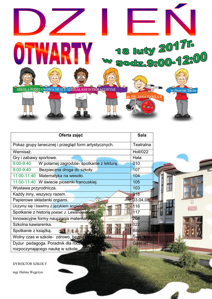 Oferta zajęć Sala Pokaz grupy tanecznej i przegląd form artystycznych. Teatralna Wernisaż. Gry i zabawy sportowe. 9:00-9:40 W polarnej zagrodzie- spotkanie z lekturą. 9:00-9:40 Bezpieczna droga do szkoły. 11:00-11:40 Matematyka na wesoło. 11:00-11:40 W świecie piosenki francuskiej. Wystawa przyrodnicza. Każdy inny, wszyscy razem. Papierowe składanki orgiami. Holl/022 Hala 010 107 104 105 103 018 03,04,08 116 117 204 022 Biblioteka Świetlica Gabinet Uczymy się i bawimy z językiem angielskim. Spotkanie z historią postać J. Lewandowskiej. Innowacyjne formy nauczania matematyki. Szkolna kawiarenka. Spotkanie z książką. Wolny czas w szkole- zdrowo, bezpiecznie i wesoło. Dyżur pedagoga. Poradnik dla rodzica dziecka rozpoczynającego naukę w szkole. DYREKTOR SZKOŁY mgr Halina Węgrzyn