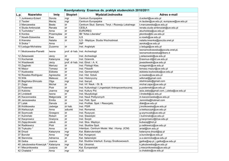 L.p. 1 2 3 4 5 6 7 8 9 10 Nazwisko Jurkiewicz-Eckert Tauber Marczewska Siuda-Ambroziak Tucholska * Kordos Nowik-Dziewicka Krenska Sroka * Ładyga-Michalska Imię Koordynatorzy Erasmus ds. praktyk studenckich 2010/2011 Stopień Wydział/Jednostka Dorota Maciej Beata Renata Anna Przemsyław Ewa Natalia Anna Zuzanna dr 11 Modrzewska-Pianetti Iwona prof. dr hab. Inst. Archeologii 12 13 14 15 16 17 18 19 20 21 22 23 24 25 26 27 28 29 30 31 32 33 34 35 36 37 38 39 40 41 42 Jerzy Katarzyna Jerzy Mariusz Tomasz ElŜbieta Agnieszka Mateusz Olga Michał Piotr Joanna Iwona Małgorzata Emilia Danuta Jadwiga Anna Grzegorz Robert GraŜyna Jakub Piotr Anna Katazryna Anna Adrianna Joanna Katarzyna Justyna Anna dr mgr prof. dr hab. dr dr dr dr dr mgr dr dr mgr dr dr dr dr dr hab. adiunkt dr dr dr dr dr dr mgr mgr dr dr mgr dr mgr śelazowski Kochaniak Wasilewski Zagórski Mazur Kozłowska Rosales-Rodriguez Wilk Bagińska-Shinzato Zając Podemski Kubicka Lindstedt Kaczorowska Jaroszewska Lalak Królikowska Kieliszczyk Szymczak Kulmiński Kacprowicz Zajączkowski Radkiewicz Trykozko * Drozd Buncler Siennicka Getka Jakubowska-Krawczyk * Miecznikowska Chałabiś * mgr mgr dr dr dr dr dr dr Centrum Europejskie Centrum Europejskie Centrum Stud. Samorz. Teryt. i Rozwoju Lokalnego CESLA EUROREG IBI "Artes Liberales" ILS ILS - Międzyw. Studia Wschodniosł. INP Inst. Anglistyki Inst. Archeologii Inst. Dziennik. Inst. Etnol. i A. K. Inst. Filologii Klas. Inst. Filozofii Inst. Germanistyki Inst. Hist. Sztuki Inst. Historyczny Inst. Iberyst. Inst. Inf. Nauk. i St. B. Inst. Kulturologii i Lingwistyki Antropocentrycznej Inst. Kultury Pol. Inst. Muzykologii Inst. Nauk Politycznych Inst. Polit. Społ. Inst. Profilak. Społ. I Resocjaliz. Inst. PSiR Inst. Romanist. Inst. Rusycyst. Inst. Slawistyki Inst. Socjol. Inst. Stos. Międzyn. Inst. Studiów Społ. Interdysc. Centrum Model. Mat. i Komp. (ICM) Kat. Białorutenistyki Kat. Hungaryst. Kat. Italianistyki Kat. Studiów Interkult. Europy Środkowowsch. Kat. Ukrainist. Kat. Europeistyki KJS Adres e-mail [email protected] [email protected], [email protected] [email protected] [email protected] [email protected] [email protected] [email protected] [email protected] [email protected] [email protected] [email protected], [email protected] [email protected] [email protected] [email protected] [email protected] [email protected] [email protected] [email protected] [email protected] [email protected] [email protected] [email protected] [email protected], [email protected] [email protected] [email protected] [email protected] [email protected] [email protected] [email protected] [email protected] [email protected] [email protected] [email protected] [email protected] [email protected] [email protected] [email protected] [email protected] [email protected], [email protected] [email protected] [email protected] [email protected] 43 44 45 46 47 48 49 50 51 52 53 54 55 56 57 Wilczek Borowy Recław Lesińska * Gryźlak Zielińska Romaniuk Wolski Drela Cyrański * Trippenbach Afelt Bąkowska Bojanowska-Jackowska Szyszko 58 śytko 59 60 61 62 63 64 65 Piotr Paulina Janusz Magdalena Aleksandra Magdalena Danuta Przemysław Nadzieja Michał Marek Aneta Anna Agnieszka Aleksandra prof. dr hab. Kol. MISH/ Kol. Artes Liberales MSOŚ mgr mgr Ośr. Badań n. Antykiem Europy Połud. - Wschod. dr Ośr. Badań n. Migracjami mgr Studium Europy Wsch. dr Środ. Lab. CięŜkich Jonów dr UKolegiumKNJAng. dr UKolegiumKNJNiem. prof. W. Biologii dr hab.. W. Chemii prof. dr hab.. W. Fizyki dr W. Geografii i S. R. dr W. Geologii dr hab. W. Matematyki, Inf. i Mech. dr W. Orientalistyczny Małgorzata dr hab. W. Pedagog. mgr mgr dr dr mgr mgr mgr W. Polonistyki W. Polonistyki W. Psychologii W. Zarządzania WDiNP WNE WPiA Czernow-Dreger Anna Lisicka-Karnauchow Małgorzata Radoszewska Joanna Dziewanowska Katarzyna Tomaszewska Monika Krysińska Diana Godlewska-Bujok Barbara * Ososba zgłoszona na rok 2009/2010 [email protected] [email protected] [email protected] [email protected] [email protected] [email protected] [email protected] [email protected] [email protected] [email protected] [email protected] [email protected] [email protected] [email protected] [email protected], [email protected] [email protected], [email protected] [email protected] [email protected] [email protected] [email protected] [email protected] [email protected] [email protected]; [email protected]