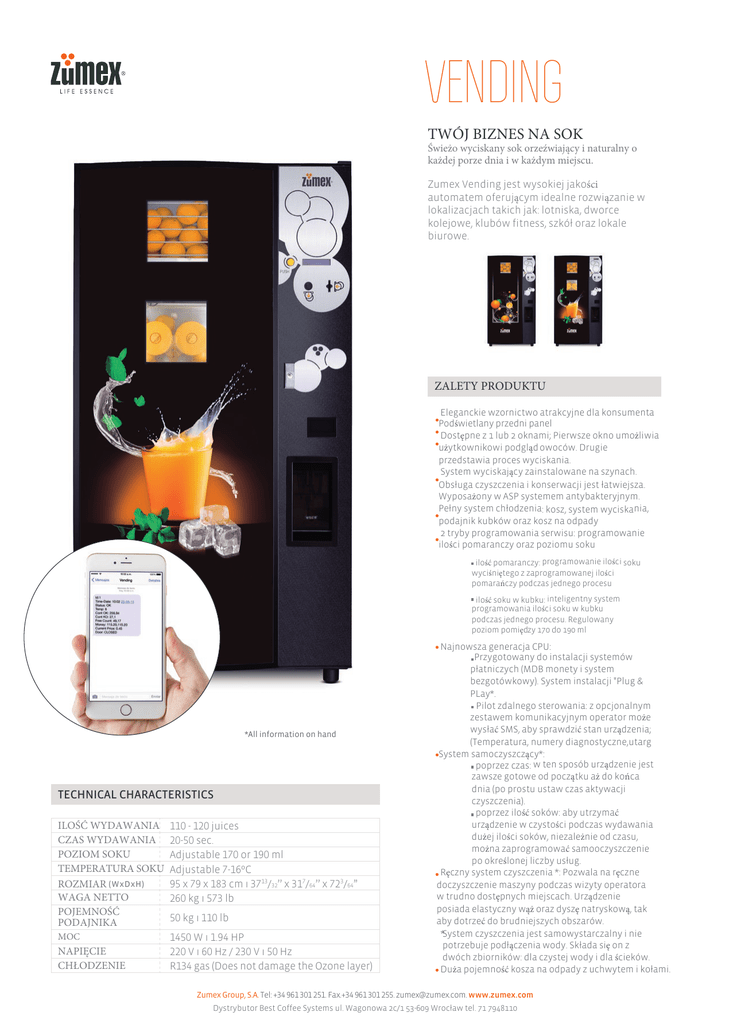 VENDING TWÓJ BIZNES NA SOK Świeżo wyciskany sok orzeźwiający i naturalny o każdej porze dnia i w każdym miejscu. Zumex Vending jest wysokiej jakości automatem oferującym idealne rozwiązanie w lokalizacjach takich jak: lotniska, dworce kolejowe, klubów fitness, szkół oraz lokale biurowe. ZALETY PRODUKTU Eleganckie wzornictwo atrakcyjne dla konsumenta Podświetlany przedni panel Dostępne z 1 lub 2 oknami; Pierwsze okno umożliwia użytkownikowi podgląd owoców. Drugie przedstawia proces wyciskania. System wyciskający zainstalowane na szynach. Obsługa czyszczenia i konserwacji jest łatwiejsza. Wyposażony w ASP systemem antybakteryjnym. Pełny system chłodzenia: kosz, system wyciskania, podajnik kubków oraz kosz na odpady 2 tryby programowania serwisu: programowanie ilości pomaranczy oraz poziomu soku ilość pomaranczy: programowanie ilości soku wyciśniętego z zaprogramowanej ilości pomarańczy podczas jednego procesu ilość soku w kubku: inteligentny system programowania ilości soku w kubku podczas jednego procesu. Regulowany poziom pomiędzy 170 do 190 ml *All information on hand TECHNICAL CHARACTERISTICS ILOŚĆ WYDAWANIA CZAS WYDAWANIA POZIOM SOKU TEMPERATURA SOKU ROZMIAR (WxDxH) WAGA NETTO POJEMNOŚĆ PODAJNIKA 110 - 120 juices 20-50 sec. Adjustable 170 or 190 ml Adjustable 7-16ºC 95 x 79 x 183 cm ı 3713/32’’ x 317/64’’ x 723/64” 260 kg ı 573 lb MOC 1450 W ı 1.94 HP 220 V ı 60 Hz / 230 V ı 50 Hz R134 gas (Does not damage the Ozone layer) NAPIĘCIE CHŁODZENIE 50 kg ı 110 lb Najnowsza generacja CPU: Przygotowany do instalacji systemów płatniczych (MDB monety i system bezgotówkowy). System instalacji "Plug & PLay*. Pilot zdalnego sterowania: z opcjonalnym zestawem komunikacyjnym operator może wysłać SMS, aby sprawdzić stan urządzenia; (Temperatura, numery diagnostyczne,utarg System samoczyszczący*: poprzez czas: w ten sposób urządzenie jest zawsze gotowe od początku aż do końca dnia (po prostu ustaw czas aktywacji czyszczenia). poprzez ilość soków: aby utrzymać urządzenie w czystości podczas wydawania dużej ilości soków, niezależnie od czasu, można zaprogramować samooczyszczenie po określonej liczby usług. Ręczny system czyszczenia *: Pozwala na ręczne doczyszczenie maszyny podczas wizyty operatora w trudno dostępnych miejscach. Urządzenie posiada elastyczny wąż oraz dyszę natryskową, tak aby dotrzeć do brudniejszych obszarów. *System czyszczenia jest samowystarczalny i nie potrzebuje podłączenia wody. Składa się on z dwóch zbiorników: dla czystej wody i dla ścieków. Duża pojemność kosza na odpady z uchwytem i kołami. Zumex Group, S.A. Tel: +34 961 301 251. Fax.+34 961 301 255. [email protected]. www.zumex.com Dystrybutor Best Coffee Systems ul. Wagonowa 2c/1 53-609 Wrocław tel. 71 7948110