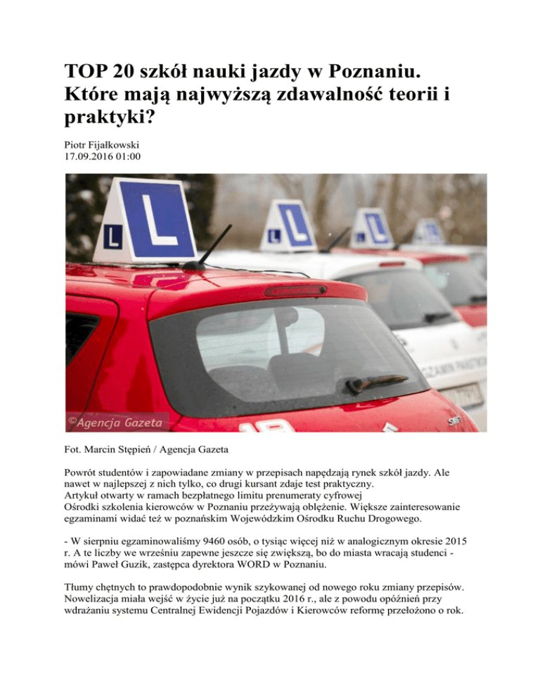 TOP 20 szkół nauki jazdy w Poznaniu. Które mają najwyższą zdawalność teorii i praktyki? Piotr Fijałkowski 17.09.2016 01:00 Fot. Marcin Stępień / Agencja Gazeta Powrót studentów i zapowiadane zmiany w przepisach napędzają rynek szkół jazdy. Ale nawet w najlepszej z nich tylko, co drugi kursant zdaje test praktyczny. Artykuł otwarty w ramach bezpłatnego limitu prenumeraty cyfrowej Ośrodki szkolenia kierowców w Poznaniu przeżywają oblężenie. Większe zainteresowanie egzaminami widać też w poznańskim Wojewódzkim Ośrodku Ruchu Drogowego. - W sierpniu egzaminowaliśmy 9460 osób, o tysiąc więcej niż w analogicznym okresie 2015 r. A te liczby we wrześniu zapewne jeszcze się zwiększą, bo do miasta wracają studenci mówi Paweł Guzik, zastępca dyrektora WORD w Poznaniu. Tłumy chętnych to prawdopodobnie wynik szykowanej od nowego roku zmiany przepisów. Nowelizacja miała wejść w życie już na początku 2016 r., ale z powodu opóźnień przy wdrażaniu systemu Centralnej Ewidencji Pojazdów i Kierowców reformę przełożono o rok. Od stycznia 2017 r. życie młodych kierowców będzie bardziej skomplikowane - przez dwa lata będą musieli jeździć wolniej niż inni kierowcy i łatwiej będzie im stracić prawko. W dodatku czekają ich dwa dodatkowe, obowiązkowe i płatne szkolenia - praktyczne i teoretyczne. Kurs prawa jazdy kat. B w Poznaniu to wydatek ok. 1200-1600 zł. Do tego trzeba doliczyć 170 zł za egzamin (30 zł teoria i 140 praktyka). Oznacza to, że wystarczy dwa razy oblać egzamin praktyczny, by różnica w cenie kursu się zwróciła. A to niestety reguła. W poznańskim ośrodku ruchu drogowego w ub. roku na ponad 52 tys. podejść do egzaminu praktycznego wynikiem pozytywnym zakończyło się zaledwie 30,5 proc. Połowa kandydatów na kierowców oblała na placu manewrowym, druga na mieście. Przyjrzeliśmy się wynikom za ub. rok poznańskich ośrodków szkolenia kierowców. Wybraliśmy te, których co najmniej 50 kursantów przystąpiło do egzaminu teoretycznego i praktycznego. Okazało się, że różnice między najlepszymi a najsłabszymi są ogromne. W tabelce publikujemy listę 20 najlepszych szkół pod względem zdawalności egzaminu praktycznego. Dane pochodzą z zestawienia publikowanego przez Urząd Miasta Poznania. Najlepszą szkołą jazdy w ub. roku był "KERB" Marta Misiewicz. To niewielka firma, która w 2015 r. przygotowała do egzaminu nieco ponad 60 osób. Z teorią poradziło sobie blisko dwie trzecie z nich, z praktyką niemal połowa. - Dobry wynik to efekt naszego podejścia, działamy jak szkoła, a nie firma. Jeżeli kandydat jest nieprzygotowany po kursie, trzeba mu to powiedzieć, a nie wysyłać na egzamin, bo wyjeździł przepisowe godziny. W naszej szkole przed końcem kursu kandydat wykonuje manewry takie jak na egzaminie. Jeżeli robi coś źle, jest o tym informowany. Ma więc pełny obraz swoich umiejętności - wyjaśnia Bartosz Czarnecki ze szkoły jazdy "KERB". Podchodzimy też poważnie do egzaminu wewnętrznego. Przeprowadzamy go na zasadach państwowych, więc osoba, który wychodzi z naszej szkoły, wie, z czym będzie musiała się mierzyć, gdy trafi do WORD-u - dodaje. Dobra opinia o szkole procentuje. Czarnecki przyznaje, że w tym roku zgłasza się do nich dużo więcej chętnych. Drugie miejsce w zestawieniu zajmuje "SPEED" Adam Kowalski. Tu zdawalność teorii to ponad 63 proc., a praktyki - blisko 46 proc. To jednocześnie jedna z większych i szybciej rozwijających się szkół w Poznaniu. W ub. roku do egzaminów na kat. B przystąpiło między 300 a 400 osób, które uczyły się jazdy w "SPEED-zie". Czołową trójkę zamyka szkoła "POZNAŃ" Ryszard Burzyński - teoria blisko 60 proc., praktyka - 44. Na drugim końcu stawki są szkoły, w których teorię zdaje co trzeci kursant, a praktykę zaledwie co piąty. 20 najlepszych szkół jazdy w Poznaniu Liczba kursantów (teoria) "KERB" Marta Misiewicz 62 "SPEED" Adam Kowalski 353 "POZNAŃ" Ryszard Burzyński 189 "ZAWODOWIEC" Agata Lustyk 91 "MUSTANG" Jerzy Mielcarek 266 "PIOTR ROSZAK" 68 "UNIWERSYTET JAZDY OGIŃSKI" Katarzyna Ogińska- 51 Molska "SZYBKIBILL" Marcin Cierniak 270 "O.S.K. ROMBA" Roman 135 Niezgoda "26" Tomasz Nitschke 96 "ARTUR" Artur Staniszewski 170 "O.S.K. FALLCON" Piotr 486 Skołuda "RED - CAR" Emilia Laskowska 95 "AUTODRIVE" Michał Bartczak 175 P.W. AWANS CENTRUM SZKOLENIOWE AWANS 149 Przemysław Witczak "NOVA - AUTOSZKOŁA" 104 Kowalczyk Bogusław "KARI" Halszka Jakobsze 174 "ZIEMKOWSKI LESZEK" 204 "AUTOSTRADA" Ewa 67 Stachowiak - Buczma "LENZNER ZBIGNIEW" 65 Szkoła Liczba Zdawalność kursantów teorii (praktyka) 65% 69 63% 420 60% 209 57% 106 58% 302 41% 58 Zdawalność praktyki 63% 69 42% 64% 535 41% 40% 133 40% 39% 60% 61 194 39% 39% 54% 537 38% 47% 63% 183 262 36% 35% 50% 133 35% 51% 136 35% 47% 45% 182 185 35% 35% 49% 107 35% 23% 73 34% 49% 46% 44% 44% 44% 43% Cały tekst: http://poznan.wyborcza.pl/poznan/1,36037,20704780,top-20-szkol-nauki-jazdy-wpoznaniu-ktore-maja-najwyzsza-zdawalnosc.html#ixzz4KjC5hY7v