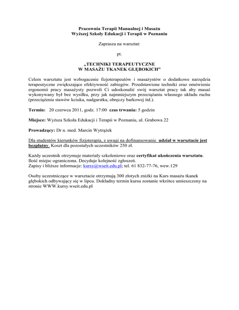 Pracownia Terapii Manualnej i Masażu Wyższej Szkoły Edukacji i Terapii w Poznaniu Zaprasza na warsztat: pt. „TECHNIKI TERAPEUTYCZNE W MASAŻU TKANEK GŁĘBOKICH” Celem warsztatu jest wzbogacenie fizjoterapeutów i masażystów o dodatkowe narzędzia terapeutyczne zwiększające efektywność zabiegów. Przedstawione techniki oraz omówienie ergonomii pracy masażysty pozwoli Ci udoskonalić swój warsztat pracy tak aby masaż wykonywany był bez wysiłku, przy jak najmniejszym przeciążaniu własnego układu ruchu (przeciążenia stawów kciuka, nadgarstka, obręczy barkowej itd.). Termin: 20 czerwca 2011, godz. 17:00 czas trwania: 5 godzin Miejsce: Wyższa Szkoła Edukacji i Terapii w Poznaniu, ul. Grabowa 22 Prowadzący: Dr n. med. Marcin Wytrążek Dla studentów kierunków fizjoterapia, z uwagi na dofinansowanie udział w warsztacie jest bezpłatny. Koszt dla pozostałych uczestników 250 zł. Każdy uczestnik otrzymuje materiały szkoleniowe oraz certyfikat ukończenia warsztatu. Ilość miejsc ograniczona. Decyduje kolejność zgłoszeń. Zapisy i bliższe informacje: [email protected]; tel. 61 832-77-76, wew.129 Osoby uczestniczące w warsztacie otrzymują 300 złotych zniżki na Kurs masażu tkanek głębokich odbywający się w lipcu. Dokładny termin kursu zostanie wkrótce umieszczony na stronie WWW.kursy.wseit.edu.pl