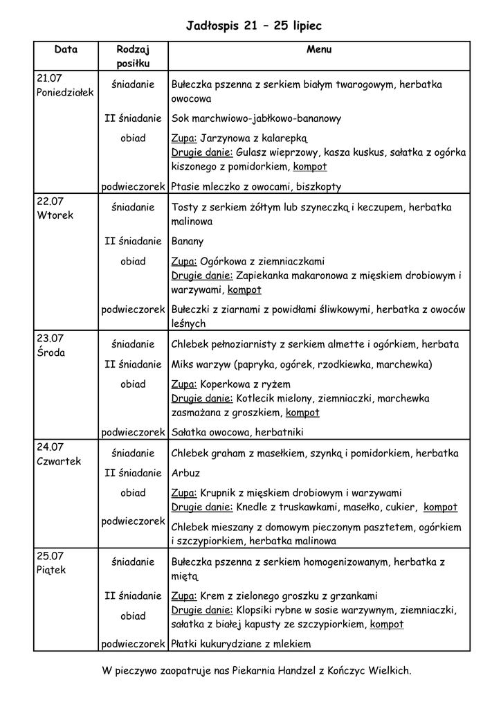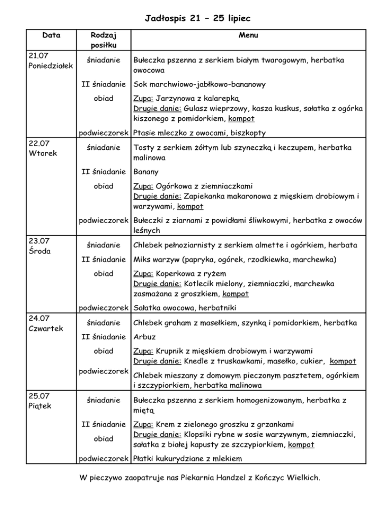 Jadłospis 21 – 25 lipiec Data 21.07 Poniedziałek Rodzaj posiłku śniadanie Menu Bułeczka pszenna z serkiem białym twarogowym, herbatka owocowa II śniadanie Sok marchwiowo-jabłkowo-bananowy obiad Zupa: Jarzynowa z kalarepką Drugie danie: Gulasz wieprzowy, kasza kuskus, sałatka z ogórka kiszonego z pomidorkiem, kompot podwieczorek Ptasie mleczko z owocami, biszkopty 22.07 Wtorek śniadanie Tosty z serkiem żółtym lub szyneczką i keczupem, herbatka malinowa II śniadanie Banany obiad Zupa: Ogórkowa z ziemniaczkami Drugie danie: Zapiekanka makaronowa z mięskiem drobiowym i warzywami, kompot podwieczorek Bułeczki z ziarnami z powidłami śliwkowymi, herbatka z owoców leśnych 23.07 Środa śniadanie Chlebek pełnoziarnisty z serkiem almette i ogórkiem, herbata II śniadanie Miks warzyw (papryka, ogórek, rzodkiewka, marchewka) obiad Zupa: Koperkowa z ryżem Drugie danie: Kotlecik mielony, ziemniaczki, marchewka zasmażana z groszkiem, kompot podwieczorek Sałatka owocowa, herbatniki 24.07 Czwartek śniadanie II śniadanie Arbuz obiad podwieczorek 25.07 Piątek Chlebek graham z masełkiem, szynką i pomidorkiem, herbatka śniadanie Zupa: Krupnik z mięskiem drobiowym i warzywami Drugie danie: Knedle z truskawkami, masełko, cukier, kompot Chlebek mieszany z domowym pieczonym pasztetem, ogórkiem i szczypiorkiem, herbatka malinowa Bułeczka pszenna z serkiem homogenizowanym, herbatka z miętą II śniadanie Zupa: Krem z zielonego groszku z grzankami Drugie danie: Klopsiki rybne w sosie warzywnym, ziemniaczki, obiad sałatka z białej kapusty ze szczypiorkiem, kompot podwieczorek Płatki kukurydziane z mlekiem W pieczywo zaopatruje nas Piekarnia Handzel z Kończyc Wielkich.