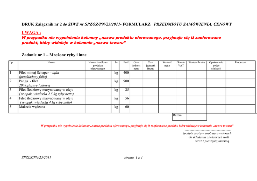 DRUK Załącznik nr 2 do SIWZ nr SPZOZ/PN/25/2011- FORMULARZ PRZEDMIOTU ZAMÓWIENIA, CENOWY UWAGA : W przypadku nie wypełnienia kolumny ,,nazwa produktu oferowanego, przyjmuje się iż zaoferowano produkt, który widnieje w kolumnie „nazwa towaru” Zadanie nr 1 – Mrożone ryby i inne Lp 1 2 3 4 5 Nazwa Filet mintaj Schaper – tafla (przekładany folią) Panga - filet 20% glazury lodowej Filet śledziowy marynowany w oleju ( w opak. wiaderka 2,5 kg ryby netto) Filet śledziowy marynowany w oleju ( w opak. wiaderka 4 kg ryby netto) Makrela wędzona Nazwa handlowa produktu oferowanego Jm Ilość kg 400 kg 900 kg 25 kg 56 kg 60 Cena jednost netto Cena jednostk Brutto Wartość netto Stawka VAT Wartość brutto Opakowanie podać wielkość Razem: W przypadku nie wypełnienia kolumny ,,nazwa produktu oferowanego, przyjmuje się iż zaoferowano produkt, który widnieje w kolumnie „nazwa towaru” ........................................................ (podpis osoby – osób uprawnionych do składania oświadczeń woli wraz z pieczątką imienną SPZOZ/PN/25/2011 strona 1 z 4 Producent Zadanie nr 2 – Mrożonki - warzywa, owoce Lp 1 2 3 4 5 6 7 8 9 10 11 12 Nazwa Brokuły mrożone (op. detal) Brukselka mrożona (op. detal) Fasolka szparagowa, mrożona (op. hurt) Kalafior mrożony (op. hurt.) Kluski śląskie (op. detal) Knedle z nadzieniem truskawkowym (op. detal) Marchew mrożona (op. hurt) Mieszanka kompotowa – 6 składnikowa - (op. hurt) Mieszanka warzywna – 7 składnikowa - (op. hurt) Pyzy z mięsem (op. detal) Szpinak mrożony (op. detal) Truskawka mrożona (op. hurt) SPZOZ/PN/25/2011 Nazwa handlowa produktu oferowanego Jm Ilość Kg 50 Kg 20 Kg 300 kg 150 kg 300 kg 400 kg 80 Cena jednost netto kg 1 200 kg 900 kg 200 kg 500 kg 200 strona 2 z 4 Cena jednostk Brutto Wartość netto Stawka VAT Wartość brutto Opakowanie podać wielkość Producent 13 14 15 16 17 Groszek mrożony (op. detal) Papryka 3 – kolorowa mrożona (op. detal) Mieszanaka ,, Meksykańska” (op. detal) Hamburgery wołowo – wieprzowe – (op. detal) Bułki do hamburgerów kg 40 kg 20 kg 20 kg 3 szt 30 Razem: W przypadku nie wypełnienia kolumny ,,nazwa produktu oferowanego, przyjmuje się iż zaoferowano produkt, który widnieje w kolumnie „nazwa towaru” ..................................................... (podpis osoby – osób uprawnionych do składania oświadczeń woli wraz z pieczątką imienną) SPZOZ/PN/25/2011 strona 3 z 4 Zadanie nr 3 – Drób i podroby mrożone Lp Nazwa Nazwa handlowa produktu oferowanego Jm Ilość 1 Kurczak mrożony (luzem) kg 220 2 Udka z kurczaka mrożone (op. detal) Filety drobiowe, mrożone (op. detal) Wątroba drobiowa z kurczaka mrożona (op. detal) Żołądki indycze , mrożone kg 100 kg 40 kg 50 kg 10 Flaki krojone mrożone (op. detal) kg 120 3 4 5 6 Cena jednost netto Cena jednostk Brutto Wartość netto Stawka VAT Wartość brutto Opakowanie podać wielkość R-m: W przypadku nie wypełnienia kolumny ,,nazwa produktu oferowanego, przyjmuje się iż zaoferowano produkt, który widnieje w kolumnie „nazwa towaru” ........................................................ (podpis osoby – osób uprawnionych do składania oświadczeń woli wraz z pieczątką imienną SPZOZ/PN/25/2011 strona 4 z 4 Producent