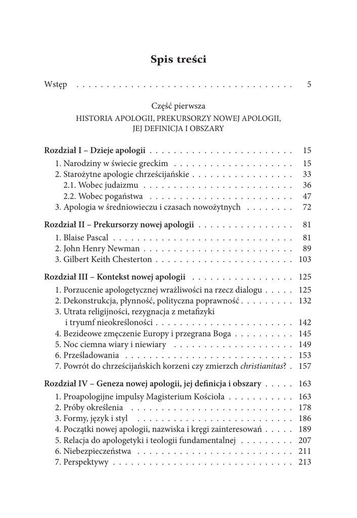 Spis treści Wstęp . . . . . . . . . . . . . . . . . . . . . . . . . . . . . . . . . . . . 5 Część pierwsza HISTORIA APOLOGII, PREKURSORZY NOWEJ APOLOGII, JEJ DEFINICJA I OBSZARY Rozdział I – Dzieje apologii . . . . . . . . . . . . . . . . . . . . . . . . 1. Narodziny w świecie greckim . . . . . . . . . . . . . . . . . . . . . 2. Starożytne apologie chrześcijańskie . . . . . . . . . . . . . . . . . . 2.1. Wobec judaizmu . . . . . . . . . . . . . . . . . . . . . . . . . . 2.2. Wobec pogaństwa . . . . . . . . . . . . . . . . . . . . . . . . . 3. Apologia w średniowieczu i czasach nowożytnych . . . . . . . . . 15 15 33 36 47 72 Rozdział II – Prekursorzy nowej apologii . . . . . . . . . . . . . . . . . 81 1. Blaise Pascal . . . . . . . . . . . . . . . . . . . . . . . . . . . . . . . 81 2. John Henry Newman . . . . . . . . . . . . . . . . . . . . . . . . . 89 3. Gilbert Keith Chesterton . . . . . . . . . . . . . . . . . . . . . . . . 103 Rozdział III – Kontekst nowej apologii . . . . . . . . . . . . . . . . . . 125 1. Porzucenie apologetycznej wrażliwości na rzecz dialogu . . . . . 125 2. Dekonstrukcja, płynność, polityczna poprawność . . . . . . . . . 132 3. Utrata religijności, rezygnacja z metafizyki i tryumf nieokreśloności . . . . . . . . . . . . . . . . . . . . . . . 142 4. Bezideowe zmęczenie Europy i przegrana Boga . . . . . . . . . . . 145 5. Noc ciemna wiary i niewiary . . . . . . . . . . . . . . . . . . . . . 149 6. Prześladowania . . . . . . . . . . . . . . . . . . . . . . . . . . . . . 153 7. Powrót do chrześcijańskich korzeni czy zmierzch christianitas? . 157 Rozdział IV – Geneza nowej apologii, jej definicja i obszary . . . . . . 163 1. Proapologijne impulsy Magisterium Kościoła . . . . . . . . . . . . 163 2. Próby określenia . . . . . . . . . . . . . . . . . . . . . . . . . . . . 178 3. Formy, język i styl . . . . . . . . . . . . . . . . . . . . . . . . . . . 186 4. Początki nowej apologii, nazwiska i kręgi zainteresowań . . . . . 189 5. Relacja do apologetyki i teologii fundamentalnej . . . . . . . . . . 207 6. Niebezpieczeństwa . . . . . . . . . . . . . . . . . . . . . . . . . . . 211 7. Perspektywy . . . . . . . . . . . . . . . . . . . . . . . . . . . . . . . 213 581 Spis treści Część druga OBSZARY ZAINTERESOWAŃ NOWEJ APOLOGII Rozdział I – Apologia tożsamości człowieka . . . . . . . . . . . . . . . 219 1. Apologia historycznej pamięci . . . . . . . . . . . . . . . . . . . . 220 1.1. Intuicja Sokratesa . . . . . . . . . . . . . . . . . . . . . . . . . 220 1.2. Modernizacja jako niepamięć . . . . . . . . . . . . . . . . . . 225 1.3. Ku podmiotowości dojrzałej . . . . . . . . . . . . . . . . . . . 234 2. Apologia odpowiedzialności w świecie pełnym dwuznaczności . 240 2.1. Cień nierozliczonej przeszłości . . . . . . . . . . . . . . . . . . 242 2.2. Przeciw pozorom demokracji . . . . . . . . . . . . . . . . . . . 247 2.3. Bezdroża ponowoczesnej Europy . . . . . . . . . . . . . . . . . 256 2.4. Idee w działaniu . . . . . . . . . . . . . . . . . . . . . . . . . . 263 3. Apologia życia wobec cywilizacji śmierci . . . . . . . . . . . . . . 268 3.1. Filozoficzno-teologiczne podstawy życia ludzkiego . . . . . . 270 3.2. Przeciwko przemysłowi śmierci . . . . . . . . . . . . . . . . . 281 3.3. Wobec spisku mediów . . . . . . . . . . . . . . . . . . . . . . 296 4. Apologia kultury jako ukazywanie drugiej przestrzeni . . . . . . . 301 4.1. Dziedzictwo wyrazistych autorytetów . . . . . . . . . . . . . . 305 4.2. Przeciw salonowym modernizatorom . . . . . . . . . . . . . . 308 4.3. Droga do wnętrza . . . . . . . . . . . . . . . . . . . . . . . . . 311 Rozdział II – Apologia obecności chrześcijaństwa w świecie . . . . . . 321 1. Apologia chrześcijańskiej duszy . . . . . . . . . . . . . . . . . . . 322 1.1. Zredukowana antropologia . . . . . . . . . . . . . . . . . . . . 324 1.2. Znaki wiarygodności chrześcijaństwa . . . . . . . . . . . . . . 337 2. Apologia katolicyzmu ewangelicznego . . . . . . . . . . . . . . . . 345 2.1. W poszukiwaniu głębi chrześcijaństwa . . . . . . . . . . . . . 347 2.2. Ewangeliczna odnowa Kościoła . . . . . . . . . . . . . . . . . 353 2.3. Wobec chrystofobii i dżihadyzmu . . . . . . . . . . . . . . . . 361 3. Apologia wiary w przestrzeni publicznej . . . . . . . . . . . . . . 376 3.1. Europa – od średniowiecznej christianitas do społeczeństwa otwartego . . . . . . . . . . . . . . . . . . . 376 3.2. Chrześcijaństwo w optyce ponowoczesności . . . . . . . . . . 384 582 Renesans apologii Rozdział III – Apologia Jezusa Chrystusa . . . . . . . . . . . . . . . . 400 1. Argumentacja archeologiczna . . . . . . . . . . . . . . . . . . . . . 401 2. Argumentacja duchowa . . . . . . . . . . . . . . . . . . . . . . . . 421 3. Argumentacja antyideologiczna . . . . . . . . . . . . . . . . . . . 438 4. Argumentacja historyczno-teologiczna . . . . . . . . . . . . . . . 477 Zakończenie – wnioski . . . . . . . . . . . . . . . . . . . . . . . . . . . . 542 Bibliografia . . . . . . . . . . . . . . . . . . . . . . . . . . . . . . . . . . . 549
