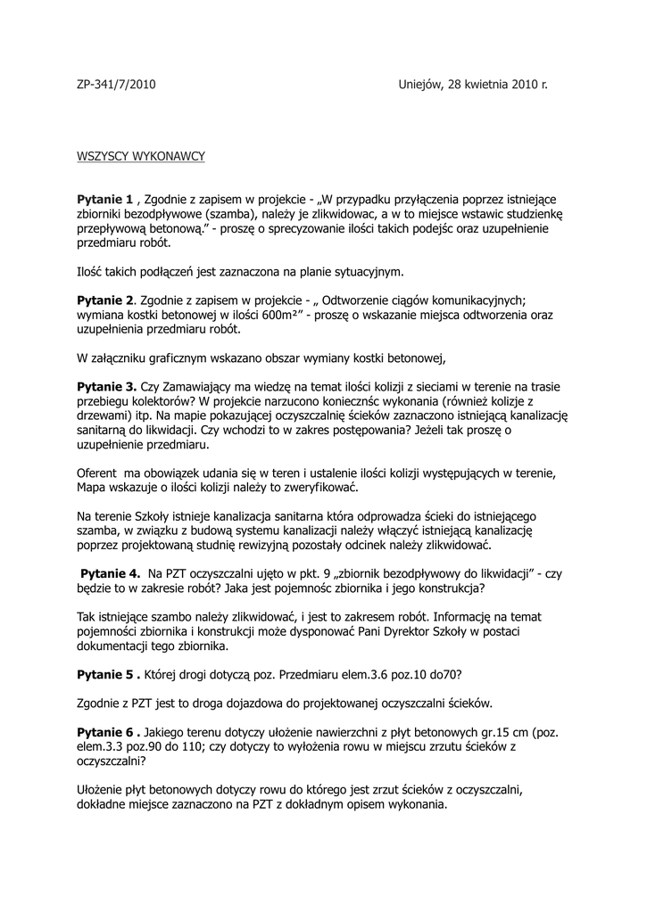 ZP-341/7/2010 Uniejów, 28 kwietnia 2010 r. WSZYSCY WYKONAWCY Pytanie 1 , Zgodnie z zapisem w projekcie - „W przypadku przyłączenia poprzez istniejące zbiorniki bezodpływowe (szamba), należy je zlikwidowac, a w to miejsce wstawic studzienkę przepływową betonową.” - proszę o sprecyzowanie ilości takich podejśc oraz uzupełnienie przedmiaru robót. Ilość takich podłączeń jest zaznaczona na planie sytuacyjnym. Pytanie 2. Zgodnie z zapisem w projekcie - „ Odtworzenie ciągów komunikacyjnych; wymiana kostki betonowej w ilości 600m²” - proszę o wskazanie miejsca odtworzenia oraz uzupełnienia przedmiaru robót. W załączniku graficznym wskazano obszar wymiany kostki betonowej, Pytanie 3. Czy Zamawiający ma wiedzę na temat ilości kolizji z sieciami w terenie na trasie przebiegu kolektorów? W projekcie narzucono koniecznśc wykonania (również kolizje z drzewami) itp. Na mapie pokazującej oczyszczalnię ścieków zaznaczono istniejącą kanalizację sanitarną do likwidacji. Czy wchodzi to w zakres postępowania? Jeżeli tak proszę o uzupełnienie przedmiaru. Oferent ma obowiązek udania się w teren i ustalenie ilości kolizji występujących w terenie, Mapa wskazuje o ilości kolizji należy to zweryfikować. Na terenie Szkoły istnieje kanalizacja sanitarna która odprowadza ścieki do istniejącego szamba, w związku z budową systemu kanalizacji należy włączyć istniejącą kanalizację poprzez projektowaną studnię rewizyjną pozostały odcinek należy zlikwidować. Pytanie 4. Na PZT oczyszczalni ujęto w pkt. 9 „zbiornik bezodpływowy do likwidacji” - czy będzie to w zakresie robót? Jaka jest pojemnośc zbiornika i jego konstrukcja? Tak istniejące szambo należy zlikwidować, i jest to zakresem robót. Informację na temat pojemności zbiornika i konstrukcji może dysponować Pani Dyrektor Szkoły w postaci dokumentacji tego zbiornika. Pytanie 5 . Której drogi dotyczą poz. Przedmiaru elem.3.6 poz.10 do70? Zgodnie z PZT jest to droga dojazdowa do projektowanej oczyszczalni ścieków. Pytanie 6 . Jakiego terenu dotyczy ułożenie nawierzchni z płyt betonowych gr.15 cm (poz. elem.3.3 poz.90 do 110; czy dotyczy to wyłożenia rowu w miejscu zrzutu ścieków z oczyszczalni? Ułożenie płyt betonowych dotyczy rowu do którego jest zrzut ścieków z oczyszczalni, dokładne miejsce zaznaczono na PZT z dokładnym opisem wykonania. Ptyanie 7. Czy Zamawiający dopuszcza możliwość zmiany technologii oczyszczalni ścieków Bio Clere na inna technologię posiadającą certyfikat CE, wyższe parametry oczyszczania ścieków, podobną budowę (polipropylen) oraz spełnia wysokie normy UE dotyczące czystości ścieków przy wyjściu z oczyszczalni? Zgodnie z art. 30 ust. 4 i 5 Prawa zamówień publicznych Zamawiający dopuszcza możliwość stosowania rozwiązań materiałowo-sprzętowych równoważnych pod warunkiem: a) spełnienia wszystkich wymagań określonych w projekcie budowlanym, SST i SIWZ. b) uzyskania pisemnej zgody proponowanych zmian od Projektanta i Zamawiającego. c) ich cechy techniczne i użytkowe będą co najmniej takie same jak przewidziane w projekcie tj. jeśli chodzi o oczyszczalnię w szczególności: a.. technologia oczyszczania biologicznego oparta o zraszane złoże biologiczne (Zamawiający nie przewiduje zamiany technologii), b.. obudowa reaktora wykonana z materiałów odpornych na korozję (tworzywo sztuczne lub stal nierdzewna) oraz wpływ warunków atmosferycznych (konstrukcja ocieplona), c.. wszystkie elementy metalowe wykonane ze stali nierdzewnej, d.. emisja hałasu poniżej 50 dBA, e.. reaktory zamknięte – brak emisji aerozoli, f.. system recyrkulacji wewnętrznej ścieków dopływających do złoża biologicznego oraz recyrkulacji zewnętrznej ścieków oczyszczonych, g.. brak konieczności stosowania dmuchaw do napowietrzania ścieków, h.. zużycie energii elektrycznej proponowanych urządzeń oczyszczalni nie może być większe niż 24 kWh/d. d) obowiązek wykazania równoważności zastosowanych w ofercie rozwiązań materiałowosprzętowych obciąża w całości Wykonawcę. W w/w postępowaniu obowiązuje cena ryczałtowa, Cena ryczałtowa to cena ustalona za całość zamówienia, na podstawie dokumentacji projektowej, a przedmiary mają znaczenie pomocnicze. Nawet gdy kosztorys szczegółowy nie wymienia niektórych robót, to nie można uznać, że wykonawca złożył ofertę niezgodną ze specyfikacją. Zatem podana w ofercie cena ryczałtowa wcale nie musi stanowić ceny wynikającej z sumowania kosztorysów szczegółowych.