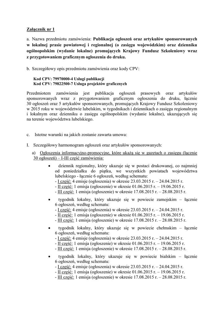 Załącznik nr 1 a. Nazwa przedmiotu zamówienia: Publikacja ogłoszeń oraz artykułów sponsorowanych w lokalnej prasie powiatowej i regionalnej (o zasięgu wojewódzkim) oraz dzienniku ogólnopolskim (wydanie lokalne) promujących Krajowy Fundusz Szkoleniowy wraz z przygotowaniem graficznym ogłoszenia do druku. b. Szczegółowy opis przedmiotu zamówienia oraz kody CPV: Kod CPV: 79970000-4 Usługi publikacji Kod CPV: 79822500-7 Usługa projektów graficznych Przedmiotem zamówienia jest publikacja ogłoszeń prasowych oraz artykułów sponsorowanych wraz z przygotowaniem graficznym ogłoszenia do druku, łącznie 30 ogłoszeń oraz 5 artykułów sponsorowanych, promujących Krajowy Fundusz Szkoleniowy w 2015 roku w województwie lubelskim, w tygodnikach i dziennikach o zasięgu regionalnym i lokalnym oraz dzienniku o zasięgu ogólnopolskim (wydanie lokalne), ukazujących się na terenie województwa lubelskiego. c. Istotne warunki na jakich zostanie zawarta umowa: I. Szczegółowy harmonogram ogłoszeń oraz artykułów sponsorowanych: a) Ogłoszenia informacyjno-promocyjne, które ukażą się w gazetach o zasięgu (łącznie 30 ogłoszeń) – I-III część zamówienia: dziennik regionalny, który ukazuje się w postaci drukowanej, co najmniej od poniedziałku do piątku, we wszystkich powiatach województwa lubelskiego - łącznie 6 ogłoszeń, według schematu: - I część: 4 emisje (ogłoszenia) w okresie 23.03.2015 r. – 24.04.2015 r. - II część: 1 emisja (ogłoszenie) w okresie 01.06.2015 r. – 19.06.2015 r. - III część: 1 emisja (ogłoszenie) w okresie 17.08.2015 r. – 28.08.2015 r. tygodnik lokalny, który ukazuje się w powiecie zamojskim – łącznie 6 ogłoszeń, według schematu: - I część: 4 emisje (ogłoszenia) w okresie 23.03.2015 r. – 24.04.2015 r. - II część: 1 emisja (ogłoszenie) w okresie 01.06.2015 r. – 19.06.2015 r. - III część: 1 emisja (ogłoszenie) w okresie 17.08.2015 r. – 28.08.2015 r. tygodnik lokalny, który ukazuje się w powiecie chełmskim – łącznie 6 ogłoszeń, według schematu: - I część: 4 emisje (ogłoszenia) w okresie 23.03.2015 r. – 24.04.2015 r. - II część: 1 emisja (ogłoszenie) w okresie 01.06.2015 r. – 19.06.2015 r. - III część: 1 emisja (ogłoszenie) w okresie 17.08.2015 r. – 28.08.2015 r. tygodnik lokalny, który ukazuje się w powiecie bialskim – łącznie 6 ogłoszeń, według schematu: - I część: 4 emisje (ogłoszenia) w okresie 23.03.2015 r. – 24.04.2015 r. - II część: 1 emisja (ogłoszenie) w okresie 01.06.2015 r. – 19.06.2015 r. - III część: 1 emisja (ogłoszenie) w okresie 17.08.2015 r. – 28.08.2015 r. dziennik ogólnopolski (z lubelskim wydaniem lokalnym), który ukazuje się w postaci drukowanej, co najmniej od poniedziałku do piątku we wszystkich powiatach województwa lubelskiego – łącznie 6 ogłoszeń, według schematu: - I część: 4 emisje (ogłoszenia) w okresie 23.03.2015 r. – 24.04.2015 r. - II część: 1 emisja (ogłoszenie) w okresie 01.06.2015 r. – 19.06.2015 r. - III część: 1 emisja (ogłoszenie) w okresie 17.08.2015 r. – 28.08.2015 r. b) Artykuły sponsorowane, które ukażą się w gazetach o zasięgu (łącznie 5 artykułów sponsorowanych) – IV część zamówienia: dziennik regionalny, który ukazuje się w postaci drukowanej, co najmniej od poniedziałku do piątku, we wszystkich powiatach województwa lubelskiego - łącznie 1 artykuł sponsorowany, według schematu: - 1 emisja (artykuł sponsorowany) w II półroczu 2015 roku, w terminie wskazanym przez Zamawiającego (co najmniej tydzień przed planowaną emisją); w przypadku braku możliwości druku w terminie wskazanym przez Zamawiającego Wykonawca zaproponuje termin alternatywny, który będzie wymagał pisemnej akceptacji Zamawiającego; tygodnik lokalny, który ukazuje się w powiecie zamojskim – łącznie 1 artykuł sponsorowany, według schematu; - 1 emisja (artykuł sponsorowany) w II półroczu 2015 roku, w terminie wskazanym przez Zamawiającego (co najmniej tydzień przed planowaną emisją); w przypadku braku możliwości druku w terminie wskazanym przez Zamawiającego Wykonawca zaproponuje termin alternatywny, który będzie wymagał pisemnej akceptacji Zamawiającego; tygodnik lokalny, który ukazuje się w powiecie chełmskim – łącznie 1 artykuł sponsorowany, według schematu: - 1 emisja (artykuł sponsorowany) w II półroczu 2015 roku, w terminie wskazanym przez Zamawiającego (co najmniej tydzień przed planowaną emisją); w przypadku braku możliwości druku w terminie wskazanym przez Zamawiającego Wykonawca zaproponuje termin alternatywny, który będzie wymagał pisemnej akceptacji Zamawiającego; tygodnik lokalny, który ukazuje się w powiecie bialskim – łącznie 1 artykuł sponsorowany, według schematu: - 1 emisja (artykuł sponsorowany) w II półroczu 2015 roku, w terminie wskazanym przez Zamawiającego (co najmniej tydzień przed planowaną emisją); w przypadku braku możliwości druku w terminie wskazanym przez Zamawiającego Wykonawca zaproponuje termin alternatywny, który będzie wymagał pisemnej akceptacji Zamawiającego; dziennik ogólnopolski (z lubelskim wydaniem lokalnym), który ukazuje się w postaci drukowanej, co najmniej od poniedziałku do piątku we wszystkich powiatach województwa lubelskiego – łącznie 1 artykuł sponsorowany, według schematu: - 1 emisja (artykuł sponsorowany) w II półroczu 2015 roku, w terminie wskazanym przez Zamawiającego (co najmniej tydzień przed planowaną emisją); w przypadku braku możliwości druku w terminie wskazanym przez Zamawiającego Wykonawca zaproponuje termin alternatywny, który będzie wymagał pisemnej akceptacji Zamawiającego; II. Dziennik regionalny oraz tygodnik lokalny, a także dziennik ogólnopolski (z wydaniem lokalnym), w których będą ukazywały się ogłoszenia oraz artykuły sponsorowane, musi ukazywać się w postaci drukowanej. III. Ogłoszenia oraz art