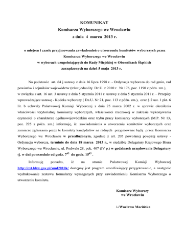 KOMUNIKAT Komisarza Wyborczego we Wrocławiu z dnia 4 marca 2013 r. o miejscu i czasie przyjmowania zawiadomień o utworzeniu komitetów wyborczych przez Komisarza Wyborczego we Wrocławiu w wyborach uzupełniających do Rady Miejskiej w Obornikach Śląskich zarządzonych na dzień 5 maja 2013 r. Na podstawie art. 64 j ustawy z dnia 16 lipca 1998 r. - Ordynacja wyborcza do rad gmin, rad powiatów i sejmików województw (tekst jednolity Dz.U. z 2010 r. Nr 176, poz. 1190 z późn. zm.), w związku z art. 16 ust. 3 ustawy z dnia 5 stycznia 2011 r. ustawy z dnia 5 stycznia 2011 r. – Przepisy wprowadzające ustawę - Kodeks wyborczy ( Dz.U. Nr 21, poz. 113 z późn. zm.), oraz § 2 ust. 1 pkt. 6 lit. b uchwały Państwowej Komisji Wyborczej z dnia 25 marca 2002 r. w sprawie określenia właściwości terytorialnej komisarzy wyborczych, właściwości rzeczowej w zakresie wykonywania czynności o charakterze ogólnowojewódzkim oraz trybu pracy komisarzy wyborczych (M.P. Nr 13, poz. 225 z późn. zm.) informuję, iŜ zawiadomienia o utworzeniu komitetów wyborczych oraz zamiarze zgłaszania przez te komitety kandydatów na radnych przyjmowane będą przez Komisarza Wyborczego we Wrocławiu w przedłuŜonym, zgodnie z art. 205 powołanej powyŜej ustawy Ordynacja wyborcza, terminie do dnia 18 marca 2013 r., w siedzibie Delegatury Krajowego Biura Wyborczego we Wrocławiu, ul. Podwale 28, pok. 407 (IV p.) w godzinach urzędowania Delegatury tj. w dni powszednie od godz. 745 do godz. 1545 . Informuję ponadto, iŜ na stronie Państwowej Komisji Wyborczej http://ext.kbw.gov.pl/smd2010k/ dostępny jest program umoŜliwiający przygotowanie, a następnie wydrukowanie zestawu formularzy wymaganych przy zawiadomieniu Komisarza Wyborczego o utworzeniu komitetu. Komisarz Wyborczy we Wrocławiu /-/Wacława Macińska