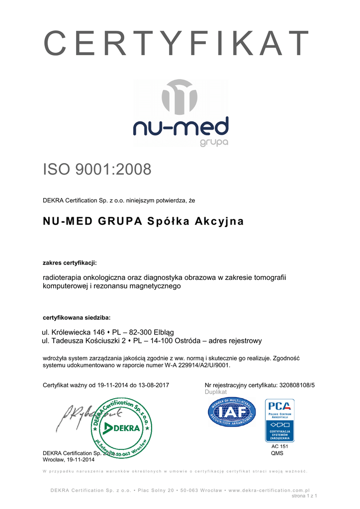 CERTYFIKAT ISO 9001:2008 DEKRA Certification Sp. z o.o. niniejszym potwierdza, że N U - M E D G R U P A S p ó ł k a Ak c y j n a zakres certyfikacji: radioterapia onkologiczna oraz diagnostyka obrazowa w zakresie tomografii komputerowej i rezonansu magnetycznego certyfikowana siedziba: ul. Królewiecka 146 PL – 82-300 Elbląg ul. Tadeusza Kościuszki 2 PL – 14-100 Ostróda – adres rejestrowy wdrożyła system zarządzania jakością zgodnie z ww. normą i skutecznie go realizuje. Zgodność systemu udokumentowano w raporcie numer W-A 229914/A2/U/9001. Certyfikat ważny od 19-11-2014 do 13-08-2017 DEKRA Certification Sp. z o.o. Wrocław, 19-11-2014 Nr rejestracyjny certyfikatu: 320808108/5 Duplikat QMS W przypadku naruszenia warunków określonych w umowie o certyfikację certyfikat straci swoją ważność. DEKRA Certification Sp. z o.o. • Plac Solny 20 • 50-063 W rocław • www.dekra-certification.com.pl strona 1 z 1