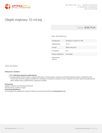 SK-FARM II Sp. z o.o. - Apteka Internetowa ul. Kleeberga 34, Białystok +48 42 279 40 05 Olejek miętowy 10 ml kej Cena: 8,95 PLN Opis słownikowy Dostępność Dostępny w aptece w 24h Opakowanie 10 ml Postać Olejki eteryczne Producent KEJ Rodzaj rejestracji Kosmetyk Substancja czynna - Opis produktu Wskazania i działanie FP V (Menthae piperitae aetheroleum) Posiada piękny świeży zapach. Łagodzi bóle głowy, menstruacyjne, migreny pochodzenia gastrycznego, nieregularny cykl menstruacji, bronchit, grypę, przeziębienia, ociężałość umysłową, zmęczenie, szok i napięcia nerwowe, zaburzenia gastryczne, stany zapalne skóry, podrażnienia, ukąszenia owadów. Stosowanie Kąpiele, masaże, aromatyzacja powietrza. Nie stosować u kobiet w ciąży! Informacje dodatkowe W razie pytań lub wątpliwości służymy Państwu pomocą pod adresem [email protected]. Plik wygenerowano: 09-03-2017 Powered by TCPDF (www.tcpdf.org) Oprogramowanie sklepu: AptusShop