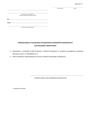 Załącznik nr 7 ……………………………………………………… (miejscowość) (data) .................................................................................................... ............................................................................................................. nazwisko i imię (osoba fizyczna) nazwa przedsiębiorstwa (osoba prawna) NIP ....................................................................................................... Regon .................................................................................................. ............................................................................................................. (adres zamieszkania/siedziby) OŚWIADCZENIE O POSIADANIU WYMAGANYCH ŚRODKÓW FINANSOWYCH LUB ZDOLNOŚCI KREDYTOWEJ 1. Oświadczam, iż posiadam środki finansowe / zdolność kredytową* w wysokości wymaganej w Zapytaniu ofertowym (siwz), tj. 300 000,00 tys. zł. 2. Jestem świadomy odpowiedzialności karnej za złożenie fałszywego oświadczenia. …............................................................................................................................... (czytelny podpis osoby składającej oświadczenie) * niewłaściwe skreślić