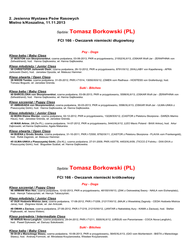 2. Jesienna Wystawa Psów Rasowych Mielno k/Koszalina, 11.11.2013 Sędzia: Tomasz Borkowski (PL) FCI 166 - Owczarek niemiecki długowłosy Psy - Dogs Klasa baby / Baby Class 37 BOSTON von Skorpionenblut, czarna podpalana, 03-06-2013, PKR w przygotowaniu, 21552/XLII/13, (OSKAR Wolf-Jar - ZERAPHINA von Zellwaldrand), hod. Hanna Gajtkowska, wł. Hanna Gajtkowska. Klasa młodzieży / Junior Class 38 CHRISTOFER Jarkowski Dwór, czarna podpalana, 28-12-2012, PKR w przygotowaniu, 8791/IX/12, (WALLABY von Kapellenerg - AFRA Jarkowski Dwór), hod. Jarosław Opozda, wł. Mateusz Hammer. Klasa otwarta / Open Class 39 NIXON Tombo, czarna podpalana, 31-05-2012, PKR.I-71514, 13050/XIX/12, (OMEN vom Radhaus - HOSTESS von Grafenburg), hod. Tomasz Bogucki, wł. Jarosław Grenda. Suki - Bitches Klasa baby / Baby Class 40 BARCELONA von Skorpionenblut, czarna podpalana, 03-06-2013, PKR w przygotowaniu, 5599/XLII/13, (OSKAR Wolf-Jar - ZERAPHINA von Zellwaldrand), hod. Hanna Gajtkowska, wł. Hanna Gajtkowska. Klasa szczeniąt / Puppy Class 41 AMBASADA von Skorpionenblut, czarna podpalana, 30-03-2013, PKR w przygotowaniu, 5596/XLII/13, (OSKAR Wolf-Jar - ULMA-UNKA z Piaszczystej Górki), hod. Hanna Gajtkowska, wł. Hanna Gajtkowska. Klasa młodzieży / Junior Class 42 BORA Kleine Werder, czarna podpalana, 02-12-2012, PKR w przygotowaniu, 13228/XIX/12, (CASTOR z Peletonu Skorpiona - DARZA Marino Haus), hod. Jarosław Grenda, wł. Jarosław Grenda. 43 WAXI Artrox, (Mł.Zw.PL), czarna podpalana, 14-07-2012, PKR w przygotowaniu, 5440/XLII/12, (LEO Mavic Poland - BAXI Artrox), hod. Artur Dąbrowski, wł.Hanna Gajtkowska, Agata Makarska. Klasa otwarta / Open Class 44 BUENA z Grodu Smoka, czarna podpalana, 31-10-2011, PKR.I-72550, 8792/IX/11, (CASTOR z Peletonu Skorpiona - FLAVIA vom Frankengold), hod. Rafał Zagórski, wł. Mateusz Hammer. 45 ULMA-UNKA z Piaszczystej Górki, (Zw.KL), czarna podpalana, 27-01-2009, PKR.I-63776, 4453/XLII/09, (TICCO Z Folinku - DIXI-DIVA z Piaszczystej Górki), hod. Bogusław Szabat, wł. Hanna Gajtkowska. Sędzia: Tomasz Borkowski (PL) FCI 166 - Owczarek niemiecki krótkowłosy Psy - Dogs Klasa szczeniąt / Puppy Class 46 ARMANI Wan Hen, czarna podpalana, 12-02-2013, PKR w przygotowaniu, 48155/VIII/13, (ZAK z Ostrowskiej Swory - NAILA vom Eichenplatz), hod. Henryk Tabaczyński, wł. Henryk Tabaczyński. Klasa młodzieży / Junior Class 47 DUX Hodowla Mistrza Jana, czarna podpalana, 17-08-2012, PKR.I-71209, 21217/XII/12, (MAJK z Weselskiej Zagrody - CEDA Hodowla Mistrza Jana), hod. Zbigniew Idziak, wł. Jan Antczak. 48 OMAN z Zacisza, czarna podpalana, 27-06-2012, PKR.I-71219, 21215/XII/12, (JANTAR z Nakielskiej Aury - KAMA z Zacisza), hod. Stefan Piątkowski, wł. Iwona Welenc. Klasa pośrednia / Intermediate Class 49 WIRUS Nova-Langfuhr, czarna podpalana, 29-04-2012, PKR.I-71211, 5500/XLII/12, (URSUS von Panoniansee - COCA Nova-Langfuhr), hod. Paweł Dykowski, wł. Dariusz Sokołowski. Suki - Bitches Klasa baby / Baby Class 50 DI-DI z Mareckiego Stawu, czarna podpalana, 10-06-2013, PKR w przygotowaniu, 5645/XLII/13, (GIO vom Muhlenteich - BISTA z Mareckiego Stawu), hod. Andrzej Formicki, wł. Mirosława Krzyżanowska, Wiesław Krzyżanowski. Klasa szczeniąt / Puppy Class 51 JESSi z Więcborskiej Doliny, czarna podpalana, 22-03-2013, PKR w przygotowaniu, 21481/XII/13, (Nico Stan Lech - Alaska z Więcborskiej Doliny), hod. Lech Bardonski, wł. Lech Bardoński. Klasa młodzieży / Junior Class 52 ELI z Hodowli Mistrza Jana, czarna podpalana, 22-12-2012, PKR w przygotowaniu, 21531/XII/12, (Gimmo Kozlikov dvor - BETA von Linares Santos), hod. Jan Antczak, Zbigniew Idziak, wł. Jan Antczak. 53 FURIA z Więcborskiej Doliny, czarna podpalana, 10-11-2012, PKR w przygotowaniu, 32466/X/12, (REMO aus Quelle - JENNA z Więcborskiej Doliny), hod. Bardoński Lech, wł. Grzegorz Skrocki. Klasa pośrednia / Intermediate Class 54 GAJA Cukrowa Góra, czarna podpalana, 15-12-2011, PKR.I-71306, 21241/XII/11, (MAJK z Weselskiej Zagrody - Nevada aus der Brunnenstrasse), hod. Zbigniew Orłowski, wł. Zbigniew Orłowski. 55 URSA vom Schwarzwald Poland (FCI), czarna podpalana, 26-02-2012, PKR.I-70465, 15078/XXI/12, (HAKER Equus - NICKI V-Max), hod. JoannaFilipecka, wł. Barbara Szpakowska. 56 WERA Wan Hen, czarna podpalana, 14-02-2012, PKR.I-71529, 47587/VIII/12, (Wegas z Kamiennej Twierdzy - Nula Wan Hen), hod. Henryk Tabaczyński, wł. Henryk Tabaczyński. 57 WIWA Wan-Hen (FCI), czarna podpalana, 14-02-2012, PKR.I-71526, 47560/VIII/12, (WEGAS z Kamiennej Twierdzy - NULA Wan-Hen (FCI)), hod. H.Tabaczyński, wł. Roman Szambor,. Klasa otwarta / Open Class 58 BONA z Kamiennej Twierdzy, czarna podpalana, 22-10-2010, PKR.I-68176, 20661/XII/10, (Majk z Weselskiej Zagrody - Oksa Kamienna Twierdza), hod. Zbigniew Szcześniak, wł. Zbigniew Orłowski. 59 FANTA Lestes Poland, czarna podpalana, 01-08-2010, PKR.I-72764, 13281/XIX/10, (DOLLAR vom Zellwaldrand - RANDIA Lestes), hod. Zbigniew Bagrowski, wł. Kazimierz Wiśniewski. 60 ROXA aus Quelle, czarna podpalana, 07-08-2010, PKR.I-72498, 13258/XIX/10, (TASKO ze Spręcowa - ULLA v. Schwarzachgrund), hod. Sebastian Skrocki, wł. Kazimierz Wiśniewski. 61 ZIMBA z Kojca Holan, czarna podpalana, 01-11-2011, PKR.I-70126, 5655/XLII/11, (Yustin Maserau - Angie von Trafalga), hod. Andrzej Holik, wł. Dariusz Sokołowski.