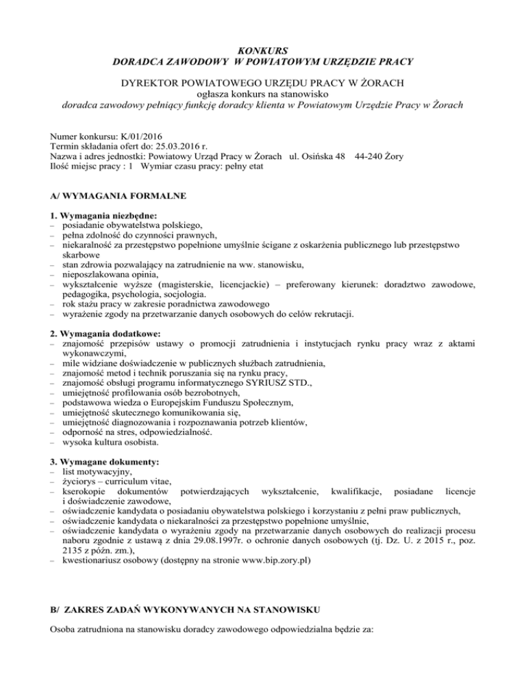 KONKURS DORADCA ZAWODOWY W POWIATOWYM URZĘDZIE PRACY DYREKTOR POWIATOWEGO URZĘDU PRACY W ŻORACH ogłasza konkurs na stanowisko doradca zawodowy pełniący funkcję doradcy klienta w Powiatowym Urzędzie Pracy w Żorach Numer konkursu: K/01/2016 Termin składania ofert do: 25.03.2016 r. Nazwa i adres jednostki: Powiatowy Urząd Pracy w Żorach ul. Osińska 48 44-240 Żory Ilość miejsc pracy : 1 Wymiar czasu pracy: pełny etat A/ WYMAGANIA FORMALNE 1. Wymagania niezbędne: – posiadanie obywatelstwa polskiego, – pełna zdolność do czynności prawnych, – niekaralność za przestępstwo popełnione umyślnie ścigane z oskarżenia publicznego lub przestępstwo skarbowe – stan zdrowia pozwalający na zatrudnienie na ww. stanowisku, – nieposzlakowana opinia, – wykształcenie wyższe (magisterskie, licencjackie) – preferowany kierunek: doradztwo zawodowe, pedagogika, psychologia, socjologia. – rok stażu pracy w zakresie poradnictwa zawodowego – wyrażenie zgody na przetwarzanie danych osobowych do celów rekrutacji. 2. Wymagania dodatkowe: – znajomość przepisów ustawy o promocji zatrudnienia i instytucjach rynku pracy wraz z aktami wykonawczymi, – mile widziane doświadczenie w publicznych służbach zatrudnienia, – znajomość metod i technik poruszania się na rynku pracy, – znajomość obsługi programu informatycznego SYRIUSZ STD., – umiejętność profilowania osób bezrobotnych, – podstawowa wiedza o Europejskim Funduszu Społecznym, – umiejętność skutecznego komunikowania się, – umiejętność diagnozowania i rozpoznawania potrzeb klientów, – odporność na stres, odpowiedzialność. – wysoka kultura osobista. 3. Wymagane dokumenty: – list motywacyjny, – życiorys – curriculum vitae, – kserokopie dokumentów potwierdzających wykształcenie, kwalifikacje, posiadane licencje i doświadczenie zawodowe, – oświadczenie kandydata o posiadaniu obywatelstwa polskiego i korzystaniu z pełni praw publicznych, – oświadczenie kandydata o niekaralności za przestępstwo popełnione umyślnie, – oświadczenie kandydata o wyrażeniu zgody na przetwarzanie danych osobowych do realizacji procesu naboru zgodnie z ustawą z dnia 29.08.1997r. o ochronie danych osobowych (tj. Dz. U. z 2015 r., poz. 2135 z późn. zm.), – kwestionariusz osobowy (dostępny na stronie www.bip.zory.pl) B/ ZAKRES ZADAŃ WYKONYWANYCH NA STANOWISKU Osoba zatrudniona na stanowisku doradcy zawodowego odpowiedzialna będzie za: ustalanie profilu pomocy dla osób bezrobotnych, opracowywanie i realizowanie indywidualnych planów działania, udzielanie informacji zawodowych: grupowych i indywidualnych, udzielanie porad indywidualnych i grupowych, doradztwo dla pracodawców w zakresie doboru kandydatów do pracy na stanowiska wymagające szczególnych predyspozycji psychofizycznych, współpraca z partnerami rynku pracy w zakresie wymiany informacji i promowania aktywnych postaw na rynku pracy. Wymagane dokumenty aplikacyjne należy składać w zamkniętych kopertach osobiście w siedzibie Powiatowego Urzędu Pracy w Żorach, ul. Osińska 48, 44-240 Żory, I piętro, pok. 17 (sekretariat) lub pocztą na adres urzędu z dopiskiem „Konkurs na stanowisko doradcy zawodowego”. Termin składania dokumentów upływa dnia 25.03.2016 r. o godzinie 14.30, liczy się data wpływu do tut. Urzędu. Rozmowy kwalifikacyjne odbędą się 31.03.2016 r. o godzinie 9.00 w siedzibie tut. Urzędu w Sali Klubu Pracy – na I piętrze. INNE INFORMACJE: W miesiącu poprzedzającym ogłoszenie niniejszego konkursu wskaźnik zatrudnienia osób niepełnosprawnych w Powiatowym Urzędzie Pracy w Żorach, w rozumieniu przepisów o rehabilitacji zawodowej i społecznej oraz zatrudnianiu osób niepełnosprawnych przekraczał 6%. Oferty konkursowe, które wpłyną do urzędu po terminie (urząd nie ponosi odpowiedzialności za opóźnienia pocztowe, decyduje data wpływu do sekretariatu urzędu), jak również niezawierające wymaganych dokumentów nie będą rozpatrywane i będą odsyłane lub odbierane osobiście przez zainteresowanych. Nie przyjmuje się dokumentów drogą elektroniczną. Oferty, z których wynikać będzie, że kandydat nie spełnia wymagań określonych w ogłoszeniu, zostaną odrzucone. Informacja z listą kandydatów spełniających wymogi formalne zostanie umieszczona na stronie internetowej www.bip.zory.pl i tablicy ogłoszeń urzędu pracy. Informacja o wynikach naboru zostanie niezwłocznie upowszechniona w Biuletynie Informacji Publicznej oraz tablicy ogłoszeń Powiatowego Urzędu Pracy w Żorach. Dyrektor Powiatowego Urzędu Pracy w Żorach Irena Ficek