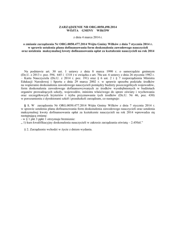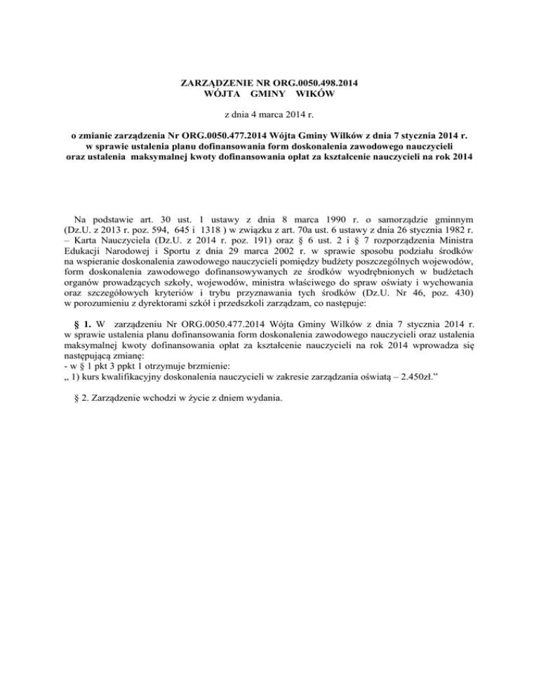 ZARZĄDZENIE NR ORG.0050.498.2014 WÓJTA GMINY WIKÓW z dnia 4 marca 2014 r. o zmianie zarządzenia Nr ORG.0050.477.2014 Wójta Gminy Wilków z dnia 7 stycznia 2014 r. w sprawie ustalenia planu dofinansowania form doskonalenia zawodowego nauczycieli oraz ustalenia maksymalnej kwoty dofinansowania opłat za kształcenie nauczycieli na rok 2014 Na podstawie art. 30 ust. 1 ustawy z dnia 8 marca 1990 r. o samorządzie gminnym (Dz.U. z 2013 r. poz. 594, 645 i 1318 ) w związku z art. 70a ust. 6 ustawy z dnia 26 stycznia 1982 r. – Karta Nauczyciela (Dz.U. z 2014 r. poz. 191) oraz § 6 ust. 2 i § 7 rozporządzenia Ministra Edukacji Narodowej i Sportu z dnia 29 marca 2002 r. w sprawie sposobu podziału środków na wspieranie doskonalenia zawodowego nauczycieli pomiędzy budżety poszczególnych wojewodów, form doskonalenia zawodowego dofinansowywanych ze środków wyodrębnionych w budżetach organów prowadzących szkoły, wojewodów, ministra właściwego do spraw oświaty i wychowania oraz szczegółowych kryteriów i trybu przyznawania tych środków (Dz.U. Nr 46, poz. 430) w porozumieniu z dyrektorami szkół i przedszkoli zarządzam, co następuje: § 1. W zarządzeniu Nr ORG.0050.477.2014 Wójta Gminy Wilków z dnia 7 stycznia 2014 r. w sprawie ustalenia planu dofinansowania form doskonalenia zawodowego nauczycieli oraz ustalenia maksymalnej kwoty dofinansowania opłat za kształcenie nauczycieli na rok 2014 wprowadza się następującą zmianę: - w § 1 pkt 3 ppkt 1 otrzymuje brzmienie: „ 1) kurs kwalifikacyjny doskonalenia nauczycieli w zakresie zarządzania oświatą – 2.450zł.” § 2. Zarządzenie wchodzi w życie z dniem wydania.