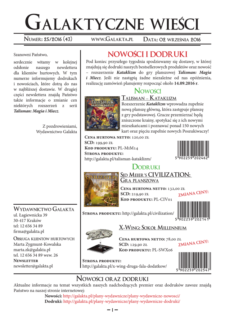Galaktyczne Numer: 25/2016 (43) www.Galakta.pl wieści Data: 02 września 2016 NOWOŚCI I DODRUKI Szanowni Państwo, serdecznie witamy w kolejnej odsłonie naszego newslettera dla klientów hurtowych. W tym numerze informujemy dodrukach i nowościach, które dotrą do nas w najbliższej dostawie. W drugiej części newslettera znajdą Państwo także informacje o zmianie cen niektórych rozszerzeń z serii Talisman: Magia i Miecz. Z pozdrowieniami, Wydawnictwo Galakta Pod koniec przyszłego tygodnia spodziewamy się dostawy, w której znajdują się dodruki naszych bestsellerowych produktów oraz nowość – rozszerzenie Kataklizm do gry planszowej Talisman: Magia i Miecz. Jeśli nie nastąpią żadne niezależne od nas opóźnienia, realizację zamówień planujemy rozpocząć około 14.09.2016 r. Nowość! Talisman – Kataklizm Rozszerzenie Kataklizm wprowadza zupełnie nową planszę główną, która zastępuje planszę z gry podstawowej. Gracze przemierzać będą zniszczone krainy, spotykać się z ich nowymi mieszkańcami i poznawać ponad 150 nowych kart oraz pięciu zupełnie nowych Poszukiwaczy! Cena hurtowa netto: 120,00 zł SCD: 199,90 zł Kod produktu: PL-MiM14 Strona produktu: http://galakta.pl/talisman-kataklizm/ Dodruki Sid Meier’s CIVILIZATION: Gra planszowa Cena hurtowa netto: 132,00 zł ! A CENY SCD: 219,90 zł ZMIAN Kod produktu: PL-CIV01 Wydawnictwo Galakta ul. Łagiewnicka 39 30-417 Kraków tel: 12 656 34 89 [email protected] Strona produktu: http://galakta.pl/civilization/ X-Wing: Sokół Millennium Obsługa klientów hurtowych Marta Zygmunt-Kowalska [email protected] tel. 12 656 34 89 wew. 26 Newsletter [email protected] Cena hurtowa netto: 78,00 zł ! A CENY SCD: 129,90 zł ZMIAN Kod produktu: PL-SWX06 Strona produktu: http://galakta.pl/x-wing-druga-fala-dodatkow/ Nowości oraz dodruki Aktualne informacje na temat wszystkich naszych nadchodzących premier oraz dodruków zawsze znajdą Państwo na naszej stronie internetowej: Nowości: http://galakta.pl/plany-wydawnicze/plany-wydawnicze-nowosci/ Dodruki: http://galakta.pl/plany-wydawnicze/plany-wydawnicze-dodruki/ 1 ZMIANY CENY Pragniemy poinformować, że od 8.09.2016 zmienia się cena trzech rozszerzeń do gry planszowej Talisman: Magia i Miecz: Żniwiarz, Góry oraz Kraina Ognia. Zachęcamy do odpowiedniego zaktualizowania cen w Państwa sklepach. Talisman: Żniwiarz Cena hurtowa netto: 54,00 zł A CENY SCD: 89,90 zł ZMIAN 016 od 8.09.2 Kod produktu: PL-Mim02 Strona produktu: http://galakta.pl/talisman-zniwiarz/ Talisman: Góry Cena hurtowa netto: 90,00 zł A CENY SCD: 149,90 zł ZMIAN 016 od 8.09.2 Kod produktu: PL-MiM05 Strona produktu: http://galakta.pl/talisman-gory/ Talisman: Kraina Ognia Cena hurtowa netto: 54,00 zł A CENY SCD: 89,90 zł ZMIAN 016 od 8.09.2 Kod produktu: PL-MIM11 Strona produktu: http://galakta.pl/talisman-kraina-ognia/ Nowości oraz dodruki Najnowsze informacje na temat wszystkich naszych nadchodzących premier oraz dodruków zawsze znajdą Państwo na naszej stronie internetowej: Nowości: http://galakta.pl/plany-wydawnicze/plany-wydawnicze-nowosci/ Dodruki: http://galakta.pl/plany-wydawnicze/plany-wydawnicze-dodruki/ 2