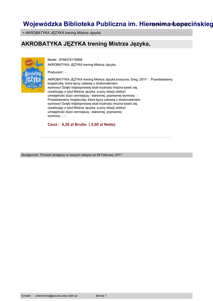 Utworzono : 09Łopacińskieg March 2017 Wojewódzka Biblioteka Publiczna im. Hieronima > AKROBATYKA JĘZYKA trening Mistrza Języka, AKROBATYKA JĘZYKA trening Mistrza Języka, Model : 9788375176896 AKROBATYKA JĘZYKA trening Mistrza Języka, Producent : AKROBATYKA JĘZYKA trening Mistrza Języka,broszura, Greg, 2017� Przedstawiamy książeczkę, która łączy zabawę z doskonaleniem wymowy! Dzięki trójstopniowej skali trudności można bawić się, rywalizując o tytuł Mistrza Języka, a przy okazji zdobyć umiejętność dużo cenniejszą - starannej, poprawnej wymowy. � Przedstawiamy książeczkę, która łączy zabawę z doskonaleniem wymowy! Dzięki trójstopniowej skali trudności można bawić się, rywalizując o tytuł Mistrza Języka, a przy okazji zdobyć umiejętność dużo cenniejszą - starannej, poprawnej wymowy.�� Cena : 6,20 zł Brutto ( 5,90 zł Netto) Dostępność: Produkt dostępny w naszym sklepie od 08 February 2017 kontakt : - [email protected] Strona 1