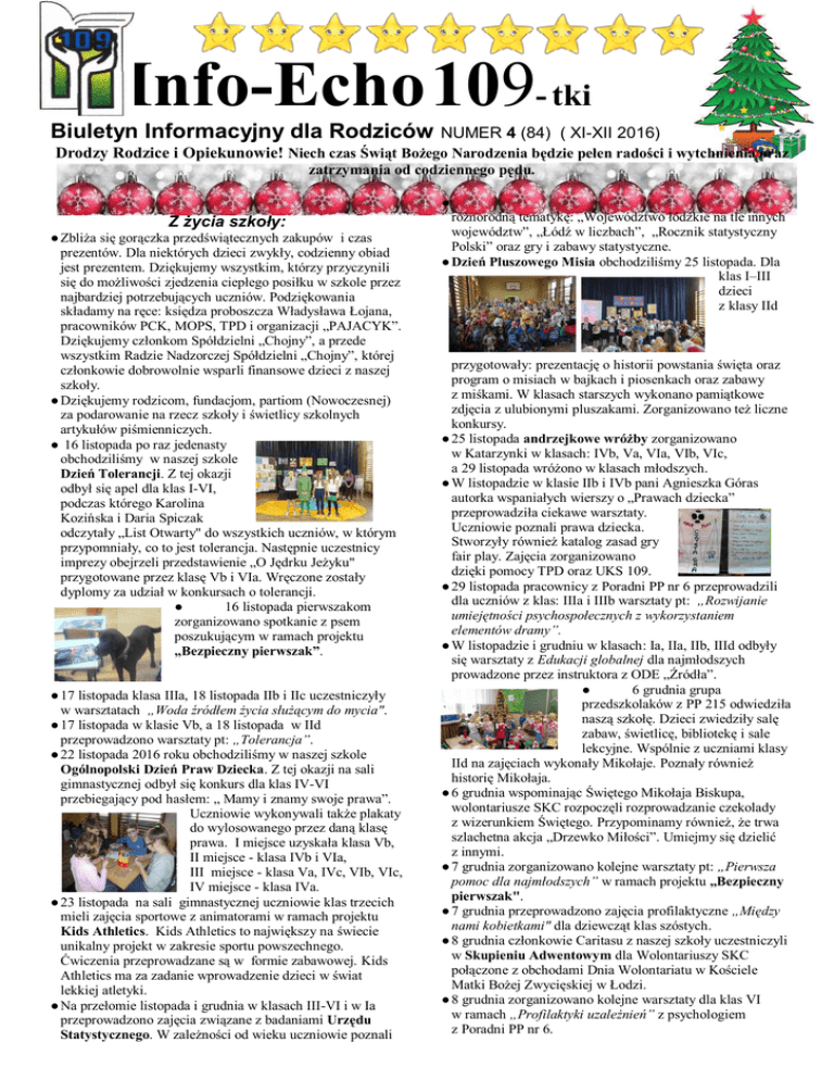 Info-Echo 109- tki Biuletyn Informacyjny dla Rodziców NUMER 4 (84) ( XI-XII 2016) Drodzy Rodzice i Opiekunowie! Niech czas Świąt Bożego Narodzenia będzie pełen radości i wytchnienia oraz zatrzymania od codziennego pędu. ● Z życia szkoły: ● Zbliża się gorączka przedświątecznych zakupów i czas prezentów. Dla niektórych dzieci zwykły, codzienny obiad jest prezentem. Dziękujemy wszystkim, którzy przyczynili się do możliwości zjedzenia ciepłego posiłku w szkole przez najbardziej potrzebujących uczniów. Podziękowania składamy na ręce: księdza proboszcza Władysława Łojana, pracowników PCK, MOPS, TPD i organizacji „PAJACYK”. Dziękujemy członkom Spółdzielni „Chojny”, a przede wszystkim Radzie Nadzorczej Spółdzielni „Chojny”, której członkowie dobrowolnie wsparli finansowe dzieci z naszej szkoły. ● Dziękujemy rodzicom, fundacjom, partiom (Nowoczesnej) za podarowanie na rzecz szkoły i świetlicy szkolnych artykułów piśmienniczych. ● 16 listopada po raz jedenasty obchodziliśmy w naszej szkole Dzień Tolerancji. Z tej okazji odbył się apel dla klas I-VI, podczas którego Karolina Kozińska i Daria Spiczak odczytały „List Otwarty" do wszystkich uczniów, w którym przypomniały, co to jest tolerancja. Następnie uczestnicy imprezy obejrzeli przedstawienie „O Jędrku Jeżyku" przygotowane przez klasę Vb i VIa. Wręczone zostały dyplomy za udział w konkursach o tolerancji. ● 16 listopada pierwszakom zorganizowano spotkanie z psem poszukującym w ramach projektu „Bezpieczny pierwszak”. ● 17 listopada klasa IIIa, 18 listopada IIb i IIc uczestniczyły w warsztatach „Woda źródłem życia służącym do mycia". ● 17 listopada w klasie Vb, a 18 listopada w IId przeprowadzono warsztaty pt: „Tolerancja”. ● 22 listopada 2016 roku obchodziliśmy w naszej szkole Ogólnopolski Dzień Praw Dziecka. Z tej okazji na sali gimnastycznej odbył się konkurs dla klas IV-VI przebiegający pod hasłem: „ Mamy i znamy swoje prawa”. Uczniowie wykonywali także plakaty do wylosowanego przez daną klasę prawa. I miejsce uzyskała klasa Vb, II miejsce - klasa IVb i VIa, III miejsce - klasa Va, IVc, VIb, VIc, IV miejsce - klasa IVa. ● 23 listopada na sali gimnastycznej uczniowie klas trzecich mieli zajęcia sportowe z animatorami w ramach projektu Kids Athletics. Kids Athletics to największy na świecie unikalny projekt w zakresie sportu powszechnego. Ćwiczenia przeprowadzane są w formie zabawowej. Kids Athletics ma za zadanie wprowadzenie dzieci w świat lekkiej atletyki. ● Na przełomie listopada i grudnia w klasach III-VI i w Ia przeprowadzono zajęcia związane z badaniami Urzędu Statystycznego. W zależności od wieku uczniowie poznali różnorodną tematykę: „Województwo łódzkie na tle innych województw”, „Łódź w liczbach”, „Rocznik statystyczny Polski” oraz gry i zabawy statystyczne. ● Dzień Pluszowego Misia obchodziliśmy 25 listopada. Dla klas I–III dzieci z klasy IId przygotowały: prezentację o historii powstania święta oraz program o misiach w bajkach i piosenkach oraz zabawy z miśkami. W klasach starszych wykonano pamiątkowe zdjęcia z ulubionymi pluszakami. Zorganizowano też liczne konkursy. ● 25 listopada andrzejkowe wróżby zorganizowano w Katarzynki w klasach: IVb, Va, VIa, VIb, VIc, a 29 listopada wróżono w klasach młodszych. ● W listopadzie w klasie IIb i IVb pani Agnieszka Góras autorka wspaniałych wierszy o „Prawach dziecka” przeprowadziła ciekawe warsztaty. Uczniowie poznali prawa dziecka. Stworzyły również katalog zasad gry fair play. Zajęcia zorganizowano dzięki pomocy TPD oraz UKS 109. ● 29 listopada pracownicy z Poradni PP nr 6 przeprowadzili dla uczniów z klas: IIIa i IIIb warsztaty pt: „Rozwijanie umiejętności psychospołecznych z wykorzystaniem elementów dramy”. ● W listopadzie i grudniu w klasach: Ia, IIa, IIb, IIId odbyły się warsztaty z Edukacji globalnej dla najmłodszych prowadzone przez instruktora z ODE „Źródła”. ● 6 grudnia grupa przedszkolaków z PP 215 odwiedziła naszą szkołę. Dzieci zwiedziły salę zabaw, świetlicę, bibliotekę i sale lekcyjne. Wspólnie z uczniami klasy IId na zajęciach wykonały Mikołaje. Poznały również historię Mikołaja. ● 6 grudnia wspominając Świętego Mikołaja Biskupa, wolontariusze SKC rozpoczęli rozprowadzanie czekolady z wizerunkiem Świętego. Przypominamy również, że trwa szlachetna akcja „Drzewko Miłości”. Umiejmy się dzielić z innymi. ● 7 grudnia zorganizowano kolejne warsztaty pt: „Pierwsza pomoc dla najmłodszych” w ramach projektu „Bezpieczny pierwszak". ● 7 grudnia przeprowadzono zajęcia profilaktyczne „Między nami kobietkami" dla dziewcząt klas szóstych. ● 8 grudnia członkowie Caritasu z naszej szkoły uczestniczyli w Skupieniu Adwentowym dla Wolontariuszy SKC połączone z obchodami Dnia Wolontariatu w Kościele Matki Bożej Zwycięskiej w Łodzi. ● 8 grudnia zorganizowano kolejne warsztaty dla klas VI w ramach „Profilaktyki uzależnień” z psychologiem z Poradni PP nr 6. ● 9 grudnia podczas apeli dla klas starszych i młodszych podsumowaliśmy konkursy i akcje wolontariatu w naszej szkole. Przedstawiono kolejną edycję UNICEf-u „Kolory Świata”. Uczniowie z klas Vb i IVa zaprezentowali wzruszające przedstawienie oparte na baśni pt.: „Dziewczynka z zapałkami”. Lekcje w terenie: ● W lekcjach bibliotecznych uczestniczyli: - 18 listopada IIIb i IId – Rozwijanie zainteresowań czytelniczych Arteterapia "Poznajemy Łódź"; - 21 listopada VIb i Vb - „Rozwijanie zainteresowań czytelniczych - komunikacja międzyludzka”; - 22 i 28 listopada IIId i III b - „Rozwijanie zainteresowań czytelniczych poprzez różne formy obcowania z literaturą zajęcia plastyczne”. ● 23 listopada klasa Va wybrała się do Muzeum Włókiennictwa na warsztaty w pracowni materiału. ● 6 grudnia na niezwykłą wycie