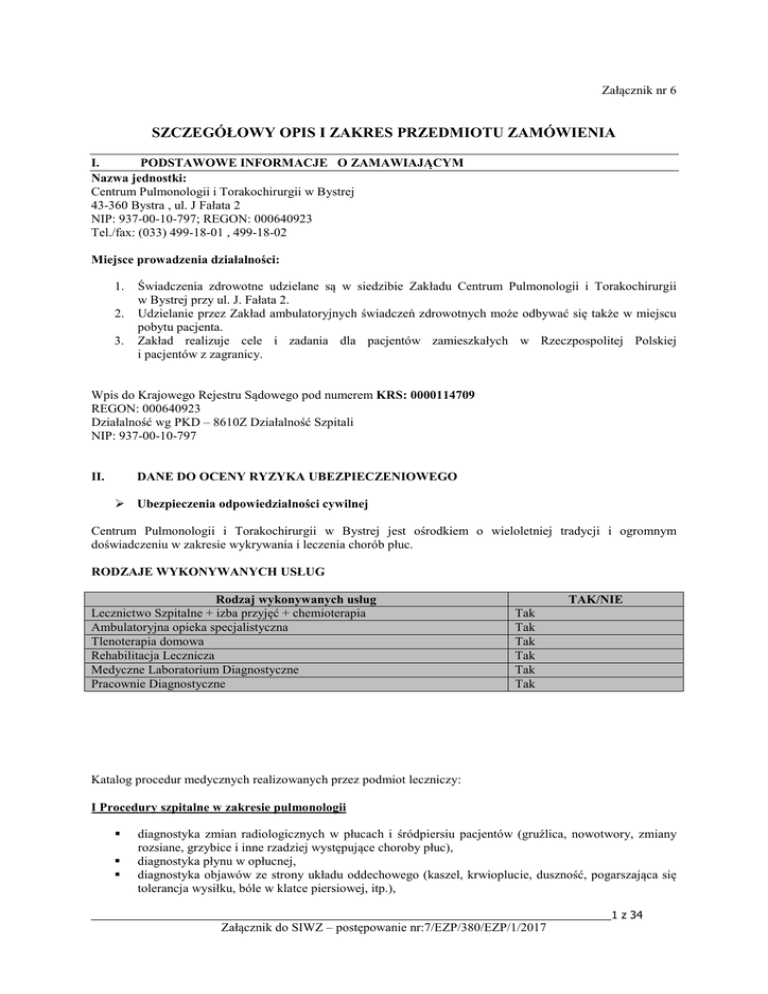 Załącznik nr 6 SZCZEGÓŁOWY OPIS I ZAKRES PRZEDMIOTU ZAMÓWIENIA I. PODSTAWOWE INFORMACJE O ZAMAWIAJĄCYM Nazwa jednostki: Centrum Pulmonologii i Torakochirurgii w Bystrej 43-360 Bystra , ul. J Fałata 2 NIP: 937-00-10-797; REGON: 000640923 Tel./fax: (033) 499-18-01 , 499-18-02 Miejsce prowadzenia działalności: 1. 2. 3. Świadczenia zdrowotne udzielane są w siedzibie Zakładu Centrum Pulmonologii i Torakochirurgii w Bystrej przy ul. J. Fałata 2. Udzielanie przez Zakład ambulatoryjnych świadczeń zdrowotnych może odbywać się także w miejscu pobytu pacjenta. Zakład realizuje cele i zadania dla pacjentów zamieszkałych w Rzeczpospolitej Polskiej i pacjentów z zagranicy. Wpis do Krajowego Rejestru Sądowego pod numerem KRS: 0000114709 REGON: 000640923 Działalność wg PKD – 8610Z Działalność Szpitali NIP: 937-00-10-797 II. DANE DO OCENY RYZYKA UBEZPIECZENIOWEGO Ubezpieczenia odpowiedzialności cywilnej Centrum Pulmonologii i Torakochirurgii w Bystrej jest ośrodkiem o wieloletniej tradycji i ogromnym doświadczeniu w zakresie wykrywania i leczenia chorób płuc. RODZAJE WYKONYWANYCH USŁUG Rodzaj wykonywanych usług Lecznictwo Szpitalne + izba przyjęć + chemioterapia Ambulatoryjna opieka specjalistyczna Tlenoterapia domowa Rehabilitacja Lecznicza Medyczne Laboratorium Diagnostyczne Pracownie Diagnostyczne TAK/NIE Tak Tak Tak Tak Tak Tak Katalog procedur medycznych realizowanych przez podmiot leczniczy: I Procedury szpitalne w zakresie pulmonologii diagnostyka zmian radiologicznych w płucach i śródpiersiu pacjentów (gruźlica, nowotwory, zmiany rozsiane, grzybice i inne rzadziej występujące choroby płuc), diagnostyka płynu w opłucnej, diagnostyka objawów ze strony układu oddechowego (kaszel, krwioplucie, duszność, pogarszająca się tolerancja wysiłku, bóle w klatce piersiowej, itp.), __________________________________________________________________________________1 z 34 Załącznik do SIWZ – postępowanie nr:7/EZP/380/EZP/1/2017 diagnostyka chorób alergicznych układu oddechowego, leczenie stanów zapalnych układu oddechowego, leczenie chorób śródmiąższowych płuc m.in. sarkoidozy, leczenie zaostrzeń astmy oskrzelowej i POChP, leczenie wysiękowych zmian chorobowych, ocena zaawansowania chorób nowotworowych układu oddechowego i przygotowanie do dalszego leczenia, kwalifikacja pacjentów do domowego leczenia tlenem, Leczenie niewydolności oddychania przy zastosowaniu nieinwazyjnej wentylacji mechanicznej (NWM). Każdy z oddziałów szpitalnych ma dostęp do pełnego panelu badań laboratoryjnych, cytologicznych, mikrobiologicznych, radiologicznych, endoskopowych i badań czynnościowych płuc. W zakresie gruźlicy diagnostyka i leczenie gruźlicę płuc, gruźlicę innych układów m.in. gruźlicę opłucnej, kości, pęcherza moczowego, układu nerwowego, gruźlicę lekooporną mykobakteriozy W zakresie chirurgii klatki piersiowej: 1. Pełna diagnostyka chorób klatki piersiowej Bronchofiberoskopie Bronchofiberoskopie EBUS /EUS (przez oskrzelową biopsję igłową po kontrolą USG) Biopsje igłowe transtorakalne Biopsje węzłów chłonnych nadobojczykowych USG, TK RM klatki piersiowej 2. Zabiegi w zakresie klatki piersiowej Resekcje miąższu płucnego. esekcję guzów śródpiersia Całkowite usunięcie węzłów chłonnych śródpiersia Leczenie chirurgiczne uszkodzeń urazowych Zakładanie protez tchawiczych i tchawiczo-oskrzelowych z użyciem wentylacji dyszowej Zabiegi plastyczne ściany klatki piersiowej Resekcje tchawicy Usunięcia torbieli rozedmowych, protezowanie dróg oddechowych 3. Zabiegi z zastosowaniem toru wizyjnego Videotorakoskopie- diagnostykę płynu opłucnowego Videotorakoskopowe szycie płuca, diagnostykę zmian w opłucnej i tkance płucnej Videomediastinoskopie diagnostykę węzłów chłonnych śródpiersia W zakresie chemioterapii nowotworów płuc: W każdym oddziale pulmonologicznym diagnozowane są choroby nowotworowe płuc, zgodnie ze standardami onkologicznymi. Leczenie chorób nowotworowych w trybie hospitalizacji i chemioterapii ambulatoryjnej prowadzone jest w Oddziale Pulmonologii z Pododdziałem Chemioterapii. W nowoczesnej pracowni cytostatycznej i salach do chemioterapii podawane są wielolekowe schematy chemioterapii przy użyciu sprzętu bezpiecznego dla personelu i pacjentów. Szpital monitoruje także skuteczność leczenia onkologicznego. Oddział ma dostęp do pełnego panelu badań krwi, badań radiologicznych, jak również histopatologicznych i radiologicznych. W zakresie diagnostyki i leczenia bezdechu sennego: kwalifikacja do diagnostyki polisomnograficznej, ocena wyników badania polisomnograficznego i decyzja co do dalszego leczenia, II Procedury w poradniach specjalistycznych W poradni chorób płuc i gruźlicy realizowane są: świadczenia diagnostyczno-lecznicze, kwalifikowanie pacjentów do leczenia szpitalnego, prowadzenie badań kontrolnych po leczeniu szpitalnym, udzielanie konsultacji pacjentom kierowanym przez lekarzy __________________________________________________________________________________2 z 34 Załącznik do SIWZ – postępowanie nr:7/EZP/380/EZP/1/2017 rodzinnych, specjalistów i przez inne zakłady opieki zdrowotnej, zlecenie wykonania specjalistycznych badań diagnostycznych. kontynuację terapii szpitalnej pacjentów szczególnie z gruźlicą lekooporną i mykobakteriozą, wymagających okresowych badań laboratoryjnych, okresową kontrolę po zakończonej terapii p/prątkowej szczególnie u pacjentów wymagających specjalistycznej opieki lekarskiej z uwagi na możliwość wznowy choroby, W poradni alergologicznej realizowane są: diagnostykę i leczenie chorób alergicznych układu oddechowego, w tym kwalifikacja i prowadzenie immunoterapii swoistej, udzielanie konsultacji pacjentom kierowanym przez lekarzy rodzinnych. W poradni Chirurgii Klatki Piersiowej realizowane są: świadczenia diagnostyczno-lecznicze, kwalifikowanie pacjentów do leczenia szpitalnego,