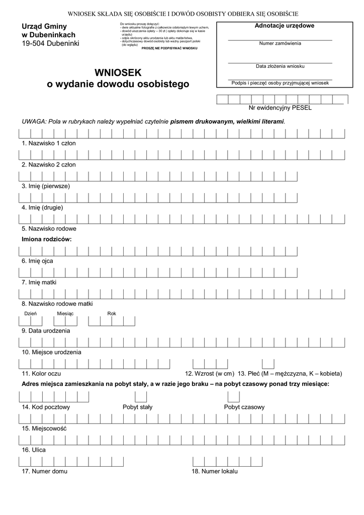 WNIOSEK SKŁADA SIĘ OSOBIŚCIE I DOWÓD OSOBISTY ODBIERA SIĘ OSOBIŚCIE Do wniosku proszę dołączyć: - dwie aktualne fotografie z całkowicie odsłoniętym lewym uchem, - dowód uiszczenia opłaty – 30 zł ( opłaty dokonuje się w kasie urzędu) - odpis skrócony aktu urodzenia lub aktu małżeństwa, - dotychczasowy dowód osobisty lub ważny paszport polski (do wglądu) PROSZĘ NIE PODPISYWAĆ WNIOSKU Urząd Gminy w Dubeninkach 19-504 Dubeninki Adnotacje urzędowe Numer zamówienia Data złożenia wniosku WNIOSEK o wydanie dowodu osobistego Podpis i pieczęć osoby przyjmującej wniosek Nr ewidencyjny PESEL UWAGA: Pola w rubrykach należy wypełniać czytelnie pismem drukowanym, wielkimi literami. 1. Nazwisko 1 człon 2. Nazwisko 2 człon 3. Imię (pierwsze) 4. Imię (drugie) 5. Nazwisko rodowe Imiona rodziców: 6. Imię ojca 7. Imię matki 8. Nazwisko rodowe matki Dzień Miesiąc Rok 9. Data urodzenia 10. Miejsce urodzenia 11. Kolor oczu 12. Wzrost (w cm) 13. Płeć (M – mężczyzna, K – kobieta) Adres miejsca zamieszkania na pobyt stały, a w razie jego braku – na pobyt czasowy ponad trzy miesiące: 14. Kod pocztowy Pobyt stały Pobyt czasowy 15. Miejscowość 16. Ulica 17. Numer domu 18. Numer lokalu Posiadany dokument tożsamości: ............................................................................................................ 19. Seria 20. Numer Wydany przez: 21. Nazwa 22. Siedziba a) Podlega wymianie z powodu .................................................................................... ...................................................................................................................................... Fotografia 35 x 45 mm b) Został utracony w dniu Dzień Miesiąc Rok c) Przyczyna utraty (kradzież, zagubienie, zniszczenie) Do wniosku załączam 2 fotografie oraz następujące dokumenty: 1. .................................................................................................................................... 2. .................................................................................................................................... 3. .................................................................................................................................... 4. ................................................................................................................................... Uprzedzony o odpowiedzialności karnej z art. 272 Kodeksu Karnego za fałszywe zeznanie, prawdziwość powyższych danych stwierdzam własnoręcznym podpisem. ................................................. dnia ................................... miejscowość Podpis Adnotacje urzędowe Stwierdza się zgodność danych zawartych w rubrykach niniejszego wniosku od 1 do 10 z aktem urodzenia (małżeństwa) Nr ............................................. Pieczęć Kierownik Urzędu Stanu USC Cywilnego Pieczęć wystawcy i podpis upoważnionej osoby .......................................... miejscowość, dnia ......................................... . podpis Stwierdza się, że wnioskodawca jest zameldowany pod wskazanym adresem w rubrykach od 14 do 18: a) na pobyt stały od dnia ............................................. .......................................... data ......................................... . podpis b) na pobyt czasowy ponad 3 miesiące od dnia ............................................., do dnia ............................................. .......................................... data ......................................... . podpis POUCZENIE: 1. Wniosek należy złożyć w gminnym lub miejskim Organie Ewidencji Ludności, właściwym dla miejsca zamieszkania. 2. Do wniosku należy dołączyć następujące dokumenty: odpis skrócony aktu urodzenia, lub aktu małżeństwa i posiadany dokument tożsamości. W przypadku, gdy wymienione akty znajdują się w miejscowym Urzędzie Stanu Cywilnego, sprawdzenia danych zawartych we wniosku dokonuje organ przyjmujący wniosek, bez potrzeby załączania odpisów aktów. Do wniosku o wymianę dowodu osobistego, nie załącza się odpisów aktów stanu cywilnego, jeżeli dane osobowe nie uległy zmianie od czasu wydania ostatniego dokumentu. 3. Do wniosku należy dołączyć dwie aktualne kolorowe lub czarno-białe fotografie o wymiarach 35 x 45 mm podpisane na odwrocie imieniem i nazwiskiem wnioskodawcy. 4. W rubryce „kolor oczu” należy wpisać, zgodnie ze stanem faktycznym: „NIEBIESKIE, SZARE, ZIELONE, PIWNE, BRĄZOWE, CZARNE, CZERWONE, WIELOKOLOROWE, NIEOKREŚLONE”. 5. W przypadku, gdy wnioskodawcą jest osoba mieszkająca na stałe poza granicami kraju, posiadająca obywatelstwo polskie, w rubryce 15 – „miejscowość” winna wpisać kraj stałego zamieszkania, natomiast w polach dotyczących posiadanego dokumentu tożsamości winna wpisać dane o posiadanym paszporcie. 6. W przypadku, gdy wnioskodawca posiada większą ilość członów nazwiska niż dwa, kolejne człony nazwiska należy wpisywać kolejno w rubrykach 1 i 2 oddzielone jednym wolnym miejscem, zasada ta również dotyczy większej ilości imion (rubryki 3 i 4).