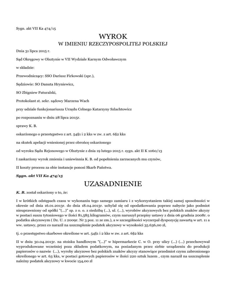 Sygn. akt VII Ka 474/15 WYROK W IMIENIU RZECZYPOSPOLITEJ POLSKIEJ Dnia 31 lipca 2015 r. Sąd Okręgowy w Olsztynie w VII Wydziale Karnym Odwoławczym w składzie: Przewodniczący: SSO Dariusz Firkowski (spr.), Sędziowie: SO Danuta Hryniewicz, SO Zbigniew Paturalski, Protokolant st. sekr. sądowy Marzena Wach przy udziale funkcjonariusza Urzędu Celnego Katarzyny Szlachtowicz po rozpoznaniu w dniu 28 lipca 2015r. sprawy K. B. oskarżonego o przestępstwo z art. 54§1 i 2 kks w zw. z art. 6§2 kks na skutek apelacji wniesionej przez obrońcę oskarżonego od wyroku Sądu Rejonowego w Olsztynie z dnia 19 lutego 2015 r. sygn. akt II K 1060/13 I zaskarżony wyrok zmienia i uniewinnia K. B. od popełnienia zarzucanych mu czynów, II koszty procesu za obie instancje ponosi Skarb Państwa. Sygn. akt VII Ka 474/15 UZASADNIENIE K. B. został oskarżony o to, że: I w krótkich odstępach czasu w wykonaniu tego samego zamiaru i z wykorzystaniem takiej samej sposobności w okresie od dnia 16.01.2013r. do dnia 18.04.2013r. uchylał się od opodatkowania poprzez nabycie jako podmiot nieuprawniony od spółki "(...)" sp. z o. o. z siedzibą (...), ul. (...), wyrobów akcyzowych bez polskich znaków akcyzy w postaci suszu tytoniowego w ilości 81,585 kilogramów, czym naruszył przepisy ustawy z dnia 06 grudnia 2008r. o podatku akcyzowym ( Dz. U. z 2009r. Nr 3 poz. 11 ze zm.), a w szczególności wyczerpał dyspozycję zawartą w art. 11 a ww. ustawy, przez co naraził na uszczuplenie podatek akcyzowy w wysokości 35.636,00 zł, tj. o przestępstwo skarbowe określone w art. 54§1 i 2 kks w zw. z art. 6§2 kks II w dniu 30.04.2013r. na stoisku handlowym "(...)" w hipermarkecie C. w O. przy ulicy (...) (...) przechowywał wyprodukowane wcześniej poza składem podatkowym, na posiadanym przez siebie urządzeniu do produkcji papierosów o nazwie (...), wyroby akcyzowe bez polskich znaków akcyzy stanowiące przedmiot czynu zabronionego określonego w art. 63 kks, w postaci gotowych papierosów w ilości 220 sztuk luzem , czym naraził na uszczuplenie należny podatek akcyzowy w kwocie 154,00 zł tj. o wykroczenie skarbowe określone wart. 65§ 1 i 4kks Sąd Rejonowy w Olsztynie wyrokiem z dnia 19 lutego 2015 r. sygn. akt II K 1060/13 I oskarżonego w ramach czynu opisanego w pkt I uznał za winnego tego, że w okresie od dnia 16.01.2013r. do dnia 18.04.2013r. działając w krótkich odstępach czasu i w wykonaniu tego samego zamiaru i z wykorzystaniem takiej samej sposobności nabył od spółki „(...)" sp. z o. o. z siedzibą (...), ul. (...), wyroby akcyzowe bez polskich znaków akcyzy w postaci suszu tytoniowego w ilości 81,585 kilogramów, czym naruszył przepisy ustawy z dnia 06 grudnia 2008r. o podatku akcyzowym (Dz. U. z 2009r. Nr 3 poz. 11 ze zm.), przez co naraził na uszczuplenie podatek akcyzowy w wysokości 35.636,00 zł, czym wyczerpał znamiona art.65§3 kks w zw. z art.6§2 kks i za to na podstawie wskazanych przepisów skazuje go a na podstawie art.65§3 kks wymierza mu karę grzywny w wysokości 300 (trzystu) stawek dziennych, ustalając wysokość jednej stawki na 70 (siedemdziesiąt) zł; II oskarżonego uznał za winnego czynu opisanego w pkt II i za to na podstawie art.65§l i §4 kks skazał go a na podstawie art.65§4 kks wymierza mu karę grzywny w wysokości 200 (dwustu) zł. Powyższy wyrok w całości na korzyść oskarżonego zaskarżył jego obrońca i zarzucił mu: 1/ obrazę prawa materialnego, a to art. 99a ust. 1 ustawy z dnia 6 grudnia 2008 r. o podatku akcyzowym (dalej jako „u.p.a.") w brzmieniu obowiązującym w czasie czynu, a to nadanym ustawą z dnia 7 grudnia 2012 r. o zmianie niektórych ustaw w związku z realizacją ustawy budżetowej (Dz. U. z 2012 r. poz. 1456), która weszła w życie 1 stycznia 2013 r. i obowiązywała do 31 grudnia 2013 r., poprzez błędną wykładnię pojęcia „susz tytoniowy" i uznanie, że „na zakwalifikowanie towaru jako akcyzowego nie ma wpływu stopień wilgotności tytoniu, ale poddanie go procesowi suszenia, w wyniku czego świeży liść ulega przemianom fizykochemicznym w zakresie barwy, zapachu, czy elastyczności" (str. 11 uzasadnienia zaskarżonego wyroku), podczas gdy obowiązująca w czasie czynu definicja ustawowa wskazanego pojęcia jednoznacznie wskazywała, iż chodzi o „suchy tytoń niebędący jeszcze wyrobem tytoniowym" (zatem kryterium jest tutaj „suchość" liścia, czyli poziom jego wilgotności, nie zaś barwa, zapach, czy elastyczność), a zmiana jej treści poprzez wskazanie, że „za susz tytoniowy uznaje się, bez względu na wilgotność, tytoń, który nie jest połączony z żywą rośliną i nie jest jeszcze wyrobem tytoniowym" nastąpiła dopiero z dniem 1 stycznia 2014 r., w związku z czym twierdzenie, że tzw. tytoń wysokowilgotny (nie-suchy) zaliczał się do grona desygnatów „suszu tytoniowego" już na gruncie stanu prawnego obowiązującego w roku 2013 stanowi przejaw wykładni rozszerzającej, która w przypadku prawa karnego jest zakazana (Wyrok WSA w Rzeszowie z dnia 23 września 2013 r., I SA/Rz 496/13, SIP Legalis nr 801928), 2/ naruszenie przepisów postępowania, a to art. art. 410 k.p.k. w zw. z art. 7 k.p.k., poprzez taką ocenę przeprowadzonych w sprawie dowodów w postaci zeznań świadków E. G. i N. B. oraz wyjaśnień oskarżonego, a dotyczących faktu posiadania w punkcie handlowym 220 sztuk gotowych papierosów i ich sprzedaży klientom, która nie uwzględnia wskazań wiedzy i doświadczenie życiowego (str. 6-7 uzasadnienia), podczas gdy z wyjaśnień oskarżonego i zeznań jego córki wynikało, że często produkowali oni papierosy na własne potrzeby, zaś rzekoma sprzeczność co do tego, kto był „autorem" towaru znalezionego w dniu 30 kwietnia 2014 r. jest już irrelewantna, zwłaszcza że E. G. sprostowała przed sądem swoje zeznania, iż gotowe papierosy odbierała z punktu handlowego co najwyżej w początkowym okresie (zatem na pewno nie w kwietniu),