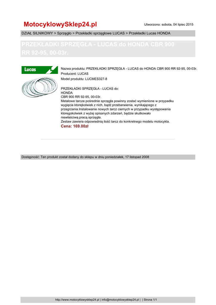 MotocyklowySklep24.pl Utworzono: sobota, 04 lipiec 2015 DZIAŁ SILNIKOWY > Sprzęgło > Przekładki sprzęgłowe LUCAS > Przekładki Lucas HONDA PRZEKŁADKI SPRZĘGŁA - LUCAS do HONDA CBR 900 RR 92-95, 00-03r. Nazwa produktu: PRZEKŁADKI SPRZĘGŁA - LUCAS do HONDA CBR 900 RR 92-95, 00-03r. Producent: LUCAS Model produktu: LUCMES327-8 PRZEKŁADKI SPRZĘGŁA - LUCAS do: HONDA CBR 900 RR 92-95, 00-03r. Metalowe tarcze pośrednie sprzęgła powinny zostać wymienione w przypadku wygięcia ktorejkolwiek z nich, bądź przebarwienia, wynikającego z przegrzania.Instalowanie nowych tarcz ciernych w przypadku występowania ktoregokolwiek z wyżej opisanych zdarzeń, będzie skutkowało niewłaściwą pracą sprzęgła. Zestaw zawiera odpowiednią ilość tarcz do konkretnego modelu motocykla. Cena: 169.00zł Dostępność: Ten produkt został dodany do sklepu w dniu poniedziałek, 17 listopad 2008 http://www.motocyklowysklep24.pl | [email protected] | | Strona 1/1