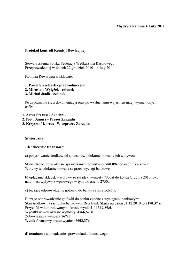 Międzyrzecz dnia 4 Luty 2011 Protokół kontroli Komisji Rewizyjnej Stowarzyszenia Polska Federacja Wędkarstwa Karpiowego Przeprowadzonej w dniach 22 grudzień 2010 – 4 luty 2011 Komisja Rewizyjna w składzie: 1. Paweł Strzelczyk - przewodniczący 2. Mirosław WylęŜek - członek 3. Michał Janik - członek Po zapoznaniu się z dokumentacją oraz po wysłuchaniu wyjaśnień niŜej wymienionych osób: 1. Artur Strauss - Skarbnik 2. Piotr Janusz – Prezes Zarządu 3. Krzysztof Kortus– Wiceprezes Zarządu Stwierdziła: 1.Rozliczenie finansowe: a) pozyskiwanie środków od sponsorów i dokumentowanie ich wpływów Stwierdzono, Ŝe w okresie sprawdzanym pozyskano 780,89zł od osób fizycznych Wpływy te udokumentowane są przez wyciągi bankowe. b) opłacanie składek – wpływy ze składek wyniosły 7000zł do końca Grudnia 2010 roku natomiast wpływy z wpisowego w tym okresie to 2750zł c) bieŜące odprowadzanie gotówki do banku i stan środków. BieŜące odprowadzanie gotówki do banku zgodne z wyciągami bankowymi. Stan środków na rachunku bankowym ING Bank Śląski na dzień 31.12.2010 to 7170,37 zł, Przychód w kontrolowanym okresie wyniósł 11369,89zł. Wydatki w w/w okresie wyniosły: 4766,52 zł. Zobowiązania wynoszą 567zł Wynik finansowy brutto wyniósł 6603,37zł d) terminowe sporządzanie sprawozdania finansowego. Zgodnie z ustawą o rachunkowości, bilans sporządzany jest raz do roku. Na podstawie przedstawionych przez Zarząd dokumentów stwierdzono prawidłowe sporządzenie sprawozdania finansowego. W/w sprawozdanie zostanie poddane zatwierdzeniu przez Walne Zgromadzenie członków Stowarzyszenia. 2.Praca Zarządu: a) częstotliwość posiedzeń Posiedzenia Zarządu odbywały się wg potrzeb, odbyły się trzy posiedzenia w roku 2010. Dodatkowo Zarząd komunikował się poprzez internetowe forum Zarządu gdzie były omawiane wszelkie plany i decyzje. Aktywność członków Zarządu była zróŜnicowana i częściowo nie wystarczająca dla potrzeb Stowarzyszenia (informacja od Prezesa i W-ce Prezesa Zarządu). b) prowadzenie dokumentacji Dokumentacja księgowa prowadzona przez biuro rachunkowe. c) realizacja uchwał Walnych Zebrań Członków W kontrolowany okresie nie odbyły się Walne Zebrania. d) realizacja decyzji własnych Zarządu Wszystkie podjęte uchwały Zarządu zostały zrealizowane w 100% 3.Działalność Stowarzyszenia: a) wydawanie legitymacji członkowskich – dystrybucja legitymacji członkowskich była nieprawidłowa. b) gospodarka finansowa Gospodarka finansowa Stowarzyszenia jest zgodna z przedstawioną dokumentacją. c) organizacja imprez i spotkań – odbyła się jedna impreza „Wild Water” na jeziorze Bnin. Została przeprowadzona zgodnie z planem Zarządu. d) aktywność członków Na podstawie informacji Zarządu stwierdzono zadowalającą aktywność adeptów i członków Stowarzyszenia. e) współpraca ze sponsorami Współpraca ze sponsorami ograniczyła się tylko do członków Zarządu. Wnioski i zalecenia: Po przeprowadzonej kontroli działalności Zarządu i Stowarzyszenia w w/w zakresie Komisja Rewizyjna nie stwierdziła nieprawidłowości pod względem finansowym. Stwierdziła natomiast nieprawidłowości przy dystrybucji legitymacji i zbyt małą aktywność niektórych członków Zarządu. Zalecenia: Ustalenie i uregulowanie sposobu wytwarzania, sprawdzania i wydawania legitymacji członkowskich oraz ustalenie osoby odpowiedzialnej za legitymacje członkowskie. Przeprowadzenie weryfikacji pracy członków Zarządu oraz analiza składu personalnego Zarządu. W związku z powyŜszym Komisja wnosi o udzielenie Zarządowi absolutorium za rok 2010 na Walnym Zgromadzeniu członków Stowarzyszenia. Na tym protokół zakończono i podpisano. Przewodniczący Komisji Rewizyjnej Paweł Strzelczyk Do powyŜszych ustaleń wnoszę następujące uwagi i zastrzeŜenia: Brak zastrzeŜeń. Prezes Polskiej Federacji Wędkarstwa Karpiowego Piotr Janusz