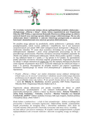Informacja prasowa ZBIERAJ Z KLASĄ W KORONOWIE! We wrześniu wystartowała kolejna edycja ogólnopolskiego projektu edukacyjno ekologicznego „Zbieraj z klasą”. Akcja, której organizatorem jest Organizacja Odzysku ERP Polska, a operatorem Remondis Electrorecyckling polega na zbiórce zużytych baterii oraz zużytego sprzętu elektrycznego i elektronicznego. Ma na celu edukowanie dzieci i młodzieży w zakresie właściwego postępowania ze zużytymi bateriami i akumulatorami oraz zużytym sprzętem elektronicznym. Do projektu mogą zgłaszać się przedszkola, szkoły podstawowe i gimnazja, szkoły ponadgimnazjalne, szkoły wyższe, publiczne i niepubliczne. Już w tym momencie zarejestrowanych jest ponad 1000 szkół zanngażowanych ekologicznie i dbających o środowisko naturalne. W czasie akcji uczestnicy dowiadują się, co należy zrobić z niebezpiecznymi odpadami i przez swoje postępowanie przyczyniają się do ich prawidłowego przetworzenia. Placówka oświatowa otrzymuje bezpłatnie pojemniki do zbiórki oraz plakaty informacyjno-edukacyjne. Szkoła zbiera punkty zgodnie z zasadą, że 1kg oddanych baterii to 1 punkt, a 1 kg sprzętu to 0,5 punktu. Za zgromadzone punkty placówka oświatowa otrzymuje nagrody gwarantowane. Nagrodami są e-karty na zakupy w sklepie internetowym empik.com oraz dla najlepiej zbierających placówek cenne nagrody od partnerów akcji (m.in. wycieczki edukacyjne do ciekawych miejsc w kraju i za granicą). Przystąpienie do projektu możliwe jest poprzez wypełnienie formularza rejestracyjnego na stronie www.zbierajzklasa.pl i podpisanie umowy z Operatorem. - Projekt „Zbieraj z Klasą” jest stałym elementem naszej edukacji ekologicznej. Chodzi nam o to, by stworzyć wśród dzieci i młodzieży nawyk selektywnego zbierania problematycznych odpadów takich jak baterie czy zużyty sprzęt elektryczny. Wiemy, że za przykładem dzieci idą rodzice. W ten sposób chcemy dotrzeć do całych rodzin - mówi dr Mikołaj E. Józefowicz, dyrektor generalny ERP Polska Organizacja Odzysku SEiE i Organizacja Odzysku Opakowań S.A. Tegoroczna edycja adresowana jest przede wszystkim do dzieci ze szkół podstawowych, przedszkolaków i ich rodziców. Ambasadorami akcji, którzy poprowadzą ekologiczne „Zabawy z klasą” są: aktywna mama - Justyna Tomańska z córką Zosią Tomańską - Totoszko, wokalista - Mariusz Totoszko oraz Konrad Czarkowski „KONY” (lalkarz medialny tworzący lalki typu muppets, finalista polskiej i brytyjskiej edycji „Mam Talent”) Kiedy byłam w podstawówce – a były to lata osiemdziesiąte – kultura recyklingu była powszechna i świetnie rozwinięta logistycznie. Oddawaliśmy butelki, wymienialiśmy książki przechodząc do następnej klasy i zbieraliśmy makulaturę. Dziś, kiedy na wszystko możemy sobie pozwolić i beztrosko wyrzucamy cała masę rzeczy, recykling ma inne oblicze i jest jeszcze ważniejszy. W związku z moim zaangażowaniem w projekt najlepszedladzieci.com zwracam rodzicom i dzieciom szczególną uwagę na ekologię 1 zachęca do przystąpienia do projektu Justyna Tomańska, ambasadorka akcji, prywatnie mama 5-letniej Zosi. Projekt uwzględnia organizację konferencji prasowych i programów artystycznych w 10 miastach i gminach na terenie całej Polski we wrześniu br. Wśród Patronów Honorowych znaleźli się: Susz k. Iławy, Kołobrzeg, Koronowo k. Bydgoszczy, Kazimierz Dolny, Sulejówek, Krynica - Zdrój, Włocławek, Pabianice, Gorzów Wielkopolski, Warszawa. Razem z dziećmi z całego kraju rok szkolny rozpoczął Ekorobot „Paluszek” - maskotka projektu, która edukuje i uczy dzieci jak dbać o środowisko. Lokalizacje i terminy wydarzeń można znaleźć na stronie www.zbierajklasa.pl . Wielki finał, połączony z koncertem gwiazd, dzieci i młodzieży planowany jest na kwiecień 2017 r. Wszystkie dzieci zbierające baterie i sprzęt elektroniczny razem ze swoją klasą lub szkołą będą mogły wziąć udział w konkursie, wygrywając cenne nagrody. Więcej informacji o projekcie na stronie: www.zbierajzklasa.pl Kontakt z mediami: Bee Music, tel. 501 734 330, [email protected] Organizator projektu: Operator projektu: Partnerzy: Sponsorzy nagród: 2