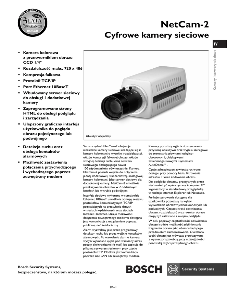 NetCam-2 Cyfrowe kamery sieciowe Kamery i serwery sieciowe IV � Kamera kolorowa z przetwornikiem obrazu CCD 1/4�� � Rozdzielczo�� maks. 720 x 486 � Kompresja falkowa � Protokó� TCP/IP � Port Ethernet 10BaseT � Wbudowany serwer sieciowy do obs�ugi 1 dodatkowej kamery � Zaprogramowane strony HTML do obs�ugi podgl�du i zarz�dzania � Ulepszony graficzny interfejs u�ytkownika do pogl�du obrazu pojedynczego lub podwójnego � Detekcja ruchu oraz obs�uga kontaktów alarmowych � Mo�liwo�� zestawienia po��czenia przychodz�cego i wychodz�cego poprzez zewn�trzny modem Obiektyw opcjonalny Seria urz�dze� NetCam-2 obejmuje niezale�ne kamery sieciowe sk�adaj�ce si� z: kamery kolorowej o wysokiej rozdzielczo�ci, uk�adu kompresji falkowej obrazu, uk�adu wizyjnej detekcji ruchu oraz serwera sieciowego obs�uguj�cego nawet �00 u�ytkowników równocze�nie. Kamera NetCam-2 posiada wej�cie do do��czenia jednej dodatkowej, standardowej, analogowej kamery kolorowej. Jako serwer sieciowy dla dodatkowej kamery, NetCam-2 umo�liwia przekazywanie obrazów w 2 oddzielnych kana�ach lub w trybie podwójnym. Interfejs sieciowy wykonany w standardzie Ethernet �0BaseT umo�liwia obs�ug� zestawu protoko�ów komunikacyjnych TCP/IP pozwalaj�cych na przesy�anie danych w sieciach wydzielonych oraz sieciach Intranet i Internet. Dzi�ki mo�liwo�ci do��czenia zewn�trznego modemu dost�pna jest komunikacja z urz�dzeniem poprzez publiczn� sie� telefoniczn�. Alarm wyzwalany jest przez programowy detektor ruchu lub przez wej�cie kontaktów alarmowych. Po wywo�aniu alarmu kamera wysy�a wykonane uj�cia pod wskazany adres poczty elektronicznej (e-mail) lub zapisuje do pliku na serwerze sieciowym przy u�yciu protoko�u FTP. Mo�liwa jest komunikacja poprzez sie� LAN lub zewn�trzny modem. Bosch Security Systems, bezpieczeństwo, na którym możesz polegać. IV–1 Kamery posiadaj� wyj�cia do sterowania przys�on� obiektywu oraz wyj�cia szeregowe do sterowania g�owicami uchylnoobrotowymi, obiektywami zmiennoogniskowymi i systemami AutoDome. Opcje zabezpiecze� zawieraj�: ochron� dost�pu przy pomocy has�a, filtrowanie adresów IP oraz kodowanie obrazu. Do podgl�du obrazów przesy�anych przez sie� mo�e by� wykorzystany komputer PC wyposa�ony w standardow� przegl�dark� w rodzaju Internet Explorer lub Netscape. Funkcje sterowania dost�pne dla u�ytkownika pozwalaj� na wybór wy�wietlania obrazów jednoekranowych lub podwójnych. Cz�stotliwo�� od�wie�ania obrazu, rozdzielczo�� oraz rozmiar obrazu mog� by� ustawiane z miejsca podgl�du. W celu poprawy cz�stotliwo�ci od�wie�ania obrazu istnieje mo�liwo�� zdefiniowania fragmentu obrazu jako obszaru b�d�cego przedmiotem zainteresowania. Okre�lona cz��� obrazu jest wówczas przekazywana z wyznaczon� jako�ci�, przy ni�szej jako�ci pozosta�ej cz��ci przesy�anego obrazu. DANE TECHNICZNE Kompatybilne przegl�darki: PARAMETRY ELEKTRYCZNE Model NetCam-2 LTC 0202/�� Znamionowe napi�cie zasilania / pobór mocy System �2 VDC lub 24 VAC; 5 W NTSC/PAL MS Internet Explorer wersja 5.0 lub nowsza. Netscape wersja 4.7 lub nowsza. Applet Java dla komputerów z systemem Windows. System operacyjny: Windows 98/ME/NT4/2000/XP. Parametry kamery i toru wizyjnego: Rozdzielczo�� obrazu: 720x486, 720x243, 360x243, �80x�2�, Przetwornik obrazu: CCD �/4� z wybieraniem mi�dzyliniowym. Liczba aktywnych elementów: Modele NTSC: 768 (poz.) x 492 (pion.). Modele PAL B: 752 (poz.) x 582 (pion.). Czu�o��: 3 lx. (przy przys�onie F�.2 i wspó�czynniku odbicia sceny 89%) 90x60. Kompresja obrazu: Kompresja: falkowa, typu progresywnego. Wspó�czynnik kompresji: �0:� 200:� (standardowo: 30:�). Cz�stotliwo�� od�wie�ania obrazu: maks. 30 ramek/s. Przepustowo��: Pr�dko�� transmisji: maks. �20 ramek/s. Pr�dko�� dekodowania: 2 �5 ramek/s. Rozdzielczo�� pozioma: 480 linii TV. Stosunek sygna� / szum: 46 dB. (zunifikowany filtr wa�ony zgodnie z zaleceniem CCIR 567) Zarz�dzanie i aktualizacja oprogramowania: Zdalna konfiguracja systemu. Pami�� typu Flash umo�liwiaj�ca aktualizacj� oprogramowania przez sie� LAN. ARW (AGC): �8 dB. Migawka elektroniczna: automatyczna, do �/�00 000 s. Balans bieli: automatyczne �ledzenie, 2500 8000 K. Zabezpieczenie: Ochrona przy pomocy has�a. Filtrowanie adresów IP. Korekcja apertury: symetryczna w poziomie i w pionie. Korekcja gamma: 0,45. Alarmy i wej�cia / wyj�cia: Detekcja ruchu (detekcja aktywno�ci). Automatyczne przesy�anie za po�rednictwem poczty elektronicznej (e-mail) i FTP. Wej�cia alarmowe: � z optoizolacj�, 5 �2 VDC, �0 20 mA. Wyj�cie wizyjne: � x BNC, � Vpp / 75 �. Wej�cia wizyjne: Wej�cie �, wybierane prze��cznikiem (wewn. / zewn.) BNC. � Vpp / 75 � lub wysoka impedancja. Pozosta�e funkcje: Mo�liwo�� wyboru obszaru podwy�szonej jako�ci obrazu. Regulacja jako�ci obrazu (�0 stopni kompresji). Okresowe przesy�anie obrazu na poczt� elektroniczn� (e-mail) lub serwer za po�rednictwem protoko�u FTP przy u�yciu sieci LAN lub automatycznego po��czenia dodzwanianiego. Tryb szaro�ci / progresywny / pojedynczych uj��. Obiektyw: mocowanie typu C/CS. Sterowanie przys�on�: �2 VDC, maks. 40 mA. Poziom sygna�u wizyjnego: �,0 Vpp. Parametry modu�u sieciowego: Wbudowany 32-bitowy procesor RISC. Porty szeregowe: � x RS-232 i � x RS-485 w zespole zacisków. RS-232 wykorzystywany do obs�ugi g�owicy uchylno-obrotowej, obiektywu zoom lub modemu PSTN. RS-485 wykorzystywany do obs�ugi g�owicy uchylno-obrotowej i obiektywu zoom. Pami�� typu Flash: 8 MB. Pami�� operacyjna (RAM): �6 MB. System operacyjny: wbudowany Linux. Kana�y wizyjne (wej�cia / wyj�cia): 