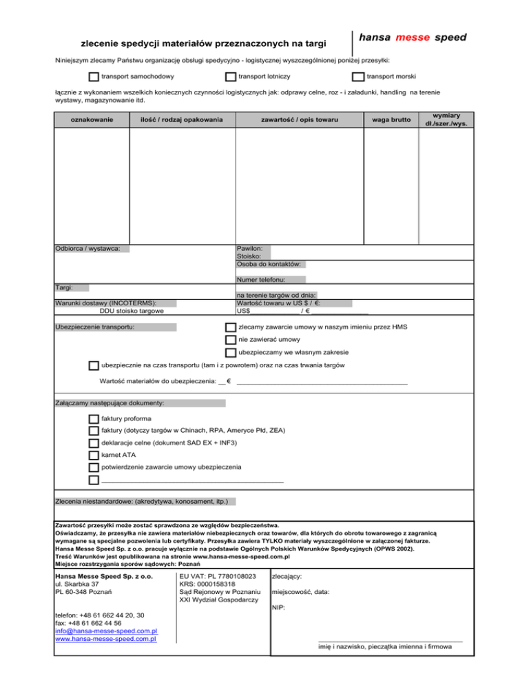 zlecenie spedycji materiałów przeznaczonych na targi hansa messe speed Niniejszym zlecamy Państwu organizację obsługi spedycyjno - logistycznej wyszczególnionej poniŜej przesyłki: transport samochodowy transport lotniczy transport morski łącznie z wykonaniem wszelkich koniecznych czynności logistycznych jak: odprawy celne, roz - i załadunki, handling na terenie wystawy, magazynowanie itd. oznakowanie ilość / rodzaj opakowania Odbiorca / wystawca: zawartość / opis towaru waga brutto wymiary dł./szer./wys. Pawilon: Stoisko: Osoba do kontaktów: Numer telefonu: Targi: Warunki dostawy (INCOTERMS): DDU stoisko targowe na terenie targów od dnia: Wartość towaru w US $ / €: US$_____________ / € _______________ Ubezpieczenie transportu: zlecamy zawarcie umowy w naszym imieniu przez HMS nie zawierać umowy ubezpieczamy we własnym zakresie ubezpiecznie na czas transportu (tam i z powrotem) oraz na czas trwania targów Wartość materiałów do ubezpieczenia: _____________________________ € _____________________________________________ Załączamy następujące dokumenty: faktury proforma faktury (dotyczy targów w Chinach, RPA, Ameryce Płd, ZEA) deklaracje celne (dokument SAD EX + INF3) karnet ATA potwierdzenie zawarcie umowy ubezpieczenia ________________________________________________ Zlecenia niestandardowe: (akredytywa, konosament, itp.) Zawartość przesyłki moŜe zostać sprawdzona ze względów bezpieczeństwa. Oświadczamy, Ŝe przesyłka nie zawiera materiałów niebezpiecznych oraz towarów, dla których do obrotu towarowego z zagranicą wymagane są specjalne pozwolenia lub certyfikaty. Przesyłka zawiera TYLKO materiały wyszczególnione w załączonej fakturze. Hansa Messe Speed Sp. z o.o. pracuje wyłącznie na podstawie Ogólnych Polskich Warunków Spedycyjnych (OPWS 2002). Treść Warunków jest opublikowana na stronie www.hansa-messe-speed.com.pl Miejsce rozstrzygania sporów sądowych: Poznań Hansa Messe Speed Sp. z o.o. ul. Skarbka 37 PL 60-348 Poznań EU VAT: PL 7780108023 KRS: 0000158318 Sąd Rejonowy w Poznaniu XXI Wydział Gospodarczy zlecający: miejscowość, data: NIP: telefon: +48 61 662 44 20, 30 fax: +48 61 662 44 56 [email protected] www.hansa-messe-speed.com.pl ______________________________________ imię i nazwisko, pieczątka imienna i firmowa