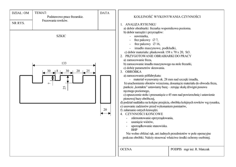 DATA Podstawowe prace frezarskie. Frezowanie rowków. KOLEJNOŚĆ WYKONYWANIA CZYNNOŚCI SZKIC 133 30 8 30 20 25 25 014,5 NR RYS. TEMAT: 7 DZIAŁ: OM 20 1. ANALIZA RYSUNKU a) dobór obrabiarki: frezarka wspornikowa pozioma. b) dobór narzędzi i przyrządów: - suwmiarka, - frez palcowy ∅ 7, - frez palcowy ∅ 16, - imadło maszynowe, podkładki, c) dobór materiału: płaskownik 158 x 70 x 20, St3. 2. PRZYGOTOWANIE OBRABIARKI DO PRACY a) zamocowanie freza, b) zamocowanie imadła maszynowego na stole frezarki, c) dobór parametrów skrawania. 3. OBRÓBKA a) zamocowanie półfabrykatu: - materiał wysuwamy ok. 28 mm nad szczęki imadła, b) uruchomienie obrotów wrzeciona, dosunięcie materiału do obwodu freza, punkcie „kontaktu” ustawiamy bazę – zerując skalę dźwigni posuwu ręcznego poziomego, c) opuszczenie stołu i przesunięcie o 45 mm nad powierzchnię i ustawienie pionowej bazy obróbczej, d) podział naddatku na kolejne przejścia, obróbka kolejnych rowków wg rysunku, e) usuwanie zadziorów przed wykonaniem pomiarów, f) załamanie ostrych krawędzi. 4. CZYNNOŚCI KOŃCOWE - zdemontowanie oprzyrządowania, - usunięcie wiórów, - uporządkowanie stanowiska. BHP Nie wolno zbliŜać rąk, ani Ŝadnych przedmiotów w pole operacyjne podczas obróbki. NaleŜy stosować właściwe środki ochrony osobistej. OCENA PODPIS mgr inŜ. R. Matczak