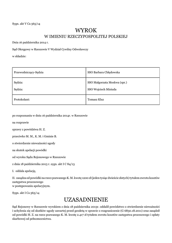 Sygn. akt V Ca 565/14 WYROK W IMIENIU RZECZYPOSPOLITEJ POLSKIEJ Dnia 16 października 2014 r. Sąd Okręgowy w Rzeszowie V Wydział Cywilny Odwoławczy w składzie: Przewodniczący-Sędzia SSO Barbara Chłędowska Sędzia: SSO Małgorzata Moskwa (spr.) Sędzia: SSO Wojciech Misiuda Protokolant: Tomasz Kluz po rozpoznaniu w dniu 16 października 2014r. w Rzeszowie na rozprawie sprawy z powództwa H. Z. przeciwko M. M., K. M. i Gminie B. o stwierdzenie nieważności ugody na skutek apelacji powódki od wyroku Sądu Rejonowego w Rzeszowie z dnia 18 października 2013 r. sygn. akt I C 84/13 I. oddala apelację, II. zasądza od powódki na rzecz pozwanego K. M. kwotę 1200 zł (jeden tysiąc dwieście złotych) tytułem zwrotu kosztów zastępstwa procesowego w postępowaniu apelacyjnym. Sygn. akt I Ca 565/14 UZASADNIENIE Sąd Rejonowy w Rzeszowie wyrokiem z dnia 18 października 2013r. oddalił powództwo o stwierdzenie nieważności i uchylenia się od skutków ugody zawartej przed geodetą w sprawie o rozgraniczenie (G 6830.18.2011) oraz zasądził od powódki H. Z. na rzecz pozwanego K. M. kwotę 2.417 zł tytułem zwrotu kosztów zastępstwa procesowego i opłaty skarbowej od pełnomocnictwa. Rozstrzygniecie powyższe zapadło po dokonaniu przez Sąd Rejonowy ustaleń faktycznych szczegółowo opisanych w uzasadnieniu zaskarżonego wyroku. Omawiając podstawę materialnoprawną orzeczenia sąd pierwszej instancji wskazał na art. 917 k.c. i 918 § 1 k.c. oraz 58 k.c., natomiast w odniesieniu do kosztów postępowania powołał się na art. 98 § 1 i 3 w zw. z art. 99 k.p.c. Od powyższego wyroku apelację wniosła powódka, domagając się uchylenia zaskarżonego wyroku i przekazania sprawy Sądowi Rejonowemu w Rzeszowie do ponownego rozpoznania. Zdaniem apelującej naruszono przepisy prawa materialnego, a to art. 918 k.c. przez jego błędną wykładnię i przyjęcie, że nie może on stanowić podstawy uchylenia się od skutków prawnych oświadczenia w przedmiocie zawarcia ugody pod wpływem błędu polegającego na tym, że faktycznie oddała pozwanym to co stanowiło jej własność. Według apelującej niedostatecznie wyjaśniono okoliczności sprawy, w tym w szczególności pominięto dowód z przesłuchania powódki w charakterze strony, w sytuacji gdy przesłuchanie to było niezbędne dla rozstrzygnięcia sprawy i występowała ona w sprawie bez profesjonalnego pełnomocnika, a jej zachowanie i oświadczenia w dniu 18 października 2013 roku wskazywały na to, że nie jest w stanie samodzielnie prowadzić przedmiotowej sprawy. Powódka zarzuciła naruszenie przepisów prawa materialnego, a do art. 88 § 2 k.c. poprzez przyjęcie, że nie wykazała ona w terminie roku od wykrycia błędu, że złożyła pozwanym oświadczenie o uchylenie się od skutków prawnych złożonego oświadczenia woli, w sytuacji gdy wyraźnie wskazała, że o okolicznościach uzasadniających uchylenie się od skutków prawnych oświadczenia woli złożonego pod wpływem błędu dowiedziała się po tygodniu od zawarcia ugody, a więc przed upływem roku od jego wykrycia. Jednocześnie apelująca zakwestionowała w apelacji obciążenie jej obowiązkiem zwrotu kosztów zastępstwa procesowego i opłaty skarbowej, bez uwzględnienia wyjątkowo trudnej sytuacji finansowej uzasadniającej nie obciążanie jej żadnymi kosztami. Sąd Okręgowy rozważył co następuje: W pierwszej kolejności należy wskazać, że wobec prawidłowo ustalonego stanu faktycznego, opartego na wszechstronnie rozważonym materiale dowodowym, sąd drugiej instancji przyjął go za własny. Stwierdzić należy, wbrew zarzutom apelacji, Sąd Rejonowy trafnie, oceniając podstawę prawną, uznał, że ugoda zawarta przed geodetą, ma zgodnie z postanowieniami art. 31 ust. 4 ustawy z dnia 17 maja 1989 r. - Prawo geodezyjne i kartograficzne moc ugody sądowej oraz ma postać umowy, do której stosuje się poza przepisami art. 917 i 918 k.c. ogólne przepisy prawa cywilnego dotyczące zawarcia umowy, w tym odnoszące się do wad oświadczenia woli, a także, że zanegowanie ważności ugody może też nastąpić w razie zaistnienia okoliczności z art. 58 k.c. Przepis art. 918 k.p.c stanowi, że uchylenie się od skutków prawnych ugody zawartej pod wpływem błędu jest dopuszczalne tylko wtedy, gdy błąd dotyczy stanu faktycznego, który według treści ugody obie strony uważały za niewątpliwy, a spór albo niepewność nie byłyby powstały, gdyby w chwili zawarcia ugody strony wiedziały o prawdziwym stanie rzeczy, przy czym nie można uchylić się od skutków prawnych ugody z powodu odnalezienia dowodów, co do roszczeń, których ugoda dotyczy, chyba, że została zawarta w złej wierze. Możliwość uchylenia się od skutków prawnych ugody jest więc uzależniona od jednoczesnego spełnienia dwóch przesłanek. Pierwsza wymaga, aby błąd dotyczył stanu faktycznego, który strony uważały według treści ugody za niewątpliwy. Należy ją rozumieć w ten sposób, że stan faktyczny tworzący określone roszczenia dla stron, czy będący podstawą roszczeń był fałszywie uznawany za istniejący między stronami albo mylne przekonanie o określonym fakcie było dla stron powodem i przyczyną zawarcia ugody. W doktrynie przywołuje się dla zobrazowania tej przesłanki stan, w którym strony zawierają ugodę w zakresie zobowiązania z umowy sprzedaży, w sytuacji, gdy umowa ta była nieważna (W.Czachórski w Prawo zobowiązań w zarysie W-wa 1968, s. 690) albo, gdy strony zawierają ugodę w przedmiocie zapisu, w przekonaniu, że roszczenie wynika z zapisu w testamencie, tymczasem testament okazuje się nieważny (Szpunar w Z problematyki s.14), czy w końcu strony wiodące spór, co do wysokości zobowiązania, działając w przekonaniu o istnienia tego zobowiązania, zawierają ugodę (Z. Radwański w Zobowiązania 1998, s.297). W judykaturze prezentowane jest jednolite stanowisko w zakresie rozumienia błędu, co do