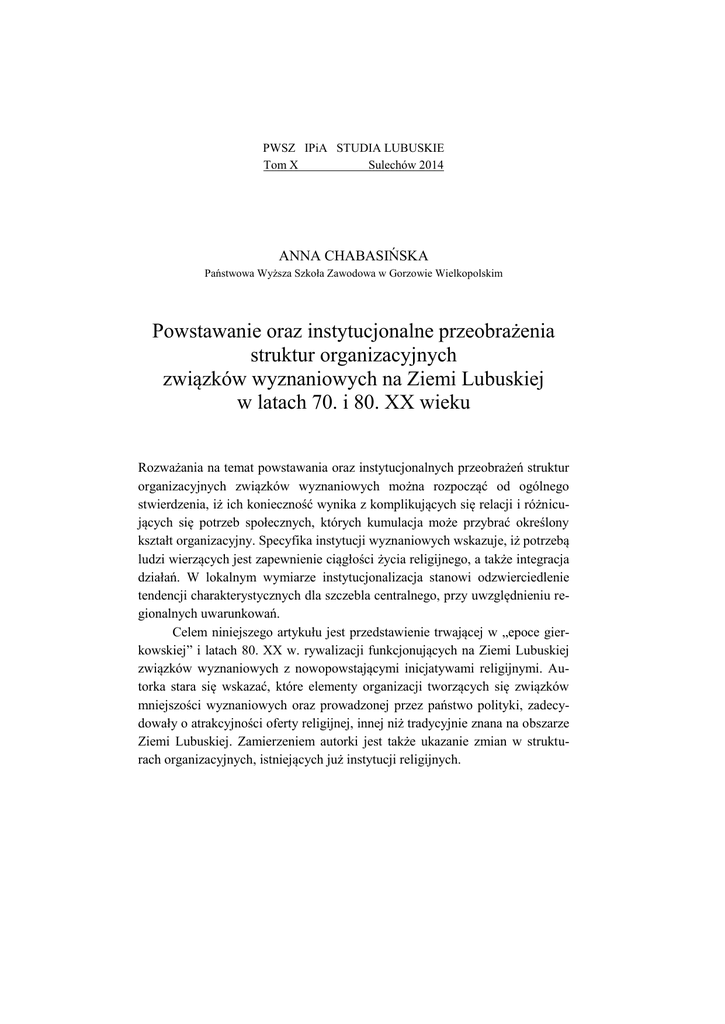 PWSZ IPiA STUDIA LUBUSKIE Tom X Sulechów 2014 ANNA CHABASIŃSKA Państwowa Wyższa Szkoła Zawodowa w Gorzowie Wielkopolskim Powstawanie oraz instytucjonalne przeobrażenia struktur organizacyjnych związków wyznaniowych na Ziemi Lubuskiej w latach 70. i 80. XX wieku Rozważania na temat powstawania oraz instytucjonalnych przeobrażeń struktur organizacyjnych związków wyznaniowych można rozpocząć od ogólnego stwierdzenia, iż ich konieczność wynika z komplikujących się relacji i różnicujących się potrzeb społecznych, których kumulacja może przybrać określony kształt organizacyjny. Specyfika instytucji wyznaniowych wskazuje, iż potrzebą ludzi wierzących jest zapewnienie ciągłości życia religijnego, a także integracja działań. W lokalnym wymiarze instytucjonalizacja stanowi odzwierciedlenie tendencji charakterystycznych dla szczebla centralnego, przy uwzględnieniu regionalnych uwarunkowań. Celem niniejszego artykułu jest przedstawienie trwającej w „epoce gierkowskiej” i latach 80. XX w. rywalizacji funkcjonujących na Ziemi Lubuskiej związków wyznaniowych z nowopowstającymi inicjatywami religijnymi. Autorka stara się wskazać, które elementy organizacji tworzących się związków mniejszości wyznaniowych oraz prowadzonej przez państwo polityki, zadecydowały o atrakcyjności oferty religijnej, innej niż tradycyjnie znana na obszarze Ziemi Lubuskiej. Zamierzeniem autorki jest także ukazanie zmian w strukturach organizacyjnych, istniejących już instytucji religijnych. ANNA CHABASIŃSKA 212 I Społeczno-kulturowa dyferencjacja lat 70. i 80. w niedużym stopniu wpłynęła na dekoncentrację rynku religijnego Ziemi Lubuskiej. Jej peryferyjne usytuowanie względem większych ośrodków miejskich ograniczało wpływ nowych ruchów religijnych na wyznaniowe wybory mieszkańców. Należy zwrócić uwagę, iż nowopowstające związki wyznaniowe organizowały swoje struktury dopiero w drugiej połowie lat 80. w oparciu o niewielkie grupy wiernych, często powiązane rodzinnymi więzami1. Na tym tle wyróżniali się jedynie działający od 1986 r. na terenie Sarbiewa wyznawcy Ewangelicznego Związku Braterskiego, którzy po połączeniu w 1988 r. z gorzowską placówką, stali się drugim po województwie koszalińskim największym skupiskiem wiernych (w sumie około 30 osób)2. Niewielki udział nowych ruchów religijnych w lokalnym rynku wyznaniowym spowodował, iż międzywyznaniowa konkurencja zawężona została głównie do współzawodnictwa z dotychczasowymi uczestnikami przestrzeni religijnej, z których najbardziej wymagającym rywalem pozostawał Kościół rzymskokatolicki. Realizowane przez niego, o szerokim zasięgu społecznym, projekty aktywizacji katolickich wiernych wymuszały na mniejszych związkach wyznaniowych konieczności przedstawienia kontroferty, która z jednej strony wyrażałaby ich unikatowość, z drugiej zaś, stwarzałaby wśród wiernych poczucie współuczestnictwa w kreowaniu tożsamości wyznaniowej mieszkańców Ziemi Lubuskiej. W wymiarze Ziemi Lubuskiej o dekoncentracji rynku religijnego, można mówić głównie w kontekście dekompozycji federacyjnej struktury Zjednoczo1 W latach 80. odnotowani zostali przez lubuską administrację wyznaniową wyznawcy m.in. Kościoła Jezusa Chrystusa Świętych Dni Ostatnich, Archiwum Państwowe w Gorzowie Wlkp. (dalej: APG), Urząd Wojewódzki w Gorzowie Wlkp.(dalej: UWG), sygn. 1377, Zestawienie zbiorcze dot. liczby księży oraz kościołów, kaplic wyznań nierzymskokatolickich, działających na terenie woj. zielonogórskiego wg stanu na 1.10.1986 r., k. 4, Nowoapostolskiego Stowarzyszenia Wyznaniowego, Jednoty Braci Polskich, APG, UWG, sygn. 1437, Informacja o zborze „Chrystianie”, k. 21, czy Stowarzyszenia Buddyjskiego Karma Kagyu w Polsce, APG, UWG, sygn. 1445, Pismo Stowarzyszenia Buddyjskiego Karma Kagyu w Polsce do UW WdSW w Gorzowie Wlkp., 23.03.1987 r., k. 15. 2 APG, UWG, sygn. 1391, Pismo Rady Starszych Ewangelicznego Związku Braterskiego do UW WdSW w Gorzowie, 06 I 1988 r., k. 8; ibidem, Pismo Rady Starszych Ewangelicznego Związku Braterskiego do UW WdSW w Gorzowie, 3.10.1988 r., k. 14; APG, UWG, sygn. 1437, Informacja o zborze „Chrystianie”, k. 21. Powstawanie oraz instytucjonalne przeobrażenia struktur organizacyjnych… 213 nego Kościoła Ewangelicznego (dalej: ZKE). Instytucjonalne ożywienie, jakie miało miejsce w latach 80. skutkowało usankcjonowaniem wieloletnich dążeń Kościołów członkowskich (na Ziemi Lubuskiej byli to głównie wyznawcy Kościoła Chrześcijan Wiary Ewangelicznej (dalej: KCHWE), które do tego czasu, pod przymusem funkcjonowały w ramach jednej organizacji religijnej3. W wyniku doktrynalnych podziałów w 1987 r. wyodrębniły się na Ziemi Lubuskiej trzy zbory Chrześcijańskiej Wspólnoty Zielonoświątkowej4 (dalej: CHWZ): w Lubsku (54 wyznawców)5, Nowej Soli (80 wyznawców) i Kostrzynie nad Odrą (17 wyznawców)6. Z kolei w 1988 r. Zarząd KCHWE utworzył zbór w Gorzowie Wlkp. i placówkę w Barlinku7. Jednocześnie rozpoczął się naturalny proces łączenia mniejszych grup religijnych o podobnych aksjologicznych odniesieniach, w większe organizmy instytucjonalne. W ten sposób w styczniu 1985 r. wierni Kościoła Chrystusowego z Żar (blisko 100 wyznawców), po wyjeździe z województwa przewodniczącego zboru przeszli do zielonoświątkowców8. Podobnie w 1987 r. przyłączyli się do zboru w Nowej Soli wierni Chrześcijan Bez Osobliwego Wyznania (50 osób), tworząc prężną wspólnotę, z własnym przełożonym zboru, domem modlitwy i szkółką niedzielną9. Rok później nowosolski zbór uchwałą członków zboru wystąpił z CHWZ i przystąpił do Kościoła Zielonoświątkowego10. Ten ostatni w drugiej połowie 1988 r. na terenie 3 Proces rozpadu tego sztucznego tworu organizacyjnego rozpoczął się w 1983 r., kiedy to na skutek doktrynalnych sporów odłączyła się grupa zborów, tworz