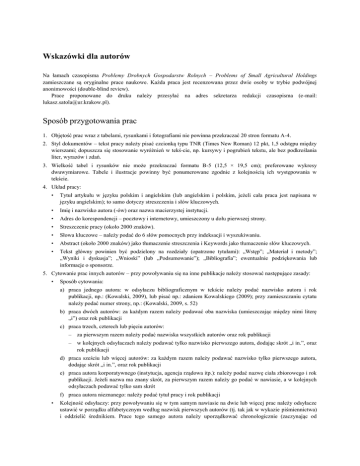 Wskazówki dla autorów Na łamach czasopisma Problemy Drobnych Gospodarstw Rolnych – Problems of Small Agricultural Holdings zamieszczane są oryginalne prace naukowe. Każda praca jest recenzowana przez dwie osoby w trybie podwójnej anonimowości (double-blind review). Prace proponowane do druku należy przesyłać na adres sekretarza redakcji czasopisma (e-mail: [email protected]). Sposób przygotowania prac 1. Objętość prac wraz z tabelami, rysunkami i fotografiami nie powinna przekraczać 20 stron formatu A-4. 2. Styl dokumentów – tekst pracy należy pisać czcionką typu TNR (Times New Roman) 12 pkt, 1,5 odstępu między wierszami; dopuszcza się stosowanie wyróżnień w tekście, np. kursywy i pogrubień tekstu, ale bez podkreślania liter, wyrazów i zdań. 3. Wielkość tabel i rysunków nie może przekraczać formatu B-5 (12,5 × 19,5 cm); preferowane wykresy dwuwymiarowe. Tabele i ilustracje powinny być ponumerowane zgodnie z kolejnością ich występowania w tekście. 4. Układ pracy: • Tytuł artykułu w języku polskim i angielskim (lub angielskim i polskim, jeżeli cała praca jest napisana w języku angielskim); to samo dotyczy streszczenia i słów kluczowych. • Imię i nazwisko autora (-ów) oraz nazwa macierzystej instytucji. • Adres do korespondencji – pocztowy i internetowy, umieszczony u dołu pierwszej strony. • Streszczenie pracy (około 2000 znaków). • Słowa kluczowe – należy podać do 6 słów pomocnych przy indeksacji i wyszukiwaniu. • Abstract (około 2000 znaków) jako tłumaczenie streszczenia i Keywords jako tłumaczenie słów kluczowych. • Tekst główny powinien być podzielony na rozdziały (opatrzone tytułami): „Wstęp”; „Materiał i metody”; „Wyniki i dyskusja”; „Wnioski” (lub „Podsumowanie”); „Bibliografia”; ewentualnie podziękowania lub informacje o sponsorze. 5. Cytowanie prac innych autorów – przy powoływaniu się na inne publikacje należy stosować następujące zasady: • Sposób cytowania: a) praca jednego autora: w odsyłaczu bibliograficznym w tekście należy podać nazwisko autora i rok publikacji, np.: (Kowalski, 2009), lub pisać np.: zdaniem Kowalskiego (2009); przy zamieszczaniu cytatu należy podać numer strony, np.: (Kowalski, 2009, s. 52) b) praca dwóch autorów: za każdym razem należy podawać oba nazwiska (umieszczając między nimi literę „i”) oraz rok publikacji c) praca trzech, czterech lub pięciu autorów: – za pierwszym razem należy podać nazwiska wszystkich autorów oraz rok publikacji – w kolejnych odsyłaczach należy podawać tylko nazwisko pierwszego autora, dodając skrót „i in.”, oraz rok publikacji d) praca sześciu lub więcej autorów: za każdym razem należy podawać nazwisko tylko pierwszego autora, dodając skrót „i in.”, oraz rok publikacji e) praca autora korporatywnego (instytucja, agencja rządowa itp.): należy podać nazwę ciała zbiorowego i rok publikacji. Jeżeli nazwa ma znany skrót, za pierwszym razem należy go podać w nawiasie, a w kolejnych odsyłaczach podawać tylko sam skrót f) praca autora nieznanego: należy podać tytuł pracy i rok publikacji • Kolejność odsyłaczy: przy powoływaniu się w tym samym nawiasie na dwie lub więcej prac należy odsyłacze ustawić w porządku alfabetycznym według nazwisk pierwszych autorów (tj. tak jak w wykazie piśmiennictwa) i oddzielić średnikiem. Prace tego samego autora należy uporządkować chronologicznie (zaczynając od najstarszych, a kończąc na pracach znajdujących się w druku); nazwisko autora podać tylko raz, a dla kolejnych prac wpisać tylko datę 6. Zapis bibliografii* – wykaz piśmiennictwa należy zestawić w porządku alfabetycznym w następujący sposób: • Książka: nazwisko (-a) autora (-ów), inicjały imion; rok wydania (jeżeli z danego roku pochodzi więcej prac tego samego autora, po roku należy dodać oznaczenie literowe poszczególnych pozycji: a, b, c itd.); tytuł pracy; nazwa miejsca wydania i wydawnictwa • Warianty: a) książka napisana pod redakcją: nazwisko (-a) redaktora (-ów), inicjały imion; skrót „red.” w nawiasie okrągłym; rok wydania; dalsze informacje jw. b) rozdział w pracy zbiorowej: nazwisko (-a) autora (-ów), inicjały imion; rok wydania; tytuł rozdziału; informacja o książce, z której pochodzi rozdział (litera „W”; dwukropek; inicjały imion i nazwisko (-a) redaktora (-ów), skrót „red.” w nawiasie okrągłym; tytuł książki; zakres stron podany w nawiasie okrągłym; nazwa miejsca wydania i wydawnictwa) Kata, R. (2011). Ekonomiczne i instytucjonalne czynniki kształtujące powiązania finansowe gospodarstw rolniczych z bankami. Rzeszów: Wydawnictwo Uniwersytetu Rzeszowskiego. Czapiński, J., Panek, T. (red.) (2014). Diagnoza Społeczna 2013. Warunki i jakość życia Polaków. Warszawa: Ministerstwo Pracy i Polityki Społecznej, Centrum Rozwoju Zasobów Ludzkich. Penczar, M. (2014). Ocena poziomu edukacji finansowej w Polsce na tle krajów UE, W: M. Penczar (red.), Rola edukacji finansowej w ograniczaniu wykluczenia finansowego (s. 11–26). Gdańsk: Fundacja Rozwoju Uniwersytetu Gdańskiego. • Artykuł w czasopiśmie: nazwisko (-a) autora (-ów), inicjały imion; rok wydania; tytuł pracy; tytuł czasopisma oraz a) numer tomu/rocznika (zapisany kursywą), numer zeszytu i numery stron w danym zeszycie – w przypadku czasopism, w których każdy kolejny zeszyt w obrębie jednego rocznika ma osobną numerację stron (tzn. w każdym zeszycie pierwsza strona nosi numer 1) b) numer tomu/rocznika (zapisany kursywą) i numery stron w ramach tomu – w przypadku czasopism, w których kolejne zeszyty w obrębie jednego rocznika nie mają osobnej numeracji stron (tzn. pierwsza strona w danym zeszycie nosi numer kolejny po numerze ostatniej strony w zeszycie poprzednim) Uwaga 1: Jeżeli artykuł ma numer DOI (Digital Object Identifier), należy podać go na końcu zapisu bibliog