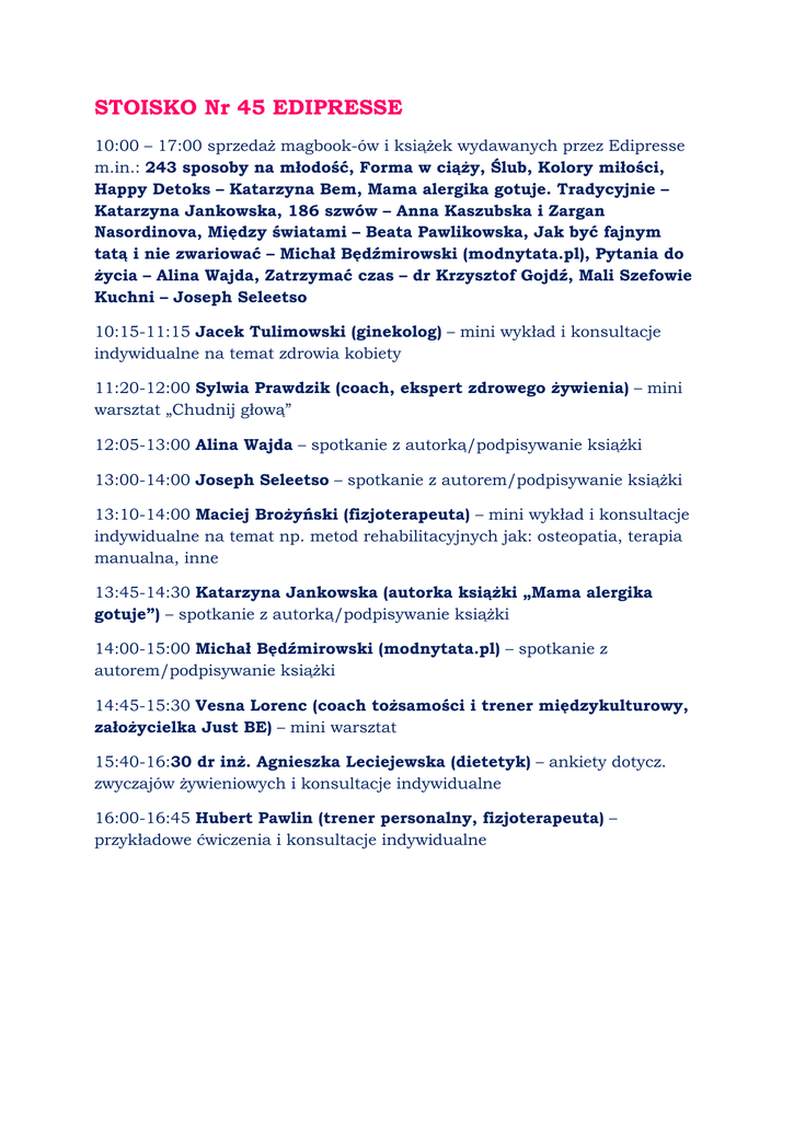 STOISKO Nr 45 EDIPRESSE 10:00 – 17:00 sprzedaż magbook-ów i książek wydawanych przez Edipresse m.in.: 243 sposoby na młodość, Forma w ciąży, Ślub, Kolory miłości, Happy Detoks – Katarzyna Bem, Mama alergika gotuje. Tradycyjnie – Katarzyna Jankowska, 186 szwów – Anna Kaszubska i Zargan Nasordinova, Między światami – Beata Pawlikowska, Jak być fajnym tatą i nie zwariować – Michał Będźmirowski (modnytata.pl), Pytania do życia – Alina Wajda, Zatrzymać czas – dr Krzysztof Gojdź, Mali Szefowie Kuchni – Joseph Seleetso 10:15-11:15 Jacek Tulimowski (ginekolog) – mini wykład i konsultacje indywidualne na temat zdrowia kobiety 11:20-12:00 Sylwia Prawdzik (coach, ekspert zdrowego żywienia) – mini warsztat „Chudnij głową” 12:05-13:00 Alina Wajda – spotkanie z autorką/podpisywanie książki 13:00-14:00 Joseph Seleetso – spotkanie z autorem/podpisywanie książki 13:10-14:00 Maciej Brożyński (fizjoterapeuta) – mini wykład i konsultacje indywidualne na temat np. metod rehabilitacyjnych jak: osteopatia, terapia manualna, inne 13:45-14:30 Katarzyna Jankowska (autorka książki „Mama alergika gotuje”) – spotkanie z autorką/podpisywanie książki 14:00-15:00 Michał Będźmirowski (modnytata.pl) – spotkanie z autorem/podpisywanie książki 14:45-15:30 Vesna Lorenc (coach tożsamości i trener międzykulturowy, założycielka Just BE) – mini warsztat 15:40-16:30 dr inż. Agnieszka Leciejewska (dietetyk) – ankiety dotycz. zwyczajów żywieniowych i konsultacje indywidualne 16:00-16:45 Hubert Pawlin (trener personalny, fizjoterapeuta) – przykładowe ćwiczenia i konsultacje indywidualne