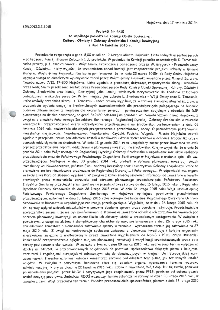 Hajnówka, dnia 17 kwietnia 2015r. BGR.0012.3.3.2015 Protokół Nr 4/15 ze wspólnego posiedzenia Komisji Opieki Społecznej, Kultury, Oświaty i Ochrony Środowiska i Komisji Rewizyjnej z dnia 14 kwietnia 2015 r. Posiedzenie rozpoczęto o godz. 8,00 w sali nr 12 Urzędu Miasta Hajnówka. Lista radnych uczestniczących w posiedzeniu Komisji stanowi Załącznik 1 do protokołu. W posiedzeniu Komisji ponadto uczestniczyli: K. Tomaszukradca prawny, p. L. Smoktunowicz - Wójt Gminy. Prowadzenie posiedzenia przejął W. Grygoruk - Przewodniczący Komisji, Oświaty.... który wyjaśnił, że przedmiotem obrad komisji jest rozpatrzenie projektu uchwały w sprawie skargi na Wójta Gminy Hajnówka. Następnie poinformował, że w dniu 23 marca 2015r. do Rady Gminy Hajnówka wpłynęła skarga na nienależyte wykonywanie zadań przez Wójta Gminy Hajnówka wniesiona przez Minerał Sp. z o.o. Nowoberezowo 7/12; 17-200 Hajnówka, która zgodnie z procedurą dotyczącą rozpatrywania skarg i wniosków przez Radę Gminy przekazana została przez Przewodniczącego Rady Komisji Opieki Społecznej, Kultury, Oświaty i Ochrony Środowiska oraz Komisji Rewizyjnej jako komisji właściwych merytorycznie do zbadania zasadności podnoszonych w skardze zarzutów. W tym miejscu głos zabrała L. Smotunowicz - Wójt Gminy oraz K. Tomaszuk, które omówiły przedmiot skargi. K. Tomaszuk - radca prawny wyjaśniła, że w sprawie z wniosku Minerał sp. z o.o. w przedmiocie wydania decyzji o środowiskowych uwarunkowaniach dla przedsięwzięcia polegającego na budowie budynku chlewni macior z miejscem dla kwarantanny zwierząt i pomieszczeniem socjalnym o obsadzie 86 DJP planowanego na działce oznaczonej nr geod. 342/60 położonej na gruntach wsi Nowoberezowo, gmina Hajnówka, z uwagi na stanowisko Państwowego Inspektora Sanitarnego i Regionalnej Dyrekcji Ochrony Środowiska w zakresie konieczności przeprowadzenia oceny oddziaływania przedsięwzięcia na środowisko, postanowieniem z dnia 01 kwietnia 2014 roku stwierdziła obowiązek przeprowadzenia przedmiotowej oceny. O prowadzonym postępowaniu mieszkańcy miejscowości Nowoberezowo, Nowokornino, Czyżyki, Puciska, Wygoda i Miasta Hajnówka zostali zgodnie z przepisami prawa powiadomieni zostali o możliwości udziału społeczeństwa w ochronie środowiska oraz o ocenach oddziaływania na środowisko. W dniu 12 grudnia 2014 roku uzupełniony został przez inwestora wniosek poprzez przedstawienie raportu oddziaływania planowanej inwestycji na środowisko. Kolejno wyjaśniła, że w dniu 16 grudnia 2014 roku Wójt wystąpił do Regionalnej Dyrekcji Ochrony Środowiska o uzgodnienie warunków realizacji przedsięwzięcia oraz do Państwowego Powiatowego Inspektora Sanitarnego w Hajnówce o wydanie opinii dla ww. przedsięwzięcia. Następnie w dniu 30 grudnia 2014 roku protest w sprawie planowanej inwestycji złożyli mieszkańcy wsi Nowoberezowo, państwo Ewa i Andrzej Keczyńscy oraz Towarzystwo Ochrony Krajobrazu, które to stanowisko zostało niezwłocznie przekazane do Regionalnej Dyrekcji... i Państwowego.... W odpowiedzi ww. organy wezwały Inwestora do złożenia wyjaśnień. W związku z koniecznością uzyskania informacji od Inwestora w kwestii stawianych przez mieszkańców zarzutów pod adresem planowanego przedsięwzięcia, Państwowy Powiatowy Inspektor Sanitarny przedłużył termin załatwienia przedmiotowej sprawy do dnia 16 lutego 2015 roku, a Regionalny Dyrektor Ochrony Środowiska do dnia 28 lutego 2015 roku. W dniu 12 lutego 2015 roku Wójt uzyskał opinię Państwowego Powiatowego Inspektora Sanitarnego w Hajnówce opiniującą pozytywnie przedmiotowe przedsięwzięcia, natomiast w dniu 18 lutego 2015 roku wpłynęło postanowienie Regionalnego Dyrektora Ochrony Środowiska w Białymstoku uzgadniające realizację przedsięwzięcia. Wyjaśniła, że w dniu 26 lutego 2015 roku do akt sprawy wpłynął wniosek mieszkańców o ponowne zbadanie sprawy przez powołane instytucje. Przedstawiciele społeczeństwa zarzucili, że nie byli poinformowani o stanowisku Inwestora odnośnie ich zarzutów kierowanych pod adresem planowanej inwestycji, co uniemożliwiło ich aktywny udział w prowadzonym postępowaniu. W związku z powyższym, z uwagi na złożony i skomplikowany charakter sprawy, postanowieniem z dnia 26 lutego 2015 roku zawiadomiono Inwestora o niemożności załatwienia sprawy w terminie i wyznaczono termin jej załatwienia na 27 maja 2015 roku. Z uwagi na kontrowersje społeczne związane z planowaną inwestycją i kolejne argumenty mieszkańców związane z wystosowanymi przez Inwestora wyjaśnieniami do RDOŚ i PPI5, organ stwierdził konieczność przeprowadzenia oględzin miejsca planowanej inwestycji i weryfikacji przedstawianych przez obie strony postępowania okoliczności. W związku z tym na dzień 09 marca 2015 roku wyznaczono termin oględzin na działce nr 342/60. Po przeprowadzonych oględzinach do protokołu społeczeństwo dołączyło pismo z kolejnymi zarzutami i regulacjami europejskimi odnoszącymi się do obowiązujących w krajach Unii Europejskiej norm zapachowych. Inwestor natomiast odmówił komentarza zarówno pod adresem tego pisma, jak też samych ustaleń oględzin. W związku z powyższym, konieczne stało się, zdaniem organu, wyznaczenie terminu rozprawy administracyjnej, który ustalono na 22 kwietnia 2015 roku. Zdaniem Inwestora, Wójt dopuścił się zwłoki, ponieważ po uzgodnieniu projektu przez RDOŚ i pozytywnym jego zaopiniowaniu przez PPI5, powinien był automatycznie wydać decyzję pozytywną Jednakże RDOŚ wyznaczył termin zakończenia sprawy na dzień 28 lutego 2015 roku, w związku z czym Wójt przedłużył ten termin. Ponadto przedstawiciele społeczeństwa, pismem z dnia 26 lutego 2015 roku zakwestionowali uzgodnienia jako nierzetelne i wydane bez ich aktywnego udziału w sprawie. Biorąc pod uwagę fakt, że Mieszkańcy okolicznych wsi wnosili o ponowne rozpatrzenie sprawy przez 