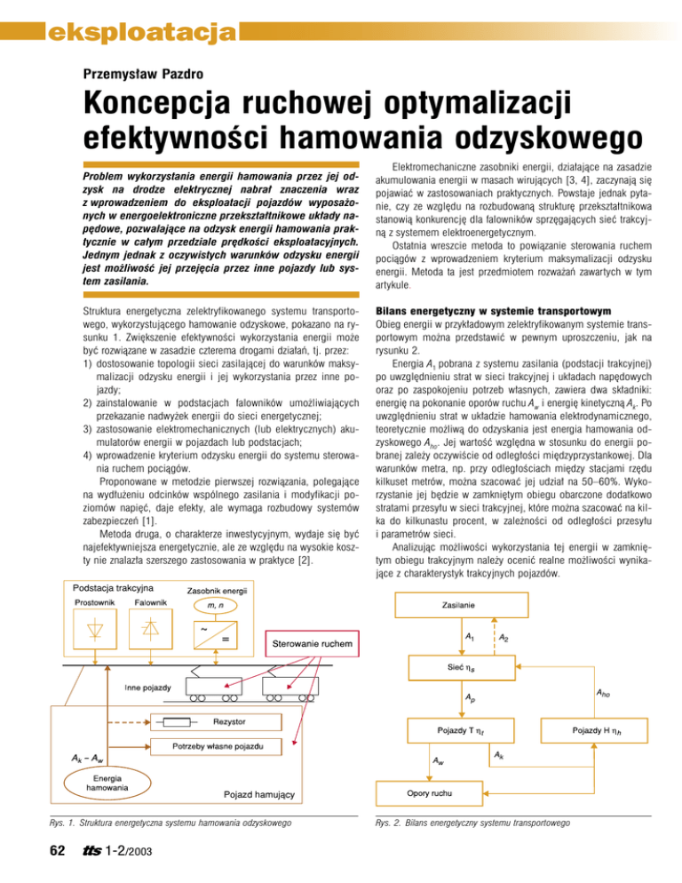 eksploatacja Przemysław Pazdro Koncepcja ruchowej optymalizacji efektywności hamowania odzyskowego Problem wykorzystania energii hamowania przez jej odzysk na drodze elektrycznej nabrał znaczenia wraz z wprowadzeniem do eksploatacji pojazdów wyposażonych w energoelektroniczne przekształtnikowe układy napędowe, pozwalające na odzysk energii hamowania praktycznie w całym przedziale prędkości eksploatacyjnych. Jednym jednak z oczywistych warunków odzysku energii jest możliwość jej przejęcia przez inne pojazdy lub system zasilania. Struktura energetyczna zelektryfikowanego systemu transportowego, wykorzystującego hamowanie odzyskowe, pokazano na rysunku 1. Zwiększenie efektywności wykorzystania energii może być rozwiązane w zasadzie czterema drogami działań, tj. przez: 1) dostosowanie topologii sieci zasilającej do warunków maksymalizacji odzysku energii i jej wykorzystania przez inne pojazdy; 2) zainstalowanie w podstacjach falowników umożliwiających przekazanie nadwyżek energii do sieci energetycznej; 3) zastosowanie elektromechanicznych (lub elektrycznych) akumulatorów energii w pojazdach lub podstacjach; 4) wprowadzenie kryterium odzysku energii do systemu sterowania ruchem pociągów. Proponowane w metodzie pierwszej rozwiązania, polegające na wydłużeniu odcinków wspólnego zasilania i modyfikacji poziomów napięć, daje efekty, ale wymaga rozbudowy systemów zabezpieczeń [1]. Metoda druga, o charakterze inwestycyjnym, wydaje się być najefektywniejsza energetycznie, ale ze względu na wysokie koszty nie znalazła szerszego zastosowania w praktyce [2]. Elektromechaniczne zasobniki energii, działające na zasadzie akumulowania energii w masach wirujących [3, 4], zaczynają się pojawiać w zastosowaniach praktycznych. Powstaje jednak pytanie, czy ze względu na rozbudowaną strukturę przekształtnikowa stanowią konkurencję dla falowników sprzęgających sieć trakcyjną z systemem elektroenergetycznym. Ostatnia wreszcie metoda to powiązanie sterowania ruchem pociągów z wprowadzeniem kryterium maksymalizacji odzysku energii. Metoda ta jest przedmiotem rozważań zawartych w tym artykule. Bilans energetyczny w systemie transportowym Obieg energii w przykładowym zelektryfikowanym systemie transportowym można przedstawić w pewnym uproszczeniu, jak na rysunku 2. Energia A1 pobrana z systemu zasilania (podstacji trakcyjnej) po uwzględnieniu strat w sieci trakcyjnej i układach napędowych oraz po zaspokojeniu potrzeb własnych, zawiera dwa składniki: energię na pokonanie oporów ruchu Aw i energię kinetyczną Ak. Po uwzględnieniu strat w układzie hamowania elektrodynamicznego, teoretycznie możliwą do odzyskania jest energia hamowania odzyskowego Aho. Jej wartość względna w stosunku do energii pobranej zależy oczywiście od odległości międzyprzystankowej. Dla warunków metra, np. przy odległościach między stacjami rzędu kilkuset metrów, można szacować jej udział na 50–60%. Wykorzystanie jej będzie w zamkniętym obiegu obarczone dodatkowo stratami przesyłu w sieci trakcyjnej, które można szacować na kilka do kilkunastu procent, w zależności od odległości przesyłu i parametrów sieci. Analizując możliwości wykorzystania tej energii w zamkniętym obiegu trakcyjnym należy ocenić realne możliwości wynikające z charakterystyk trakcyjnych pojazdów. Podstacja trakcyjna A1 A2 Aho Ap Aw Ak Pojazd hamuj¹cy Rys. 1. Struktura energetyczna systemu hamowania odzyskowego 62 1-2/2003 Rys. 2. Bilans energetyczny systemu transportowego eksploatacja Aby umieścić rozważania w realnych warunkach, można się posłużyć przykładowymi charakterystykami dla współczesnych pociągów metra wyposażonych w falownikowe układy napędowe. Przebiegi prądów mierzone na odbierakach prądu dla takich pojazdów pokazano na rysunku 3. Przyjmując wyizolowany odcinek zasilania pomiędzy podstacjami zasilającymi (rys. 4) i jedynie dwa pojazdy, z których jeden pobiera energię a drugi hamuje, można stworzyć teoretyczny wzorzec wymiany energii pomiędzy tymi pojazdami. Przenosząc przebiegi z rysunku 3 w dziedzinę czasu uzyskuje się przebiegi jak na rysunku 5. Widać wyraźnie, że ze względu na asymetrię przebiegów prądów rozruchu i hamowania, zbilansowanie się chwilowych wartości prądów tych dwóch pojazdów może nastąpić tylko w pojedynczych punktach czasowych. Ważny z energetycznego punktu widzenia jest jednak nie bilans chwilowy, ale suma tych przebiegów odniesiona do czasu [As]. Można to przedstawić jako wykres różnicy prądów pobieranych przez pojazd i prądu oddawanego przez pojazd hamujący ∆ I w funkcji czasu. W zależności od momentu rozpoczęcia hamowania w stosunku do momentu początku rozruchu drugiego pojazdu można uzyskać różne efekty bilansu. Dążenie do minimalizacji tej różnicy prądu hamowania i prądu pobieranego przez pojazd może być elementem optymalizacji energetycznej procesu sterowania pojazdami. Istotnym wnioskiem z przeprowadzonego rozumowania jest fakt, że o wynikach bilansu energetycznego decydują pojedyncze sekundy w ruchu pociągów przedstawione jako v = = f(t). Z podanego przykładu wynika, że przesunięcie faz procesu rozruchu i hamowania zaledwie o 10 s daje ponad 100% zmianę bilansu energetycznego. Rys. 5. Korelacja prądów jazdy i hamowania + nadwyżka prądu hamowania (energia tracona w rezystorze) – niedobór prądu hamowania dla pokrycia potrzeb napędu Rys. 3. Przykładowy przebieg prądu jazdy i hamowania pociągu metra Rys. 4. Przykładowy odcinek zasilania linii metra Organizacja ruchu jako narzędzie optymalizacji energetycznej Można przyjąć hipotezę, że dla rozpatrywanego przypadku należy tak skoordynować w czasie ruch pociągów, aby nadwyżka prądu hamowania była zminimalizowana. Korelacja przebiegów rozruchu i hamowania może być uzyskana przez odpowiednią budowę rozkładów jazdy i ich rygorystyczne przestrzeganie. Przykła