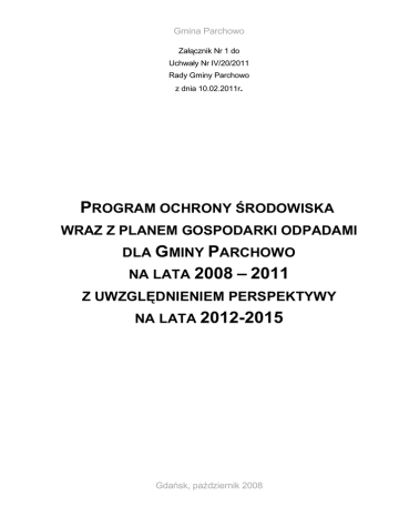 Gmina Parchowo Załącznik Nr 1 do Uchwały Nr IV/20/2011 Rady Gminy Parchowo z dnia 10.02.2011r. PROGRAM OCHRONY ŚRODOWISKA WRAZ Z PLANEM GOSPODARKI ODPADAMI DLA GMINY PARCHOWO NA LATA 2008 – 2011 Z UWZGLĘDNIENIEM PERSPEKTYWY NA LATA 2012-2015 Gdańsk, październik 2008 Gmina Parchowo Część 1. RAPORT O STANIE ŚRODOWISKA Gdańsk, październik 2008 Gmina Parchowo Opracowanie: Mariusz Kubiak Współpraca: Urząd Gminy Parchowo 2 RAPORT O STANIE ŚRODOWISKA Gmina Parchowo Spis treści: WPROWADZENIE 1. 4 PODSTAWOWE DANE SPOŁECZNO-GOSPODARCZE 5 1.1. Użytkowanie gruntów i rolnictwo 5 1.2. Elementy demografii 7 1.3. Rynek pracy i struktura zatrudnienie 13 1.4. Turystyka 16 2. STRUKTURA ŚRODOWISKA PRZYRODNICZEGO 18 3. ZASOBY PRZYRODNICZE 25 4. 3.1. Potencjał agroekologiczny 25 3.2. Potencjał leśny 25 3.3. Potencjał rekreacyjny 26 3.4. Potencjał surowcowy 26 OCENA STANU ŚRODOWISKA 4.1. Gospodarka wodno-ściekowa 4.1.1. Zaopatrzenie w wodę 4.1.2. Źródła zanieczyszczeń wód powierzchniowych i oczyszczanie ścieków 4.1.3. Stan czystości wód powierzchniowych 4.2. Źródła i stan zanieczyszczenia powietrza 27 27 27 28 30 32 4.2.1. Źródła zanieczyszczenia atmosfery 32 4.2.2. Stan areosanitarny na obszarze gminy 33 4.3. Klimat akustyczny 33 4.3.1. Źródła hałasu 33 4.3.2. Poziom hałasu 34 4.4. Promieniowanie elektromagnetyczne 34 4.5. Eksploatacja kopalin 35 4.6. Potencjalne źródła poważnych awarii 35 3 RAPORT O STANIE ŚRODOWISKA Gmina Parchowo 4.7. Gospodarka odpadami stałymi 4.7.1. Rodzaj, ilość i źródła powstawania odpadów 5. 6. 35 35 4.7.2. Rodzaj i ilość odpadów poddawanych poszczególnym procesom odzysku 39 4.7.3. Rodzaj i ilość odpadów poddawanych poszczególnym procesom unieszkodliwiania 40 4.7.4. Istniejące systemy zbierania odpadów 40 4.7.5. Selektywna zbiórka odpadów 41 4.7.6. Rodzaj, rozmieszczenie oraz moc przerobowa instalacji do odzysku i unieszkodliwiania odpadów 42 4.7.7. Wykaz podmiotów prowadzących działalność w zakresie zbierania, transportu, odzysku oraz unieszkodliwiania odpadów komunalnych 42 OCHRONA PRZYRODY 43 5.1. Stan istniejący 43 5.2. Planowane formy ochrony 44 ZAGROŻENIA PRZYRODNICZE 44 LITERATURA I MATERIAŁY ARCHIWALNE 46 4 RAPORT O STANIE ŚRODOWISKA Gmina Parchowo WPROWADZENIE „Raport o stanie środowiska w Gminie Parchowo” stanowi pierwszą część „Programu ochrony środowiska wraz z planem gospodarki odpadami dla Gminy Parchowo na lata 2008 – 2011 z uwzględnieniem perspektywy na lata 2012-2015”. „Program...” zrealizowany został równolegle z „Programami...’ dla pozostałych gmin powiatu bytowskiego i dla powiatu w trzech etapach, do których nawiązują trzy podstawowe części opracowania: Część 1 - Raport o stanie środowiska w Gminie Parchowo. Część 2 - Program ochrony środowiska w Gminie Parchowo na lata 2008-2011 z uwzględnieniem perspektywy na lata 2012 – 2015. Część 3 - Plan gospodarki odpadami dla Gminy Parchowo na lata 2008-2011 z uwzględnieniem perspektywy na lata 2012 – 2015. Uchwaleniu przez Radę Gminy Parchowo podlegają części 2 i 3. Istota „Programu...”, jego cele, zasady i podstawy prawne opracowania wyjaśnione są we prowadzeniu do części 2. pt. „Program ochrony środowiska w Gminie Parchowo na lata 2008-2011 z uwzględnieniem perspektywy na lata 2012 – 2015”. 5 RAPORT O STANIE ŚRODOWISKA Gmina Parchowo 1. PODSTAWOWE DANE SPOŁECZNO-GOSPODARCZE 1.1. Użytkowanie gruntów i rolnictwo Gmina Parchowo zajmuje powierzchnię 13100ha1, co stanowi ponad 5,97% całkowitej powierzchni powiatu bytowskiego (219200 ha). W strukturze użytkowania gruntów zdecydowanie przeważają użytki rolne, lasy i grunty leśne (51,4%) oraz użytki rolne – ok. 40,6% powierzchni (tab. 1). Tabela 1. Użytkowanie gruntów w Gminie Parchowo Gmina Rodzaj użytkowania Powierzchnia [ha] Udział procentowy [%] użytki rolne 5 319 (100,0%) 40,6 grunty orne 4271 32,6 sady 17 0,13 łąki 680 5,2 pastwiska 351 2,67 lasy i grunty leśne 6 739 51,4 wody 425 3,3 inne 617 4,7 Razem: 13100 100 w tym: Źródło: Bank Danych Regionalnych: www.stat.gov.pl 1 Rocznik statystyczny województwa pomorskiego. TABL. 1 (16). POWIERZCHNIA I LUDNOŚĆ W 2006 R. (cd.) Urząd Statystyczny, Gdańsk 6 RAPORT O STANIE ŚRODOWISKA Gmina Parchowo Wody 3,3% Inne 4,7% U żytki rolne 40,6% Lasy 51,4% Rys.Struktura użytkowania gruntów w Gminie Parchowo Gmina Parchowo charakteryzuje się dominacją gruntów klas V i VI (ponad 60% %2). Jednocześnie rolnictwo odznacza się niską efektywnością, znaczna jest ilość terenów ugorowanych. 1.2. Elementy demografii Według danych GUS w 20062 roku na terenie gminy Parchowo zamieszkiwało w sumie 3 438 osób, z czego 1 744 osoby stanowiły kobiety a 1 694 – mężczyźni. Liczby te dawały w konsekwencji wskaźnik feminizacji na poziomie 103 kobiet na 100 mężczyzn. Biorąc po uwagę powierzchnię gminy Parchowo gęstość zaludnienia na terenie gminy sięga poziomu 26 osób/km2. Charakterystyka demograficzna gminy Parchowo wskazuje, że w 2006 roku w gminie na 1000 mieszkańców przypadało 3,5 ‰ zawieranych małżeństw, liczba urodzeń dominuje nad liczbą zgonów, przez co przyrost naturalny w gminie w ostatnim badanym roku był dodatni i wyniósł 7 ‰ (urodzenia = 13, 6 ‰, zgony = 6,7 ‰). Znacznie mniej korzystnie przedstawiała się natomiast sytuacja w zakresie wielkości salda migracji, które w 2006 roku cechowało się silną wartością ujemną na poziomie – 13, 96 ‰ co wskazuje na znaczną przewagę emigracji nad imigracją w gminie. Struktura wieku ludności gminy Parchowo wskazuje na zdecydowaną dominację mieszkańców w wieku produkcyjnym – 60,46 % przy jednocześnie 2 Rocznik Statystyczny Województwa Pomorskiego 2007. Tom II, 2002, Urząd Statystyczny, Gdańsk. 7 RAPORT O STANIE ŚRODOWISKA Gmina Parchowo wysokim udziale przede wszystkim osób w wieku poprodukcyjnym – 12,21 %. Mieszkańcy w wieku przedprodukcyjnym 