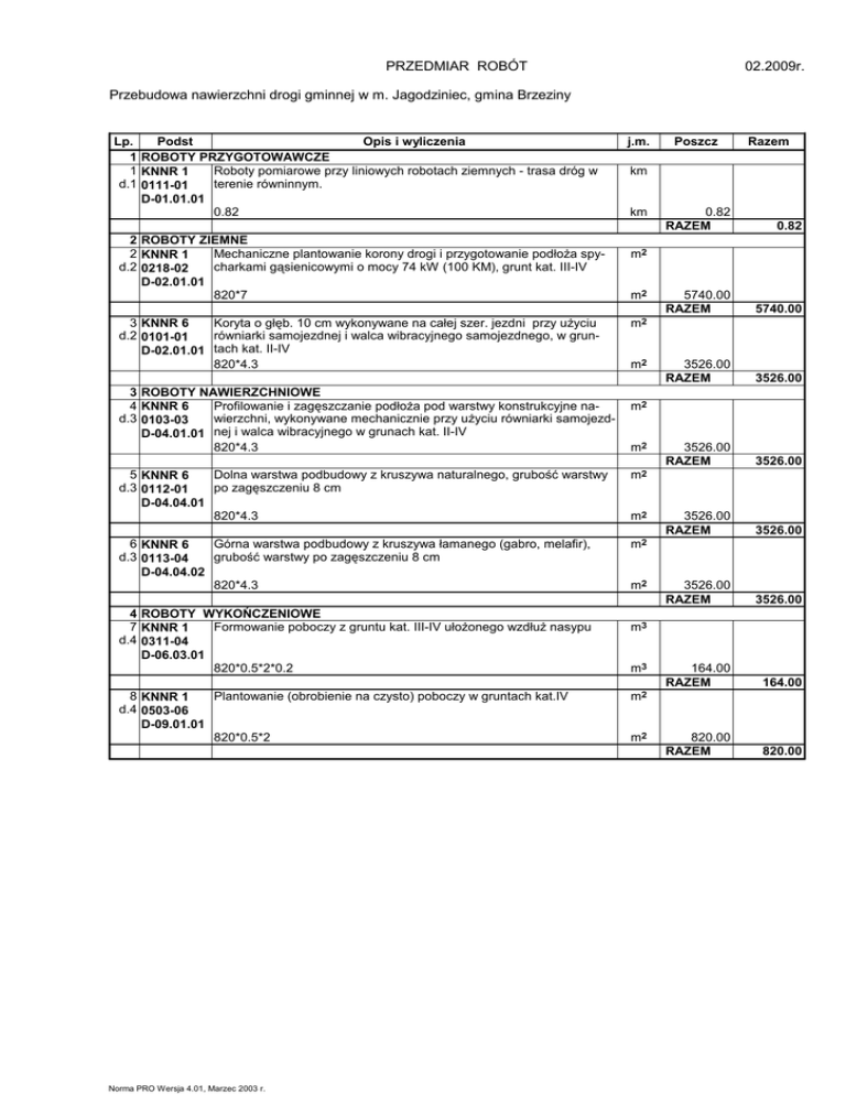 PRZEDMIAR ROBÓT 02.2009r. Przebudowa nawierzchni drogi gminnej w m. Jagodziniec, gmina Brzeziny Lp. Podst Opis i wyliczenia 1 ROBOTY PRZYGOTOWAWCZE 1 KNNR 1 Roboty pomiarowe przy liniowych robotach ziemnych - trasa dróg w d.1 0111-01 terenie równinnym. D-01.01.01 0.82 2 ROBOTY ZIEMNE 2 KNNR 1 Mechaniczne plantowanie korony drogi i przygotowanie podłoŜa spyd.2 0218-02 charkami gąsienicowymi o mocy 74 kW (100 KM), grunt kat. III-IV D-02.01.01 820*7 3 KNNR 6 Koryta o głęb. 10 cm wykonywane na całej szer. jezdni przy uŜyciu d.2 0101-01 równiarki samojezdnej i walca wibracyjnego samojezdnego, w grunD-02.01.01 tach kat. II-IV 820*4.3 3 ROBOTY NAWIERZCHNIOWE 4 KNNR 6 Profilowanie i zagęszczanie podłoŜa pod warstwy konstrukcyjne nad.3 0103-03 wierzchni, wykonywane mechanicznie przy uŜyciu równiarki samojezdD-04.01.01 nej i walca wibracyjnego w grunach kat. II-IV 820*4.3 j.m. km m2 0.82 5740.00 RAZEM 5740.00 3526.00 RAZEM 3526.00 3526.00 RAZEM 3526.00 3526.00 RAZEM 3526.00 3526.00 RAZEM 3526.00 164.00 RAZEM 164.00 820.00 RAZEM 820.00 m2 m2 m2 m2 6 KNNR 6 Górna warstwa podbudowy z kruszywa łamanego (gabro, melafir), d.3 0113-04 grubość warstwy po zagęszczeniu 8 cm D-04.04.02 820*4.3 m2 Norma PRO Wersja 4.01, Marzec 2003 r. 0.82 RAZEM m2 m2 8 KNNR 1 Plantowanie (obrobienie na czysto) poboczy w gruntach kat.IV d.4 0503-06 D-09.01.01 820*0.5*2 Razem km 5 KNNR 6 Dolna warstwa podbudowy z kruszywa naturalnego, grubość warstwy d.3 0112-01 po zagęszczeniu 8 cm D-04.04.01 820*4.3 4 ROBOTY WYKOŃCZENIOWE 7 KNNR 1 Formowanie poboczy z gruntu kat. III-IV ułoŜonego wzdłuŜ nasypu d.4 0311-04 D-06.03.01 820*0.5*2*0.2 Poszcz m2 m2 m3 m3 m2 m2