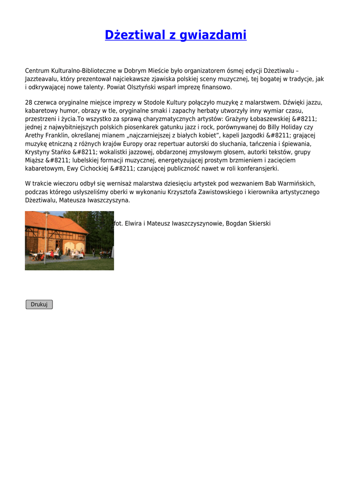 Dżeztiwal z gwiazdami Centrum Kulturalno-Biblioteczne w Dobrym Mieście było organizatorem ósmej edycji Dżeztiwalu – Jazzteavalu, który prezentował najciekawsze zjawiska polskiej sceny muzycznej, tej bogatej w tradycje, jak i odkrywającej nowe talenty. Powiat Olsztyński wsparł imprezę finansowo. 28 czerwca oryginalne miejsce imprezy w Stodole Kultury połączyło muzykę z malarstwem. Dźwięki jazzu, kabaretowy humor, obrazy w tle, oryginalne smaki i zapachy herbaty utworzyły inny wymiar czasu, przestrzeni i życia.To wszystko za sprawą charyzmatycznych artystów: Grażyny Łobaszewskiej – jednej z najwybitniejszych polskich piosenkarek gatunku jazz i rock, porównywanej do Billy Holiday czy Arethy Franklin, określanej mianem „najczarniejszej z białych kobiet”, kapeli Jazgodki – grającej muzykę etniczną z różnych krajów Europy oraz repertuar autorski do słuchania, tańczenia i śpiewania, Krystyny Stańko – wokalistki jazzowej, obdarzonej zmysłowym głosem, autorki tekstów, grupy Miąższ – lubelskiej formacji muzycznej, energetyzującej prostym brzmieniem i zacięciem kabaretowym, Ewy Cichockiej – czarującej publiczność nawet w roli konferansjerki. W trakcie wieczoru odbył się wernisaż malarstwa dziesięciu artystek pod wezwaniem Bab Warmińskich, podczas którego usłyszeliśmy oberki w wykonaniu Krzysztofa Zawistowskiego i kierownika artystycznego Dżeztiwalu, Mateusza Iwaszczyszyna. fot. Elwira i Mateusz Iwaszczyszynowie, Bogdan Skierski Drukuj