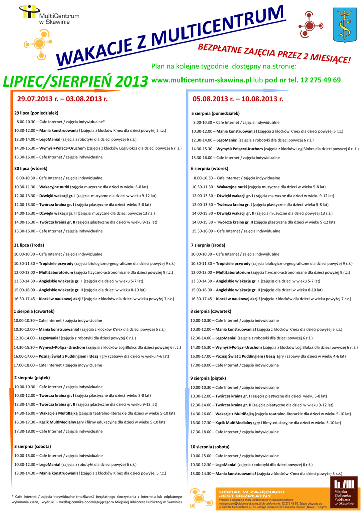 E J C A WAK M U R T N E C I T L U M Z B EZPŁATNE ZA JĘCIA PRZEZ 2 M Plan na kolejne tygodnie dostępny na stronie: IESIĄCE! LIPIEC/SIERPIEŃ 2013 www.multicentrum-skawina.pl lub pod nr tel. 12 275 49 69 29.07.2013 r. – 03.08.2013 r. 29 lipca (poniedziałek) 8.00-10.30 – Cafe Internet / zajęcia indywidualne* 05.08.2013 r. – 10.08.2013 r. 5 sierpnia (poniedziałek) 8.00-10.30 – Cafe Internet / zajęcia indywidualne 10.30-12.00 – Mania konstruowania! (zajęcia z klocków K’nex dla dzieci powyżej 5 r.ż.) 10.30-12.00 – Mania konstruowania! (zajęcia z klocków K’nex dla dzieci powyżej 5 r.ż.) 12.30-14.00 – LegoMania! (zajęcia z robotyki dla dzieci powyżej 6 r.ż.) 12.30-14.00 – LegoMania! (zajęcia z robotyki dla dzieci powyżej 6 r.ż.) 14.30-15.30 – Wymyśl+Połącz=Uruchom (zajęcia z klocków LogiBlokcs dla dzieci powyżej 6 r. ż.) 14.30-15.30 – Wymyśl+Połącz=Uruchom (zajęcia z klocków LogiBlokcs dla dzieci powyżej 6 r. ż.) 15.30-16.00 – Cafe Internet / zajęcia indywidualne 15.30-16.00 – Cafe Internet / zajęcia indywidualne 30 lipca (wtorek) 6 sierpnia (wtorek) 8.00-10.30 – Cafe Internet / zajęcia indywidualne 8.00-10.30 – Cafe Internet / zajęcia indywidualne 10.30-11.30 – Wakacyjne nutki (zajęcia muzyczne dla dzieci w wieku 5-8 lat) 10.30-11.30 – Wakacyjne nutki (zajęcia muzyczne dla dzieci w wieku 5-8 lat) 12.00-13.30 – Dźwięki wakacji gr. I (zajęcia muzyczne dla dzieci w wieku 9-12 lat) 12.00-13.30 – Dźwięki wakacji gr. I (zajęcia muzyczne dla dzieci w wieku 9-12 lat) 12.00-13.30 – Twórcza kraina gr. I (zajęcia plastyczne dla dzieci wieku 5-8 lat) 12.00-13.30 – Twórcza kraina gr. I (zajęcia plastyczne dla dzieci wieku 5-8 lat) 14.00-15.30 – Dźwięki wakacji gr. II (zajęcia muzyczne dla dzieci powyżej 13 r.ż.) 14.00-15.30 – Dźwięki wakacji gr. II (zajęcia muzyczne dla dzieci powyżej 13 r.ż.) 14.00-15.30 – Twórcza kraina gr. II (zajęcia plastyczne dla dzieci w wieku 9-12 lat) 14.00-15.30 – Twórcza kraina gr. II (zajęcia plastyczne dla dzieci w wieku 9-12 lat) 15.30-16.00 – Cafe Internet / zajęcia indywidualne 15.30-16.00 – Cafe Internet / zajęcia indywidualne 31 lipca (środa) 7 sierpnia (środa) 10.00-10.30 – Cafe Internet / zajęcia indywidualne 10.00-10.30 – Cafe Internet / zajęcia indywidualne 10.30-11.30 – Tropiciele przyrody (zajęcia biologiczno-geograficzne dla dzieci powyżej 9 r.ż.) 10.30-11.30 – Tropiciele przyrody (zajęcia biologiczno-geograficzne dla dzieci powyżej 9 r.ż.) 12.00-13.00 – MultiLaboratorium (zajęcia fizyczno-astronomiczne dla dzieci powyżej 9 r.ż.) 12.00-13.00 – MultiLaboratorium (zajęcia fizyczno-astronomiczne dla dzieci powyżej 9 r.ż.) 13.30-14.30 – Angielskie w’akacje gr. I (zajęcia dla dzieci w wieku 5-7 lat) 13.30-14.30 – Angielskie w’akacje gr. I (zajęcia dla dzieci w wieku 5-7 lat) 15.00-16.00 – Angielskie w’akacje gr. II (zajęcia dla dzieci w wieku 8-10 lat) 15.00-16.00 – Angielskie w’akacje gr. II (zajęcia dla dzieci w wieku 8-10 lat) 16.30-17.45 – Klocki w naukowej akcji! (zajęcia z klocków dla dzieci w wieku powyżej 7 r.ż.) 16.30-17.45 – Klocki w naukowej akcji! (zajęcia z klocków dla dzieci w wieku powyżej 7 r.ż.) 1 sierpnia (czwartek) 8 sierpnia (czwartek) 10.00-10.30 – Cafe Internet / zajęcia indywidualne 10.00-10.30 – Cafe Internet / zajęcia indywidualne 10.30-12.00 – Mania konstruowania! (zajęcia z klocków K’nex dla dzieci powyżej 5 r.ż.) 10.30-12.00 – Mania konstruowania! (zajęcia z klocków K’nex dla dzieci powyżej 5 r.ż.) 12.30-14.00 – LegoMania! (zajęcia z robotyki dla dzieci powyżej 6 r.ż.) 12.30-14.00 – LegoMania! (zajęcia z robotyki dla dzieci powyżej 6 r.ż.) 14.30-15.30 – Wymyśl+Połącz=Uruchom (zajęcia z klocków LogiBlokcs dla dzieci powyżej 6 r. ż.) 14.30-15.30 – Wymyśl+Połącz=Uruchom (zajęcia z klocków LogiBlokcs dla dzieci powyżej 6 r. ż.) 16.00-17.00 – Poznaj Świat z Puddingiem i Bezą (gry i zabawy dla dzieci w wieku 4-6 lat) 16.00-17.00 – Poznaj Świat z Puddingiem i Bezą (gry i zabawy dla dzieci w wieku 4-6 lat) 17.00-18.00 – Cafe Internet / zajęcia indywidualne 17.00-18.00 – Cafe Internet / zajęcia indywidualne 2 sierpnia (piątek) 9 sierpnia (piątek) 10.00-10.30 – Cafe Internet / zajęcia indywidualne 10.00-10.30 – Cafe Internet / zajęcia indywidualne 10.30-12.00 – Twórcza kraina gr. I (zajęcia plastyczne dla dzieci wieku 5-8 lat) 10.30-12.00 – Twórcza kraina gr. I (zajęcia plastyczne dla dzieci wieku 5-8 lat) 12.30-14.00 – Twórcza kraina gr. II (zajęcia plastyczne dla dzieci w wieku 9-12 lat) 12.30-14.00 – Twórcza kraina gr. II (zajęcia plastyczne dla dzieci w wieku 9-12 lat) 14.30-16.00 – Wakacje z MultiBajką (zajęcia teatralno-literackie dla dzieci w wieku 5-10 lat) 14.30-16.00 – Wakacje z MultiBajką (zajęcia teatralno-literackie dla dzieci w wieku 5-10 lat) 16.30-17.30 – Kącik MultiMedialny (gry i filmy edukacyjne dla dzieci w wieku 5-10 lat) 16.30-17.30 – Kącik MultiMedialny (gry i filmy edukacyjne dla dzieci w wieku 5-10 lat) 17.30-18.00 – Cafe Internet / zajęcia indywidualne 17.30-18.00 – Cafe Internet / zajęcia indywidualne 3 sierpnia (sobota) 10 sierpnia (sobota) 10.00-15.00 – Cafe Internet / zajęcia indywidualne 10.00-15.00 – Cafe Internet / zajęcia indywidualne 10.30-12.30 – LegoMania! (zajęcia z robotyki dla dzieci powyżej 6 r.ż.) 10.30-12.30 – LegoMania! (zajęcia z robotyki dla dzieci powyżej 6 r.ż.) 13.00-14.30 – Mania konstruowania! (zajęcia z klocków K’nex dla dzieci powyżej 5 r.ż.) 13.00-14.30 – Mania konstruowania! (zajęcia z klocków K’nex dla dzieci powyżej 5 r.ż.) * Cafe Internet / zajęcia indywidualne (możliwość bezpłatnego skorzystania z Internetu lub odpłatnego wykonania ksero, wydruku – według cennika obowiązującego w Miejskiej Bibliotece Publicznej w Skawinie)
