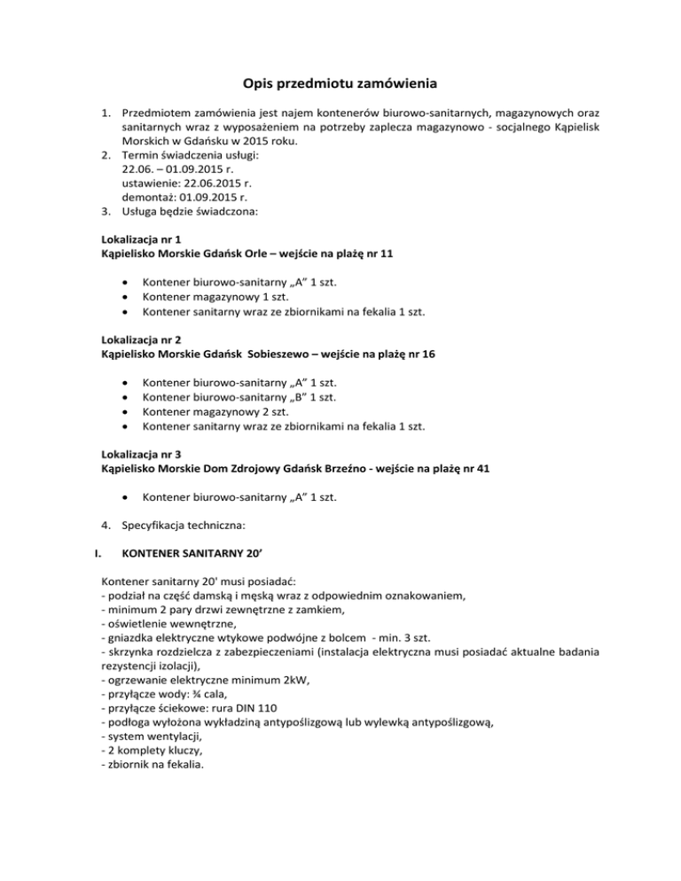 Opis przedmiotu zamówienia 1. Przedmiotem zamówienia jest najem kontenerów biurowo-sanitarnych, magazynowych oraz sanitarnych wraz z wyposażeniem na potrzeby zaplecza magazynowo - socjalnego Kąpielisk Morskich w Gdańsku w 2015 roku. 2. Termin świadczenia usługi: 22.06. – 01.09.2015 r. ustawienie: 22.06.2015 r. demontaż: 01.09.2015 r. 3. Usługa będzie świadczona: Lokalizacja nr 1 Kąpielisko Morskie Gdańsk Orle – wejście na plażę nr 11 • • • Kontener biurowo-sanitarny „A” 1 szt. Kontener magazynowy 1 szt. Kontener sanitarny wraz ze zbiornikami na fekalia 1 szt. Lokalizacja nr 2 Kąpielisko Morskie Gdańsk Sobieszewo – wejście na plażę nr 16 • • • • Kontener biurowo-sanitarny „A” 1 szt. Kontener biurowo-sanitarny „B” 1 szt. Kontener magazynowy 2 szt. Kontener sanitarny wraz ze zbiornikami na fekalia 1 szt. Lokalizacja nr 3 Kąpielisko Morskie Dom Zdrojowy Gdańsk Brzeźno - wejście na plażę nr 41 • Kontener biurowo-sanitarny „A” 1 szt. 4. Specyfikacja techniczna: I. KONTENER SANITARNY 20’ Kontener sanitarny 20' musi posiadać: - podział na część damską i męską wraz z odpowiednim oznakowaniem, - minimum 2 pary drzwi zewnętrzne z zamkiem, - oświetlenie wewnętrzne, - gniazdka elektryczne wtykowe podwójne z bolcem - min. 3 szt. - skrzynka rozdzielcza z zabezpieczeniami (instalacja elektryczna musi posiadać aktualne badania rezystencji izolacji), - ogrzewanie elektryczne minimum 2kW, - przyłącze wody: ¾ cala, - przyłącze ściekowe: rura DIN 110 - podłoga wyłożona wykładziną antypoślizgową lub wylewką antypoślizgową, - system wentylacji, - 2 komplety kluczy, - zbiornik na fekalia. Wyposażenie kontenera sanitarnego 20’ Część męska: - minimum 3 pisuary, - osłony przy pisuarach, - minimum 1 toaleta, - minimum 1 umywalka, - minimum 1 podajnik ręczników papierowych, - minimum 1 podajnik na mydło, - minimum 1 kosz na śmieci, - minimum 1 nietłukące się lustro nad umywalką - właściwe oznakowanie części męskiej (tabliczka, piktogram) Część damska: - minimum 2 umywalki, - minimum 3 toalety, - minimum 1 podajnik ręczników papierowych, - minimum 1 podajnik na mydło, - minimum 1 kosz na śmieci, - minimum 2 nietłukące się lustro nad umywalkami - właściwe oznakowanie części męskiej (tabliczka, piktogram) Zbiornik lub zbiorniki na fekalia muszą posiadać łączną pojemność min. 20 000 l. Zbiornik powinien być posadowiony pod ziemią z możliwością opróżniania od góry oraz podłączony do wskazanych przez Zamawiającego kontenerów. Wymiary: Długość całkowita: min. 6000 mm Szerokość całkowita: min. 2400 mm Wysokość wewnętrzna: min. 2500 mm Elewacja zewnętrzna i wewnętrzna: biały kolor, estetyczny wygląd, dopuszczone są wykończenia w innym kolorze. II. KONTENER BIUROWO-SANITARNY 20’ „A” Kontener biurowo-sanitarny 20’ „A” musi posiadać: - drzwi zewnętrzne min. 1 szt. zamykane na klucz, - wydzielone ściankami i drzwiami pomieszczenie sanitarne, - pomieszczenie biurowe bez ścian działowych, - okno biurowe w wymiarach minimum 945x1200 mm z roletą, - oświetlenie wewnętrzne, - gniazdka elektryczne wtykowe podwójne z bolcem - min. 3 szt. - skrzynka rozdzielcza z zabezpieczeniami (instalacja elektryczna musi posiadać aktualne badania rezystencji), - podłącza wodno-kanalizacyjne i elektryczne, - podłoga wyłożona wykładziną PCV - system wentylacji, - 2 komplety kluczy Wyposażenie pomieszczenia sanitarnego: - 1 toaleta ze zbiornikiem minimum 8 litrów, - 1 umywalka, - podgrzewasz wody o pojemności minimum 5 l, - nietłukące się lustro Wyposażenie części biurowej: - 4 szt. szafka BHP o wymiarach min. 49x49x180 wykonana z tworzywa sztucznego, - 1 szt. szafa na odzież i dokumenty o wymiarach min. 80x45x180 wykonana z tworzywa sztucznego, - 3 szt. krzesło plastikowe z metalowymi nogami, - 1 szt. krzesło obrotowe - 1 szt. kontenerek pod biurko z 3 szufladami wykonany z tworzywa sztucznego, - 1 szt. stół o wymiarach min. 160x80x73, blat wykonany z tworzywa sztucznego Wymiary: Długość całkowita: min. 6000 mm Szerokość całkowita: min. 2400 mm Wysokość wewnętrzna: min. 2500 mm Elewacja zewnętrzna i wewnętrzna: biały kolor, estetyczny wygląd, III. KONTENER BIUROWO-SANITARNY 20’ „B” Kontener biurowo-sanitarny 20’ „B” musi posiadać: - drzwi zewnętrzne min. 1 szt. zamykane na klucz, - pomieszczenie biurowe bez ścian działowych, - okno biurowe w wymiarach minimum 945x1200 mm z roletą., - oświetlenie wewnętrzne, - gniazdka elektryczne wtykowe podwójne z bolcem - min. 3 szt. - skrzynka rozdzielcza z zabezpieczeniami (instalacja elektryczna musi posiadać aktualne badania rezystencji), - podłącza wodno-kanalizacyjne i elektryczne, - podłoga wyłożona wykładziną PCV - system wentylacji, - 2 komplety kluczy Wyposażenie: - 7 szt. szafka BHP o wymiarach min. 49x49x180 cm wykonana z tworzywa sztucznego, - 3 szt. krzesło plastikowe z metalowymi nogami, - 1 szt. kontenerek pod biurko z 3 szufladami wykonany z tworzywa sztucznego, - 1 szt. stół o wymiarach min. 160x80x73 cm, blat wykonany z tworzywa sztucznego Wymiary: Długość całkowita: min. 6000 mm Szerokość całkowita: min. 2400 mm Wysokość wewnętrzna: min. 2500 mm Elewacja zewnętrzna i wewnętrzna: biały kolor, estetyczny wygląd. IV. KONTENER MAGAZYNOWY 20’ Kontener magazynowy 20': - bez ścian działowych, - drzwi dwuskrzydłowe - bez okien Wymiary: Długość całkowita: min. 6000 mm Szerokość całkowita: min. 2400 mm Wysokość wewnętrzna: min. 2500 mm Elewacja zewnętrzna i wewnętrzna: biały kolor, estetyczny wygląd. Wszystkie kontenery powinny mieć jednolity odcień. Wszystkie kontenery muszą być wykonane ze ścianek poliuretanowych o przenikalności ciepła nie większej niż U=0,25. Wymiary: [długość]x[szerokość]x[wysokość] Zamawiający zachowuje sobie prawo do zmian terminów oraz rezygnacji z poszczególnych elementów zamó