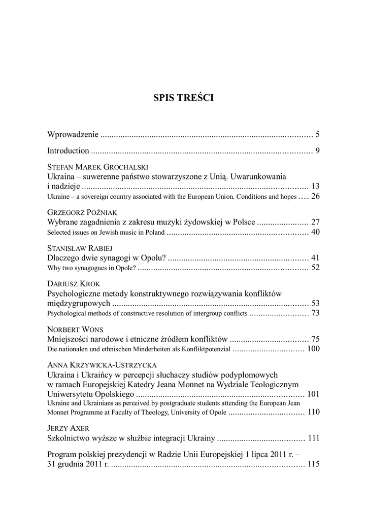 SPIS TRE CI Wprowadzenie ............................................................................................... 5 Introduction ................................................................................................... 9 STEFAN MAREK GROCHALSKI Ukraina – suwerenne pa stwo stowarzyszone z Uni . Uwarunkowania i nadzieje ..................................................................................................... 13 Ukraine – a sovereign country associated with the European Union. Conditions and hopes .... 26 GRZEGORZ PO NIAK Wybrane zagadnienia z zakresu muzyki ydowskiej w Polsce ....................... 27 Selected issues on Jewish music in Poland ............................................................... 40 STANIS AW RABIEJ Dlaczego dwie synagogi w Opolu? ............................................................... 41 Why two synagogues in Opole? ............................................................................ 52 DARIUSZ KROK Psychologiczne metody konstruktywnego rozwi zywania konfliktów mi dzygrupowych ........................................................................................ 53 Psychological methods of constructive resolution of intergroup conflicts .......................... 73 NORBERT WONS Mniejszo ci narodowe i etniczne ród em konfliktów ................................... 75 Die nationalen und ethnischen Minderheiten als Konfliktpotenzial ................................ 100 ANNA KRZYWICKA-USTRZYCKA Ukraina i Ukrai cy w percepcji s uchaczy studiów podyplomowych w ramach Europejskiej Katedry Jeana Monnet na Wydziale Teologicznym Uniwersytetu Opolskiego ........................................................................... 101 Ukraine and Ukrainians as perceived by postgraduate students attending the European Jean Monnet Programme at Faculty of Theology, University of Opole .................................. 110 JERZY AXER Szkolnictwo wy sze w s u bie integracji Ukrainy ....................................... 111 Program polskiej prezydencji w Radzie Unii Europejskiej 1 lipca 2011 r. – 31 grudnia 2011 r. ...................................................................................... 115