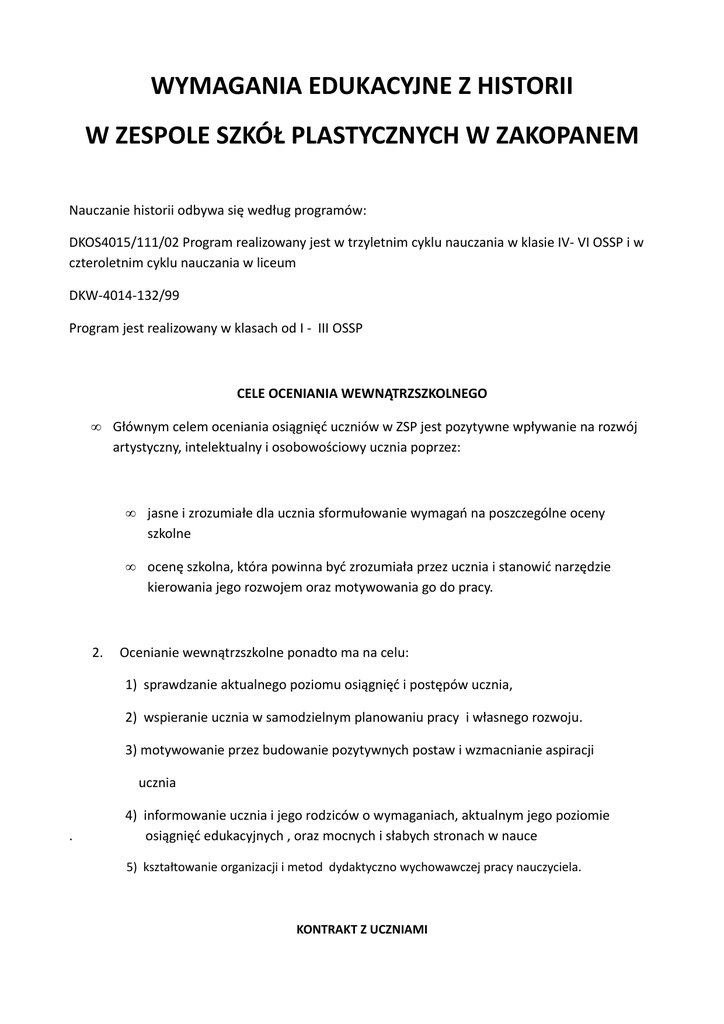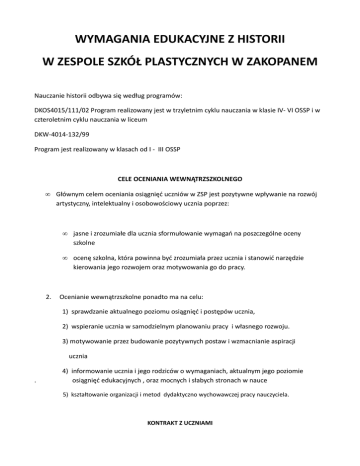 WYMAGANIA EDUKACYJNE Z HISTORII W ZESPOLE SZKÓŁ PLASTYCZNYCH W ZAKOPANEM Nauczanie historii odbywa się według programów: DKOS4015/111/02 Program realizowany jest w trzyletnim cyklu nauczania w klasie IV- VI OSSP i w czteroletnim cyklu nauczania w liceum DKW-4014-132/99 Program jest realizowany w klasach od I - III OSSP CELE OCENIANIA WEWNĄTRZSZKOLNEGO • 2. Głównym celem oceniania osiągnięć uczniów w ZSP jest pozytywne wpływanie na rozwój artystyczny, intelektualny i osobowościowy ucznia poprzez: • jasne i zrozumiałe dla ucznia sformułowanie wymagań na poszczególne oceny szkolne • ocenę szkolna, która powinna być zrozumiała przez ucznia i stanowić narzędzie kierowania jego rozwojem oraz motywowania go do pracy. Ocenianie wewnątrzszkolne ponadto ma na celu: 1) sprawdzanie aktualnego poziomu osiągnięć i postępów ucznia, 2) wspieranie ucznia w samodzielnym planowaniu pracy i własnego rozwoju. 3) motywowanie przez budowanie pozytywnych postaw i wzmacnianie aspiracji ucznia . 4) informowanie ucznia i jego rodziców o wymaganiach, aktualnym jego poziomie osiągnięć edukacyjnych , oraz mocnych i słabych stronach w nauce 5) kształtowanie organizacji i metod dydaktyczno wychowawczej pracy nauczyciela. KONTRAKT Z UCZNIAMI • Opuszczenie przez ucznia 35 % zajęć ( 50% dla przewlekle chorych) jest jednoznaczne z nieklasyfikowaniem. Uczeń nieklasyfikowany w przypadku, gdy jego nieobecność na zajęciach była usprawiedliwiona, ma prawo zdawać egzamin klasyfikacyjny. Decyzję ta podejmuje Dyrektor szkoły • Prace klasowe są obowiązkowe. Uczeń, który opuści pracę klasową z przyczyn losowych, powinien napisać ją w terminie uzgodnionym z nauczycielem. • Praca klasowa jest zapowiedziana co najmniej tydzień wcześniej. Nauczyciel omawia jej zakres i kryteria wymagań • Krótkie sprawdziany nie są zapowiadane, zakres materiału obejmuje 3 ostatnie tematy. • Uczeń ma obowiązek przed lekcją zgłosić brak zadania ( 2 razy w semestrze bez konsekwencji, w wyjątkowych wypadkach losowych brak przygotowania do lekcji). • Uczeń ma obowiązek prowadzenia zeszytu przedmiotowego. POMIAR OSIĄGNIĘC UCZNIÓW • Prace klasowe, prace semestralne spełniające kryteria nowej matury, sprawdziany, prace długoterminowe, prezentacje multimedialne, prace prowadzone metodą projektu, lektura historyczna, praca ze źródłem i prace domowe. Dodatkowo oceniany będzie udział w konkursach historycznych, olimpiadach i przedstawieniach historycznych. Ważna w ocenianiu będzie także praca z mapą. Oceny wystawiane są na bieżąco i wpisywane do dziennika. OCENA BIEZĄCA I JEJ KRYTERIA 1. Stosuje się stopniową skalę ocen z uwzględnieniem znaków „+” i „-” dla ocen cząstkowych i półrocznych SKALA: 6 – celujący 5 – bardzo dobry 4 - dobry 3 – dostateczny 2 – dopuszczający 1 – niedostateczny 2. Kryteria ocen: WYPOWIEDZI USTNE Oceniane jest stosowanie terminologii historycznej, zgodność z poziomem wymagań, zawartość rzeczowa oraz umiejętności ucznia (korzystanie z mapy i tablic graficznych, oraz źródeł ideograficznych ) • Celujący – odpowiedź spełnia kryteria oceny bardzo dobrej i wykracza poza materiał szkoły, uczeń bierze udział i osiąga znaczne sukcesy w konkursach przedmiotowych, rozwija swoje zainteresowania historyczne • Bardzo dobry – uczeń opanował pełny zakres wiedzy określony programem nauczania, posiada umiejętność analizy i interpretacji wydarzeń historycznych , samodzielnie prezentuje i uzasadnia własne stanowisko, dokonuje niezależnych ocen. • Dobry – uczeń an podstawowe treści programowe, potrafi logicznie formułować oceny i wnioski, oraz interpretować fakty i zjawiska historyczne, stosuje terminy i pojęcia historyczne, aktywnie pracuje w grupie, bierze udział w dyskusjach. • Dostateczny – uczeń wykazuje się znajomością podstawowych wiadomości historycznych, mimo, że jego umiejętności analizy przyczynowo- skutkowej są ograniczone. Próbuje porównać, selekcjonować fakty i informacje, operuje czasem i przestrzenią, wykazuje aktywność na lekcji. • Dopuszczający - uczeń, mimo wyraźnych lik, błędów i niedociągnięć , potrafi przy pomocy nauczyciela opanować wiadomości i umiejętności istotne dla dalszego etapu kształcenia, rozwiązuje zadania typowe i o niewielkim stopniu trudności, formułuje powierzchowne wnioski i oceny, współpracuje z nauczycielem • Niedostateczny – uczeń nie opanował koniecznych treści i terminologii historycznej, w sposób błędny i niedojrzały nie umiejscawia wydarzeń w czasie i przestrzeni, często opuszcza zajęcia i lekceważy przedmiot. Poziom wiedzy i umiejętności uniemożliwia mu kontynuację nauki na wyższym szczeblu kształcenia. PRACE PISEMNE Sprawdziany składają się z kilku krótkich pytań, które są punktowane Prace klasowe są najczęściej w formie testu. Każdemu zadaniu odpowiada określona liczba punktów. Streszczenia fragmentów lektur oceniane są według wcześniej podanych kryteriów. Prace typu maturalnego oceniane są według kryteriów na dany poziom Sposób wystawiania oceny: 100 -95 % - celujący 94- 85 % -bardzo dobry 84- 71% -dobry 7O -51% -dostateczny 41 -50 % -dopuszczający 40 % -niedostateczny TRYB PODWYŻSZANIA OCENY WYŻSZEJ NIŻ PROPONOWANA Uczeń, który ubiega się o ocenę z historii wyższą, niż proponowana, zobowiązany jest do spełnienia poniższych kryteriów: • Systematycznie uczęszcza na zajęcia i jest przygotowany do lekcji, • odrabia w trybie ustalonym przez nauczyciela zaległości wynikające z nieobecności, • wykazuje się aktywnością na lekcjach • chętnie bierze udział w projektach edukacyjnych • bierze udział w konkursach i olimpiadach historycznych • może ubiegać się o jedną ocenę wyższą, niż proponowana, po warunkiem, że co najmniej połowa ocen z ważnych sprawdzianów i testów jest oceniona na tą ocenę. • Aktywny 