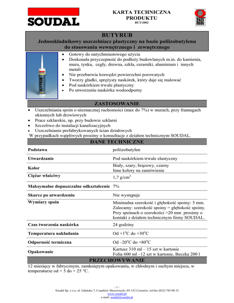 KARTA TECHNICZNA PRODUKTU BUT/2002 BUTYRUB Jednoskładnikowy uszczelniacz plastyczny na bazie poliizobutylenu do stosowania wewnętrznego i zewnętrznego • • • • • • Gotowy do natychmiastowego użycia Doskonała przyczepność do podłoży budowlanych m.in. do kamienia, muru, tynku, cegły, drewna, szkła, ceramiki, aluminium i innych metali Nie przebarwia krawędzi powierzchni porowatych Tworzy gładki, sprężysty naskórek, który daje się malować Pod naskórkiem trwale plastyczny Po utworzeniu naskórka wodoodporny ZASTOSOWANIE • Uszczelniania spoin o nieznacznej ruchomości (max do 7%) w murach, przy framugach okiennych lub drzwiowych • Prace szklarskie, np. przy budowie szklarni • Szczeliwo do instalacji kanalizacyjnych • Uszczelnianie prefabrykowanych ścian działowych W przypadkach wątpliwych prosimy o konsultacje z działem technicznym SOUDAL. DANE TECHNICZNE Podstawa poliizobutylen Utwardzanie Pod naskórkiem trwale elastyczny Kolor Biały, szary, brązowy, czarny Inne kolory na zamówienie Ciężar właściwy 1,7 g/cm3 Maksymalne dopuszczalne odkształcenie 7% Skurcz po utwardzeniu Nie występuje Wymiary spoin Minimalna szerokość i głębokość spoiny: 5 mm. Zalecamy: szerokość spoiny = głębokość spoiny. Przy spoinach o szerokości >20 mm prosimy o kontakt z działem technicznym firmy SOUDAL. Czas tworzenia naskórka 24 godziny Temperatura nakładania Od +1oC do +30oC Odporność termiczna Od –20oC do +80oC Opakowanie Kartusz 310 ml – 15 szt w kartonie Folia 600 ml –12 szt w kartonie, Beczka 200 l PRZECHOWYWANIE 12 miesięcy w fabrycznym, zamkniętym opakowaniu, w chłodnym i suchym miejscu, w temperaturze od + 5 do + 25 °C. -1Soudal Sp. z o.o. ul. Gdańska 7, Cząstków Mazowiecki, 05-152 Czosnów, tel/fax (022) 785 00 23 www.soudal.pl e-mail: [email protected] NORMY I CERTYFIKATY Produkt wytwarzany jest przez firmę SOUDAL NV w Turnhout w Belgii, zgodnie z wymogami jakościowymi normy ISO 9002. Posiada następujące dopuszczenia do obrotu: Aprobata ITB AT 15-4641/2000, Atest PZH B-739/97, Znak bezpieczeństwa ITB-2B/2000 SPOSÓB UŻYCIA • • • • • • Wszystkie podłoża muszą być czyste, suche, wolne od tłuszczu i luźnych zanieczyszczeń (kurz, stare szczeliwa, itp.) Nie wymagane wstępne gruntowanie Produkt wyciskać odpowiednim ręcznym lub pneumatycznym pistoletem dopasowanym do rodzaju opakowania, po odpowiednim przycięciu dyszy bądź za pomocą szpatułki Brzeg spoiny podczas aplikacji osłonić taśmą maskującą, wygładzić powierzchnię fugi szpachelką i usunąć taśmę maskującą. Po utworzeniu naskórka można spoinę pomalować Czyszczenie narzędzi i podłoża: benzyną lakową bezpośrednio po użyciu. ZALECENIA BHP Przy użyciu uszczelniacza przestrzegać zwykłych zasad higieny pracy, a w szczególności: • Unikać kontaktu ze skórą • w przypadku kontaktu ze skórą przemyć natychmiast wodą • może wywoływać podrażnienia oczu • chronić przed dziećmi • dobrze wietrzyć pomieszczenie Uwaga: Wskazówki zawarte w tym dokumencie są wynikami naszych doświadczeń i praktyki. Ze względu na różnorodność materiałów i podłoży oraz wielorakość możliwych zastosowań, które pozostają poza naszą kontrolą, nie możemy przyjmować jakiejkolwiek odpowiedzialności za otrzymane rezultaty. We wszystkich przypadkach zaleca się przeprowadzenie próby. -2Soudal Sp. z o.o. ul. Gdańska 7, Cząstków Mazowiecki, 05-152 Czosnów, tel/fax (022) 785 00 23 www.soudal.pl e-mail: [email protected]