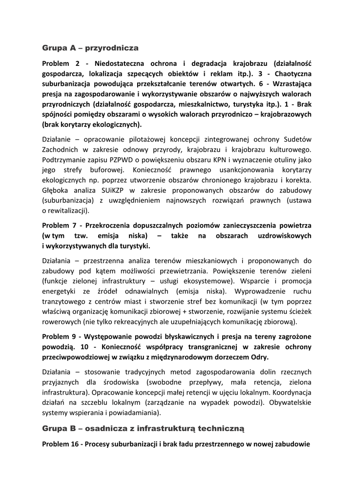 Grupa A – przyrodnicza Problem 2 - Niedostateczna ochrona i degradacja krajobrazu (działalność gospodarcza, lokalizacja szpecących obiektów i reklam itp.). 3 - Chaotyczna suburbanizacja powodująca przekształcanie terenów otwartych. 6 - Wzrastająca presja na zagospodarowanie i wykorzystywanie obszarów o najwyższych walorach przyrodniczych (działalność gospodarcza, mieszkalnictwo, turystyka itp.). 1 - Brak spójności pomiędzy obszarami o wysokich walorach przyrodniczo – krajobrazowych (brak korytarzy ekologicznych). Działanie – opracowanie pilotażowej koncepcji zintegrowanej ochrony Sudetów Zachodnich w zakresie odnowy przyrody, krajobrazu i krajobrazu kulturowego. Podtrzymanie zapisu PZPWD o powiększeniu obszaru KPN i wyznaczenie otuliny jako jego strefy buforowej. Konieczność prawnego usankcjonowania korytarzy ekologicznych np. poprzez utworzenie obszarów chronionego krajobrazu i korekta. Głęboka analiza SUiKZP w zakresie proponowanych obszarów do zabudowy (suburbanizacja) z uwzględnieniem najnowszych rozwiązań prawnych (ustawa o rewitalizacji). Problem 7 - Przekroczenia dopuszczalnych poziomów zanieczyszczenia powietrza (w tym tzw. emisja niska) – także na obszarach uzdrowiskowych i wykorzystywanych dla turystyki. Działania – przestrzenna analiza terenów mieszkaniowych i proponowanych do zabudowy pod kątem możliwości przewietrzania. Powiększenie terenów zieleni (funkcje zielonej infrastruktury – usługi ekosystemowe). Wsparcie i promocja energetyki ze źródeł odnawialnych (emisja niska). Wyprowadzenie ruchu tranzytowego z centrów miast i stworzenie stref bez komunikacji (w tym poprzez właściwą organizację komunikacji zbiorowej + stworzenie, rozwijanie systemu ścieżek rowerowych (nie tylko rekreacyjnych ale uzupełniających komunikację zbiorową). Problem 9 - Występowanie powodzi błyskawicznych i presja na tereny zagrożone powodzią. 10 - Konieczność współpracy transgranicznej w zakresie ochrony przeciwpowodziowej w związku z międzynarodowym dorzeczem Odry. Działania – stosowanie tradycyjnych metod zagospodarowania dolin rzecznych przyjaznych dla środowiska (swobodne przepływy, mała retencja, zielona infrastruktura). Opracowanie koncepcji małej retencji w ujęciu lokalnym. Koordynacja działań na szczeblu lokalnym (zarządzanie na wypadek powodzi). Obywatelskie systemy wspierania i powiadamiania). Grupa B – osadnicza z infrastrukturą techniczną Problem 16 - Procesy suburbanizacji i brak ładu przestrzennego w nowej zabudowie Działania – kompleksowe opracowywanie MPZP i współpraca jednostek sąsiadujących (szczególnie na styku). Wprowadzenie regulacji ustawowych (obecnie jest zbyt dowolne) Zbyt schematyczny proces nie uwzględnia wymiaru ponadlokalnego. Planowanie bez nacisku politycznego. Konsultacje społeczne przed rozpoczęciem prac. Problem 11 - Brak wyposażenia/niezadawalający stan sieci infrastruktury technicznej terenów trudnodostępnych (w tym brak bezpieczeństwa energetycznego). Działania – stworzenie systemu pomocy indywidualnym odbiorcom – wsparcie prosumentów. Wspieranie systemu OZE (rozproszonym). Modernizacja istniejącej sieci (np. skablowanie). Problem 15 - Degradacja walorów kulturowych i brak rewitalizacji ośrodków osadniczych powodujący trwałą utratę walorów kulturowych, a tym samym turystycznych obszaru. Działania – określenie zasad i wyznaczanie (określenie lokalizacji) obszarów o cennych walorach kulturowych. Wsparcie finansowe, programy rewitalizacji. Przychylność Wojewódzkiego Konserwatora przy wydawaniu opinii/uzgodnień. Wspieranie działań inwestorów, tworzenie katalogu najistotniejszych do ochrony obiektów. Problem 17 - Wyludnianie się sieci osadniczej w tym ośrodków turystycznych i uzdrowiskowych. Działania – tworzenie miejsc pracy dla lokalnej ludności (wskazanie miejsc dla tych inwestycji). Poprawa dostępności komunikacyjnej. Rozszerzenie bazy szkolnictwa (ośrodki regionalne, filie). Problem 19 - Brak nowoczesnej infrastruktury dla obsługi turystów i kuracjuszy. Działania – odblokowanie ograniczeń dotyczących ochrony środowiska, dopuszczenie inwestycji. Kompleksowe rozwiązywanie potrzeb dla turystów i kuracjuszy. Grupa C – transportowa Problem 22 - Brak planów dotyczących budowy wysokiej jakości połączeń drogowych pomiędzy planowaną drogą ekspresową S3 a aglomeracją jeleniogórską i wałbrzyską. Działania – Studia Korytarzowe. Koncepcje, wstępne studia wykonalności dla realizacji łączników z S3, z wykorzystaniem istniejących odcinków dróg. Problem 24 - Brak wysokiej jakości połączenia drogowego integrującego południowy obszar województwa - Trasa Sudecka/Podsudecka. Działania – w ramach działań problemu 22 , kontynuacja w kierunku Jelenia Góra – Lubań – Zgorzelec oraz z Wałbrzych – Nowa Ruda – Kłodzko. Problem 25 - Niedostateczne transgraniczne połączenia drogowe i kolejowe. Działania – połączenie Jelenia Góra – Szklarska Poręba – Liberec. Połączenie Zgorzelec – Jelenia Góra – Zgorzelec. Problem 28 - Brak sieci transportu rowerowego i jednorodnych standardów technicznych dla infrastruktury rowerowej. Działania – ustalenie standardów dla infrastruktury rowerowej, problem przy przebudowie istniejących odcinków dróg. Problem 21 – Ograniczona dostępność komunikacyjna do ośrodków atrakcyjnych turystycznie. Działania – usprawnienie (zintegrowanie połączeń lokalnych w połączeniu z transportem o znaczeniu krajowym i regionalnym. Grupa D – społeczno-gospodarcza Problem 29 - Obszary koncentracji negatywnych cech społeczno-demograficznych (odpływ ludności, wyludnianie, starzenie się społeczeństwa). Działania – rozwój infrastruktury transportowej i społecznej. Problem 33 - Obszary stagnacji gospodarczej. Miejsca pracy kreowane są głównie przez sferę publiczną. Działania - rozwój infrastruktury transportowej. Problem 34 - G