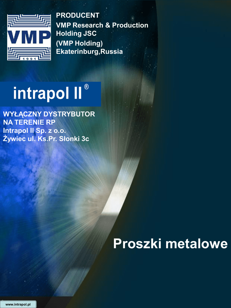 PRODUCENT VMP Research & Production Holding JSC (VMP Holding) Ekaterinburg,Russia WYŁĄCZNY DYSTRYBUTOR NA TERENIE RP Intrapol II Sp. z o.o. Żywiec ul. Ks.Pr. Słonki 3c Proszki metalowe www.intrapol.pl Unikatowa produkcja metalowych proszków Nikt na świecie nie posiada takich technologii i wyposażenia do produkcji wysoko-dyspresyjnych nano proszków z ciężkich kolorowych metali i stopów jak Rosyjski VMP Jekaterynburg. Unikatowa technologia produkcji pozwala wyprodukować nano proszki o wysokiej jakości i niezwykłej czystości chemicznej. Można dobierać określony skład chemiczny o dowolnych rozmiarach cząstek: od mikronowych, poprzez submikronowe i nanometryczne, do potrzeb określonego produktu. Produkcję można w łatwy sposób dostosować pod względem ilości do potrzeb rynku. www.intrapol.pl Właściwości Proszku cynkowego wysokodyspersyjnego PZVD-0 TU 1790 - 007 - 12288779 - 2006 Nazwa wskaźnika Wartość wskaźnika Wygląd Proszek w kolorze szarym lub jasnoszarym bez obcych wtrąceń Kształt cząstek Kulista Skład chemiczny, udział masowy, %: - cynk metalowy - domieszki: Nie mniej 96,0 żelazo nie więcej 0,005 ołów nie więcej 0,013 kadm nie więcej 0,004 miedź nie więcej 0,001 cyna nie więcej 0,001 arsen nie więcej 0,0005 Pozostałość nierozpuszczalna w rozcieńczonym 1 : 1 kwasie solnym nie więcej 0,05 Skład w zakresie wielkości cząstek: udział masowy, %, frakcji proszku o wielkości cząstek Gęstość nasypowa, g/cm³ www.intrapol.pl pow. 20 μm nie więcej 15 pow. 12 do 20 μm łącznie nie więcej 30 od 4 do 12 μm łącznie nie mniej 50 mniej 4 μm nie więcej 25 1,7 – 2,5 ZASTOSOWANIE PROSZKU NANO-CYNKOWEGO PZVD-0 ma zastosowanie w metalurgii przy wydobyciu złota metodą chemiczną, jak również w zakładach chemicznych jako katalizator i reagent; dla otrzymywania powłok antykorozyjnych na wyrobach metalowych metodą cynkowania termodyfuzyjnego, plazmowego i innych rodzajów natrysków; gęstych smarów plastycznych; www.intrapol.pl Właściwości wysokodyspersyjnego proszku miedzianego PMVD TU 1790-040-12288779-2005 Nazwa wskaźnika Wartość / zakres wartości wskaźnika PMVD-0 Wygląd Proszek w kolorze od jasnego do ciemnego brązu z czerwonym odcieniem bez obcych wtrąceń Kształt cząstek Udział masowy miedzi *, % , nie mniej PMVD-1 Kulista 99.96 99,9 Skład w zakresie wielkości cząstek: udział masowy frakcji proszku o wielkości cząstek 20 μm i powyżej, %, nie więcej 5 Gęstość nasypowa, g/cm³ 0,10 – 1,0 Powierzchnia właściwa, m²/g 2,0 – 10,0 *Czystość proszku jest podana uwzględniając różnicę pomiędzy 100%, a sumą udziałów masowych domieszek czterdziestu elementów chemicznych:Ag, Al, As, Au, B, Ba, Be, Bi, C, Ci D, C o, Cr, Fe, Ga, Hg, Na, K, Li, Mg, Mn, Mo Na, Nb, Ni, P, Pb, R e, S, Sb, Se, Si, Sn, Sr, Te, Ti, Tl, V, W, Zn, Zr. Przy zamówieniu czystość proszku określa się jako różnica pomiędzy 100%, a sumą udziałów masowych domieszek elementów wskazanych przez klienta. www.intrapol.pl Zastosowanie proszku miedzianego Podstawowy zakres stosowania PMVD: w metalurgii proszkowej; w przemyśle elektronicznym i elektrycznym (do produkcji układów elektronicznych, mikro-przewodów, elektrycznie i cieplnie przewodzących past, itp.); w przemyśle chemicznym (odzysku siarki z mieszaniny gazów, produkcja kosmetyków, itp.); w rolnictwie i hodowli zwierząt (jako przeciwbakteryjny i przeciw grzybiczy składnik zaprawiania nasion, jako dodatek mineralny do pasz dla zwierząt, itp.); w drukowaniu (sitodruk); w innych gałęziach przemysłu; www.intrapol.pl Właściwości wysokodyspersyjnego proszku brązu PBVD TU 1790 - 007 - 12288779 - 2006 Nazwa wskaźnika Wartość / zakres wartości wskaźnika PBVD-1 Wygląd PBVD-C Proszek w kolorze ciemnego czerwono - brązowego bez obcych wtrąceń Kształt cząstek Kulista Skład chemiczny udział masowy, % miedź 89,0 – 98,0 86,0 – 94,0 cyna 1,0 – 10,0 2,0 – 6,0 antymon - 3,0 – 7,0 Utrata masy podczas regeneracji wodorem (straty przez wodór) 1 1 Skład w zakresie wielkości cząstek: udział masowy frakcji proszku o wielkości cząstek 20 μm i powyżej, %, nie więcej 5 Gęstość nasypowa, g/cm³ 0,3 – 1,2 Powierzchnia właściwa, m²/g 2,0 – 8,0 www.intrapol.pl Mieszanka proszkowa dla cynkowania termodyfuzyjnegoTEDIZIN TU 1721 - 024 - 12288779 - 2006 Trzyskładnikowa mieszanka proszkowa TEDIZIN przeznaczona jest do nakładania antykorozyjnej powłoki cynkowej na elementy do mocowania i inne elementy ze stali węglowej i niskostopowej oraz żeliwnych metodą cynkowania termodyfuzyjnego. składnik A - obojętny ciężko topliwy materiał (proszek ścierny), składnik B - proszek cynkowy, składnik C - aktywujący skład. Składniki mieszaniny proszkowej miesza się bezpośrednio przed załadunkiem do retorty. Jeśli to konieczne, mieszanka proszku jest dostarczana w postaci zestawu w jednym opakowaniu, w którym wszystkie trzy składniki są mieszane w potrzebnej proporcji. www.intrapol.pl Wygląd po termodyfuzji Tedizinem www.intrapol.pl PRODUCENT VMP Research & Production Holding JSC (VMP Holding) Ekaterinburg,Russia WYŁĄCZNY DYSTRYBUTOR NA TERENIE RP Intrapol II Sp. z o.o. Żywiec ul. Ks.Pr. Słonki 3c www.intrapol.pl
