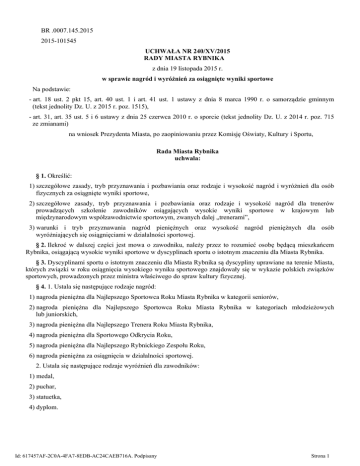 BR .0007.145.2015 2015-101545 UCHWAŁA NR 240/XV/2015 RADY MIASTA RYBNIKA z dnia 19 listopada 2015 r. w sprawie nagród i wyróżnień za osiągnięte wyniki sportowe Na podstawie: - art. 18 ust. 2 pkt 15, art. 40 ust. 1 i art. 41 ust. 1 ustawy z dnia 8 marca 1990 r. o samorządzie gminnym (tekst jednolity Dz. U. z 2015 r. poz. 1515), - art. 31, art. 35 ust. 5 i 6 ustawy z dnia 25 czerwca 2010 r. o sporcie (tekst jednolity Dz. U. z 2014 r. poz. 715 ze zmianami) na wniosek Prezydenta Miasta, po zaopiniowaniu przez Komisję Oświaty, Kultury i Sportu, Rada Miasta Rybnika uchwala: § 1. Określić: 1) szczegółowe zasady, tryb przyznawania i pozbawiania oraz rodzaje i wysokość nagród i wyróżnień dla osób fizycznych za osiągnięte wyniki sportowe, 2) szczegółowe zasady, tryb przyznawania i pozbawiania oraz rodzaje i wysokość nagród dla trenerów prowadzących szkolenie zawodników osiągających wysokie wyniki sportowe w krajowym lub międzynarodowym współzawodnictwie sportowym, zwanych dalej „trenerami”, 3) warunki i tryb przyznawania nagród pieniężnych oraz wysokość nagród pieniężnych dla osób wyróżniających się osiągnięciami w działalności sportowej. § 2. Ilekroć w dalszej części jest mowa o zawodniku, należy przez to rozumieć osobę będącą mieszkańcem Rybnika, osiągającą wysokie wyniki sportowe w dyscyplinach sportu o istotnym znaczeniu dla Miasta Rybnika. § 3. Dyscyplinami sportu o istotnym znaczeniu dla Miasta Rybnika są dyscypliny uprawiane na terenie Miasta, których związki w roku osiągnięcia wysokiego wyniku sportowego znajdowały się w wykazie polskich związków sportowych, prowadzonych przez ministra właściwego do spraw kultury fizycznej. § 4. 1. Ustala się następujące rodzaje nagród: 1) nagroda pieniężna dla Najlepszego Sportowca Roku Miasta Rybnika w kategorii seniorów, 2) nagroda pieniężna dla Najlepszego Sportowca Roku Miasta Rybnika w kategoriach młodzieżowych lub juniorskich, 3) nagroda pieniężna dla Najlepszego Trenera Roku Miasta Rybnika, 4) nagroda pieniężna dla Sportowego Odkrycia Roku, 5) nagroda pieniężna dla Najlepszego Rybnickiego Zespołu Roku, 6) nagroda pieniężna za osiągnięcia w działalności sportowej. 2. Ustala się następujące rodzaje wyróżnień dla zawodników: 1) medal, 2) puchar, 3) statuetka, 4) dyplom. Id: 617457AF-2C0A-4FA7-8EDB-AC24CAEB716A. Podpisany Strona 1 § 5. 1. Wyróżnienia dla zawodników oraz nagrody pieniężne za osiągnięcia w działalności sportowej przyznaje Prezydent Miasta z własnej inicjatywy lub na wniosek, o którym mowa w § 8. 2. Wyróżnienia mogą być przyznane zawodnikom za wysokie wyniki sportowe indywidualne lub drużynowe osiągnięte w dyscyplinach sportu, o których mowa w § 3, przy czym liczba zawodników zgłoszonych do wyróżnienia w grach zespołowych nie może przekroczyć liczby zawodników uprawnionych do gry w dniu osiągnięcia wysokiego wyniku sportowego. 3. Za wysokie wyniki sportowe uznaje się: 1) miejsca I - VIII w mistrzostwach świata, igrzyskach olimpijskich, igrzyskach paraolimpijskich, igrzyskach głuchych, 2) miejsca I - V we współzawodnictwie sportowym na szczeblu międzynarodowym (mistrzostwa Europy, Puchar Świata, Puchar Europy, Światowe Igrzyska Olimpiad Specjalnych, Europejskie Igrzyska Olimpiad Specjalnych), 3) miejsca I - III we współzawodnictwie sportowym na szczeblu krajowym (mistrzostwa Polski, Ogólnopolska Olimpiada Młodzieży, ogólnopolskie Igrzyska Olimpiad Specjalnych). 4. W przypadku osiągnięcia przez zawodnika więcej niż jednego wysokiego wyniku sportowego w danym roku, zawodnik może otrzymać tylko jedno wyróżnienie za najwyższy wynik sportowy. § 6. 1. Nagrody, o których mowa w § 4 ust. 1 pkt 1-5, przyznaje kapituła, którą powołuje Prezydent Miasta. 2. Kapitule przewodniczy Prezydent Miasta. 3. Nagrody przyznawane są na wniosek, o którym mowa w § 8. 4. Podejmując decyzję w sprawie przyznania nagród, kapituła weźmie pod uwagę: 1) wyniki sportowe, osiągnięte przez zawodnika/ów w roku poprzedzającym przyznanie nagrody, 2) rodzaj dyscypliny sportu uprawianej przez zawodnika/ów, 3) znaczenie osiągniętego wyniku sportowego dla promocji Miasta Rybnika w kraju i za granicą. § 7. Ustala się następującą wysokość nagród pieniężnych: 1) nagroda pieniężna dla Najlepszego Sportowca Roku Miasta Rybnika w kategorii seniorów – do 10.000 zł, 2) nagroda pieniężna dla Najlepszego Sportowca Roku Miasta Rybnika w kategoriach młodzieżowych lub juniorskich – do 5.000 zł 3) nagroda pieniężna dla Najlepszego Trenera Roku Miasta Rybnika – do 8.000 zł, 4) nagroda pieniężna dla Sportowego Odkrycia Roku – do 5.000 zł, 5) nagroda pieniężna dla Najlepszego Rybnickiego Zespołu Roku – do 15.000 zł, 6) nagroda pieniężna za osiągnięcia w działalności sportowej – do 5.000 zł. § 8. 1. Wniosek o przyznanie nagrody lub wyróżnienia dla zawodnika/ów składa: 1) klub sportowy zrzeszający zawodnika/ów w dniu osiągnięcia wysokiego wyniku sportowego, 2) zawodnik (lub rodzic/opiekun prawny w przypadku zawodnika niepełnoletniego lub niemającego zdolności do czynności prawnych), 3) Rybnicka Rada Sportu. 2. Wniosek o przyznanie nagrody dla trenera składa: 1) klub zrzeszający zawodnika w dniu osiągnięcia wysokiego wyniku sportowego, do którego przyczynił się trener, 2) trener, 3) Rybnicka Rada Sportu. 3. Wniosek o przyznanie nagrody za osiągnięcia w działalności sportowej składa: 1) osoba wyróżniająca się osiągnięciami w działalności sportowej, Id: 617457AF-2C0A-4FA7-8EDB-AC24CAEB716A. Podpisany Strona 2 2) przedstawiciele lokalnej prasy, radia i telewizji oraz portali internetowych, 3) Rybnicka Rada Sportu. 4. Wniosek, o którym mowa w ust. 1-3, powinien zawierać: 1) imię i nazwisko, adres zamieszkania, miejsce i datę urodzenia kandydata do nagrody/wyróżnienia, 2) wskazanie dyscypliny sportu oraz kategorii wiekowej zawod