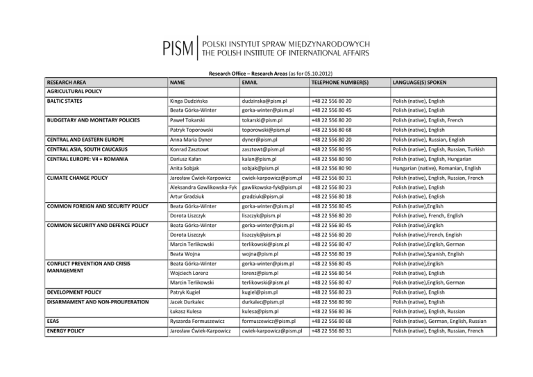 Research Office – Research Areas (as for 05.10.2012) RESEARCH AREA NAME EMAIL TELEPHONE NUMBER(S) LANGUAGE(S) SPOKEN Kinga Dudzińska [email protected] +48 22 556 80 20 Polish (native), English Beata Górka-Winter [email protected] +48 22 556 80 45 Polish (native), English Paweł Tokarski [email protected] +48 22 556 80 20 Polish (native), English, French Patryk Toporowski [email protected] +48 22 556 80 68 Polish (native), English CENTRAL AND EASTERN EUROPE Anna Maria Dyner [email protected] +48 22 556 80 20 Polish (native), Russian, English CENTRAL ASIA, SOUTH CAUCASUS Konrad Zasztowt [email protected] +48 22 556 80 95 Polish (native), English, Russian, Turkish CENTRAL EUROPE: V4 + ROMANIA Dariusz Kałan [email protected] +48 22 556 80 90 Polish (native), English, Hungarian Anita Sobjak [email protected] +48 22 556 80 90 Hungarian (native), Romanian, English Jarosław Ćwiek-Karpowicz [email protected] +48 22 556 80 31 Polish (native), English, Russian, French Aleksandra Gawlikowska-Fyk [email protected] +48 22 556 80 23 Polish (native), English Artur Gradziuk [email protected] +48 22 556 80 18 Polish (native), English Beata Górka-Winter [email protected] +48 22 556 80 45 Polish (native),English Dorota Liszczyk [email protected] +48 22 556 80 20 Polish (native), French, English Beata Górka-Winter [email protected] +48 22 556 80 45 Polish (native),English Dorota Liszczyk [email protected] +48 22 556 80 20 Polish (native),French, English Marcin Terlikowski [email protected] +48 22 556 80 47 Polish (native),English, German Beata Wojna [email protected] +48 22 556 80 19 Polish (native),Spanish, English Beata Górka-Winter [email protected] +48 22 556 80 45 Polish (native),English Wojciech Lorenz [email protected] +48 22 556 80 54 Polish (native), English Marcin Terlikowski [email protected] +48 22 556 80 47 Polish (native),English, German DEVELOPMENT POLICY Patryk Kugiel [email protected] +48 22 556 80 23 Polish (native), English DISARMAMENT AND NON-PROLIFERATION Jacek Durkalec [email protected] +48 22 556 80 90 Polish (native), English Łukasz Kulesa [email protected] +48 22 556 80 36 Polish (native), English, Russian EEAS Ryszarda Formuszewicz [email protected] +48 22 556 80 68 Polish (native), German, English, Russian ENERGY POLICY Jarosław Ćwiek-Karpowicz [email protected] +48 22 556 80 31 Polish (native), English, Russian, French AGRICULTURAL POLICY BALTIC STATES BUDGETARY AND MONETARY POLICIES CLIMATE CHANGE POLICY COMMON FOREIGN AND SECURITY POLICY COMMON SECURITY AND DEFENCE POLICY CONFLICT PREVENTION AND CRISIS MANAGEMENT Aleksandra Gawlikowska-Fyk [email protected] +48 22 556 80 23 Polish (native), English Lidia Puka [email protected] +48 22 556 80 15 Polish (native), English, Norwegian Konrad Zasztowt [email protected] +48 22 556 80 95 Polish (native), English, Russian, Turkish Tomasz Żornaczuk [email protected] +48 22 556 80 22 Polish (native), English, Serbian/Croatian, Slovak, Russian, Ukrainian; sound command of German, French and Turkish EU-MOLDOVA RELATIONS Igor Lyubashenko [email protected] +48 22 556 80 22 Polish, Russian, Ukrainian, English EU-UKRAINE RELATIONS Igor Lyubashenko [email protected] +48 22 556 80 22 Polish, Russian, Ukrainian, English EU AND INTERNATIONAL MACROECONOMICS Paweł Tokarski [email protected] +48 22 556 80 20 Polish (native), English, French ENLARGEMENT POLICY, THE BALKANS, TURKEY Patryk Toporowski [email protected] +48 22 556 80 68 Polish (native), English EU BUDGET AND MULTIANNUAL FINANCIAL FRAMEWORK Patryk Toporowski [email protected] +48 22 556 80 68 Polish (native), English EU DEMOCRATISATION POLICY Kinga Brudzińska [email protected] +48 22 556 80 95 Polish (native), English, Spanish EU JUSTICE AND HOME AFFAIRS Roderick Parkes [email protected] +48 22 556 80 64 English (native), German EU POLITICS AND INSTITUTIONS Agata Gostyńska [email protected] +48 22 556 80 68 Polish (native), English Artur Gradziuk [email protected] +48 22 556 80 18 Polish (native), English Patryk Kugiel [email protected] +48 22 556 80 23 Polish (native), English Lidia Puka (exclusively EUIndia in energy sector) [email protected] +48 22 556 80 15 Polish (native), English, Norwegian Justyna Szczudlik-Tatar [email protected] +48 22 556 80 23 Polish (native), English, Chinese Bartłomiej Znojek [email protected] +48 22 556 80 20 Polish (native), Spanish, English, Portuguese EU-RUSSIA RELATIONS Jarosław Ćwiek-Karpowicz [email protected] +48 22 556 80 31 Polish (native), English, Russian, French EU-US RELATIONS Beata Górka-Winter [email protected] +48 22 556 80 45 Polish (native),English Bartosz Wiśniewski [email protected] +48 22 556 80 31 Polish (native),English FRANCE Elżbieta Kaca [email protected] +48 22 556 80 23 Polish (native), English, French, Russian GERMANY Ryszarda Formuszewicz [email protected] +48 22 556 80 68 Polish (native), German, English, Russian Roderick Parkes [email protected] +48 22 556 80 64 English (native), German Marcin Andrzej Piotrowski [email protected] +48 22 556 80 54 Polish (native), English, Russian Kacper Rękawek [email protected] +48 22 556 80 25 Polish (native), English, French EU-AFRICA RELATIONS EU-ASIA RELATIONS, CHINA, INDIA, SOUTH-EAST ASIA EU-LATIN AMERICA RELATIONS EUROPEAN AND GLOBAL GOVERNANCE FINANCIAL MARKETS AND REGULATION HUMAN SECURITY AND TERRORISM Rafał Tarnogórski [email protected] +48 22 556 80 64 Polish (native), English Rafał Tarnogórski [email protected] +48 22 556 80 64 Polish (native), English Kinga Brudzińska [email protected] +48 22 556 80 95 Polish (native), English, Spanish Bartłomiej Znojek [email protected] +48 22 556 80 20 MEDITERRANEAN Patrycja Sasnal [email protected] +48 22 556 80 45 Polish (native), Spanish, English, Portuguese Polish (native), English, French, Arabic MIDDLE EAST Marcin Andrzej Piotrowski [email protected] +48 22 556 80 54 Polish (native), English, Russian Patrycja Sasnal [email protected] +48 22 556 80 45 Polish (native), English, French, Arabic Beata Górka-Winter [