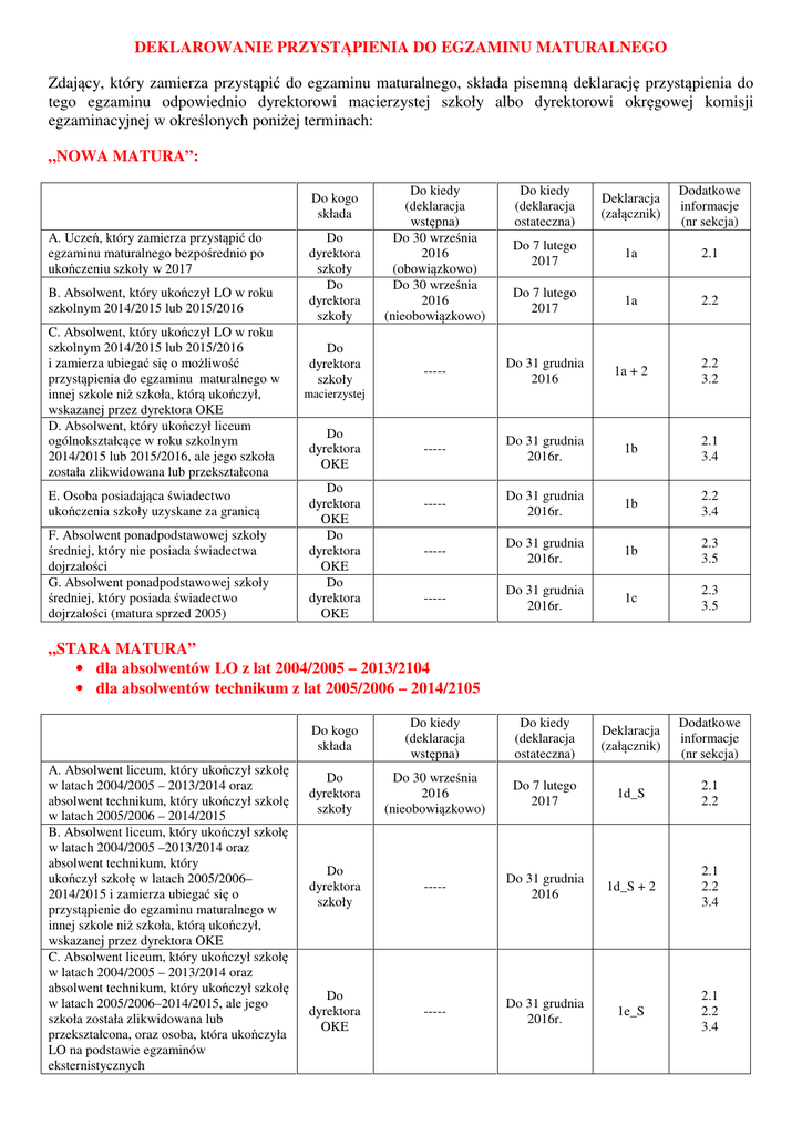 DEKLAROWANIE PRZYSTĄPIENIA DO EGZAMINU MATURALNEGO Zdający, który zamierza przystąpić do egzaminu maturalnego, składa pisemną deklarację przystąpienia do tego egzaminu odpowiednio dyrektorowi macierzystej szkoły albo dyrektorowi okręgowej komisji egzaminacyjnej w określonych poniżej terminach: „NOWA MATURA”: Do kogo składa A. Uczeń, który zamierza przystąpić do egzaminu maturalnego bezpośrednio po ukończeniu szkoły w 2017 B. Absolwent, który ukończył LO w roku szkolnym 2014/2015 lub 2015/2016 C. Absolwent, który ukończył LO w roku szkolnym 2014/2015 lub 2015/2016 i zamierza ubiegać się o możliwość przystąpienia do egzaminu maturalnego w innej szkole niż szkoła, którą ukończył, wskazanej przez dyrektora OKE D. Absolwent, który ukończył liceum ogólnokształcące w roku szkolnym 2014/2015 lub 2015/2016, ale jego szkoła została zlikwidowana lub przekształcona E. Osoba posiadająca świadectwo ukończenia szkoły uzyskane za granicą F. Absolwent ponadpodstawowej szkoły średniej, który nie posiada świadectwa dojrzałości G. Absolwent ponadpodstawowej szkoły średniej, który posiada świadectwo dojrzałości (matura sprzed 2005) Do dyrektora szkoły Do dyrektora szkoły Do dyrektora szkoły Do kiedy (deklaracja wstępna) Do 30 września 2016 (obowiązkowo) Do 30 września 2016 (nieobowiązkowo) Do kiedy (deklaracja ostateczna) Deklaracja (załącznik) Dodatkowe informacje (nr sekcja) Do 7 lutego 2017 1a 2.1 Do 7 lutego 2017 1a 2.2 ----- Do 31 grudnia 2016 1a + 2 2.2 3.2 ----- Do 31 grudnia 2016r. 1b 2.1 3.4 ----- Do 31 grudnia 2016r. 1b 2.2 3.4 ----- Do 31 grudnia 2016r. 1b 2.3 3.5 ----- Do 31 grudnia 2016r. 1c 2.3 3.5 macierzystej Do dyrektora OKE Do dyrektora OKE Do dyrektora OKE Do dyrektora OKE „STARA MATURA” • dla absolwentów LO z lat 2004/2005 – 2013/2104 • dla absolwentów technikum z lat 2005/2006 – 2014/2105 A. Absolwent liceum, który ukończył szkołę w latach 2004/2005 – 2013/2014 oraz absolwent technikum, który ukończył szkołę w latach 2005/2006 – 2014/2015 B. Absolwent liceum, który ukończył szkołę w latach 2004/2005 –2013/2014 oraz absolwent technikum, który ukończył szkołę w latach 2005/2006– 2014/2015 i zamierza ubiegać się o przystąpienie do egzaminu maturalnego w innej szkole niż szkoła, którą ukończył, wskazanej przez dyrektora OKE C. Absolwent liceum, który ukończył szkołę w latach 2004/2005 – 2013/2014 oraz absolwent technikum, który ukończył szkołę w latach 2005/2006–2014/2015, ale jego szkoła została zlikwidowana lub przekształcona, oraz osoba, która ukończyła LO na podstawie egzaminów eksternistycznych Do kogo składa Do kiedy (deklaracja wstępna) Do kiedy (deklaracja ostateczna) Deklaracja (załącznik) Dodatkowe informacje (nr sekcja) Do dyrektora szkoły Do 30 września 2016 (nieobowiązkowo) Do 7 lutego 2017 1d_S 2.1 2.2 Do dyrektora szkoły ----- Do 31 grudnia 2016 1d_S + 2 2.1 2.2 3.4 Do dyrektora OKE ----- Do 31 grudnia 2016r. 1e_S 2.1 2.2 3.4