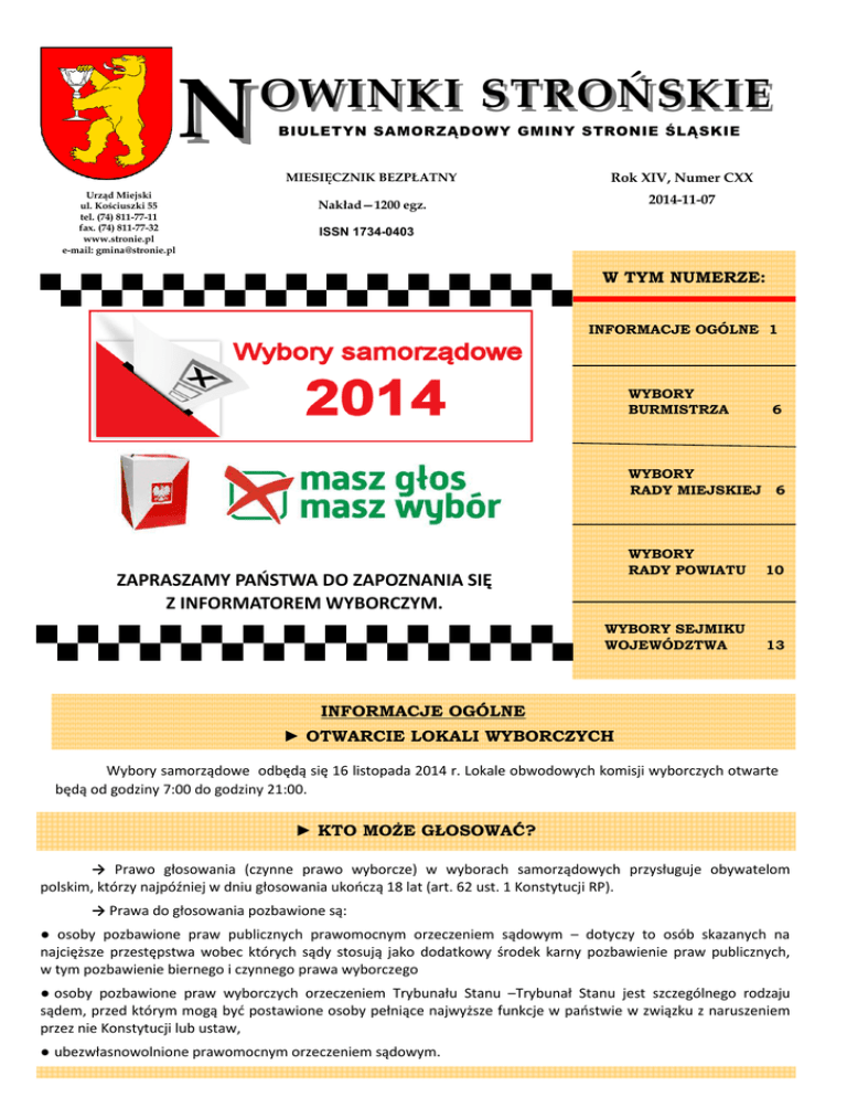 N OWINKI STROŃSKIE Urząd Miejski ul. Kościuszki 55 tel. (74) 811-77-11 fax. (74) 811-77-32 www.stronie.pl e-mail: [email protected] BIULETYN SAMORZĄDOWY GMINY STRONIE ŚLĄSKIE MIESIĘCZNIK BEZPŁATNY Rok XIV, Numer CXX Nakład—1200 egz. 2014-11-07 ISSN 1734-0403 W TYM NUMERZE: INFORMACJE OGÓLNE 1 WYBORY BURMISTRZA 6 WYBORY RADY MIEJSKIEJ 6 WYBORY RADY POWIATU 10 WYBORY SEJMIKU WOJEWÓDZTWA 13 ZAPRASZAMY PAŃSTWA DO ZAPOZNANIA SIĘ Z INFORMATOREM WYBORCZYM. INFORMACJE OGÓLNE ► OTWARCIE LOKALI WYBORCZYCH Wybory samorządowe odbędą się 16 listopada 2014 r. Lokale obwodowych komisji wyborczych otwarte będą od godziny 7:00 do godziny 21:00. ► KTO MOŻE GŁOSOWAĆ? → Prawo głosowania (czynne prawo wyborcze) w wyborach samorządowych przysługuje obywatelom polskim, którzy najpóźniej w dniu głosowania ukończą 18 lat (art. 62 ust. 1 Konstytucji RP). → Prawa do głosowania pozbawione są: ● osoby pozbawione praw publicznych prawomocnym orzeczeniem sądowym – dotyczy to osób skazanych na najcięższe przestępstwa wobec których sądy stosują jako dodatkowy środek karny pozbawienie praw publicznych, w tym pozbawienie biernego i czynnego prawa wyborczego ● osoby pozbawione praw wyborczych orzeczeniem Trybunału Stanu –Trybunał Stanu jest szczególnego rodzaju sądem, przed którym mogą być postawione osoby pełniące najwyższe funkcje w państwie w związku z naruszeniem przez nie Konstytucji lub ustaw, ● ubezwłasnowolnione prawomocnym orzeczeniem sądowym. STR. 2 Rok XIV, Numer CXX MIEJSKA KOMISJA WYBORCZA SKŁAD MIEJSKIEJ KOMISJI WYBORCZEJ W STRONIU ŚLĄSKIM 1 2 3 4 5 6 7 Zbigniew Wodzyński - Przewodniczący Komisji Paweł Andrzej Gancarz - Zastępca Przewodniczącego Komisji Janusz Grudkowski - Członek Komisji Bogusław Józef Lamch - Członek Komisji Iwona Jadwiga Rentflejsz - Członek Komisji Joanna Sadowska - Członek Komisji Eugeniusz Załucki - Członek Komisji Siedziba Miejskiej Komisji Wyborczej w Stroniu Śląskim znajduje się w Urzędzie Miejskim w Stroniu Śląskim przy ul. Kościuszki 55 (pok. nr 17, I piętro) tel. 74 811 77 39 ZADANIA MIEJSKIEJ KOMISJI WYBORCZEJ Do zadań Miejskiej Komisji Wyborczej w Stroniu Śląskim należy: • • • • • • • rejestrowanie kandydatów na radnych; zarządzanie druku obwieszczeń wyborczych i podanie ich do publicznej wiadomości w trybie określonym w ustawie; zarządzanie druku kart do głosowania i ich dostarczania obwodowym komisjom wyborczym; rozpatrywanie skarg na działalność obwodowych komisji wyborczych; ustalenie wyników głosowania na Burmistrza Stronia Śląskiego i wyników wyborów do Rady Miejskiej Stronia Śląskiego i ogłoszenie ich w trybie określonym niniejszą ustawą; przesłanie wyników głosowania i wyników wyborów komisarzowi wyborczemu; wykonywanie innych czynności określonych w ustawie lub zleconych przez komisarza wyborczego. Urząd Miejski w Stroniu Śląskim ul. Kościuszki 55, 57-550 Stronie Śląskie tel. (74) 811-77-11, fax. (74) 811-77-32, www.stronie.pl, e-mail: [email protected] Redaktor naczelny: Agnieszka Szlendak e-mail: [email protected] STR. 3 Rok XIV, Numer CXX OKRĘGI JEDNOMANDATOWE Ustawa z dnia 5 stycznia 2011 r., Kodeks wyborczy (Dz.U. 2011 nr 21 poz. 112) wprowadza diametralne zmiany w zasadach dotyczących wyborów samorządowych. Kodeks określa zasady wyborów m.in.: do organów stanowiących jednostek samorządu terytorialnego (rady gminy i powiatu oraz sejmiku województwa). Radni gmin zostaną wybrani w okręgach jednomandatowych. W danym okręgu można uzyskać wyłącznie jeden mandat – otrzymuje go kandydat, który podczas wyborów otrzymał najwięcej głosów. Pozostali kandydaci nie otrzymują mandatów. ► GDZIE GŁOSOWAĆ? - OBWODY I OKRĘGI GŁOSOWANIA ● Obwód Nr 1 Adres siedziby Ulice Obwodowej Komisji Wyborczej Nr 1 Szkoła Podstawowa w Stroniu Śląskim 57-550 Stronie Śląskie ul. Kościuszki 57 (na parterze) tel. 74 8 141 231 Nr okręgu STRONIE ŚLĄSKIE: KRÓTKA 1, NADBRZEŻNA 2, 2A, SUDECKA 7 STRONIE ŚLĄSKIE: KRÓTKA od 2A do końca, ŻEROMSKIEGO 8 STRONIE ŚLĄSKIE: 40-LECIA PRL 9 Skład Obwodowej Komisji Wyborczej Nr 1: 1. Marian Rogoziński - Przewodniczący 2. Małgorzata Janina Ozga - Zastępca 3. Roman Zbigniew Ozga - Członek 4. Danuta Ewa Gutek - Członek 5. Alina Teresa Gołysz - Członek 6. Agnieszka Urbaniak - Członek 7. Urszula Pruchnicka - Pęcka - Członek 8. Katarzyna Anna Nowak - Członek 9. Marta Paulina Świrta - Członek *zgłoszenia dokonał: KKW Ryszard Wiktor *wskazana przez Burmistrza Stronia Śląskiego *zgłoszenia dokonał: KKW SLD Lewica Razem *zgłoszenia dokonał: KWW Gospodarna Gmina *zgłoszenia dokonał: KWW Barbara Martynowska *zgłoszenia dokonał: KWW Krzysztof Korzun *zgłoszenia dokonał: KW Prawo i Sprawiedliwość *zgłoszenia dokonał: KWW Gmina Przyjazna Mieszkańcom *zgłoszenia dokonał: KWW RAZEM ● Obwód Nr 2 Adres siedziby Obwodowej Komisji Wyborczej Nr 2 Przedszkole Miejskie w Stroniu Śląskim 57-550 Stronie Śląskie ul. Nadbrzeżna 30 Tel. 74 8 141 465 Ulice STRONIE ŚLĄSKIE: NADBRZEŻNA 1A-5 nieparzyste, od 32 do końca, ZIELONA 2-6A parzyste STRONIE ŚLĄSKIE: HUTNICZA, KOŚCIUSZKI 17-19, 22, 26-28, NADBRZEŻNA od 11 do końca nieparzyste, ZIELONA 5 STRONIE ŚLĄSKIE: MICKIEWICZA od 5 do końca, ZIELONA od 7 do końca STRONIE ŚLĄSKIE: MICKIEWICZA 1-3, NADBRZEŻNA 4-30 parzyste Urząd Miejski w Stroniu Śląskim ul. Kościuszki 55, 57-550 Stronie Śląskie tel. (74) 811-77-11, fax. (74) 811-77-32, www.stronie.pl, e-mail: [email protected] Redaktor naczelny: Agnieszka Szlendak e-mail: [email protected] Nr okręgu 3 4 5 6 Rok XIV, Numer CXX STR. 4 Skład Obwodowej Komisji Wyborczej Nr 2: 1. Celina Chęś – Drańczuk - Przewodniczący 2. Henryk Kazimierz Król - Zastępca 3. Sylwia Ewa Miernik - Członek 4. Marzanna Dorota Staszak - Członek 5. Olga Ezeryńska - Członek 6. Urszula Agnieszka Kukla - Członek 7. Danuta Prokop - Członek *wskazana prz